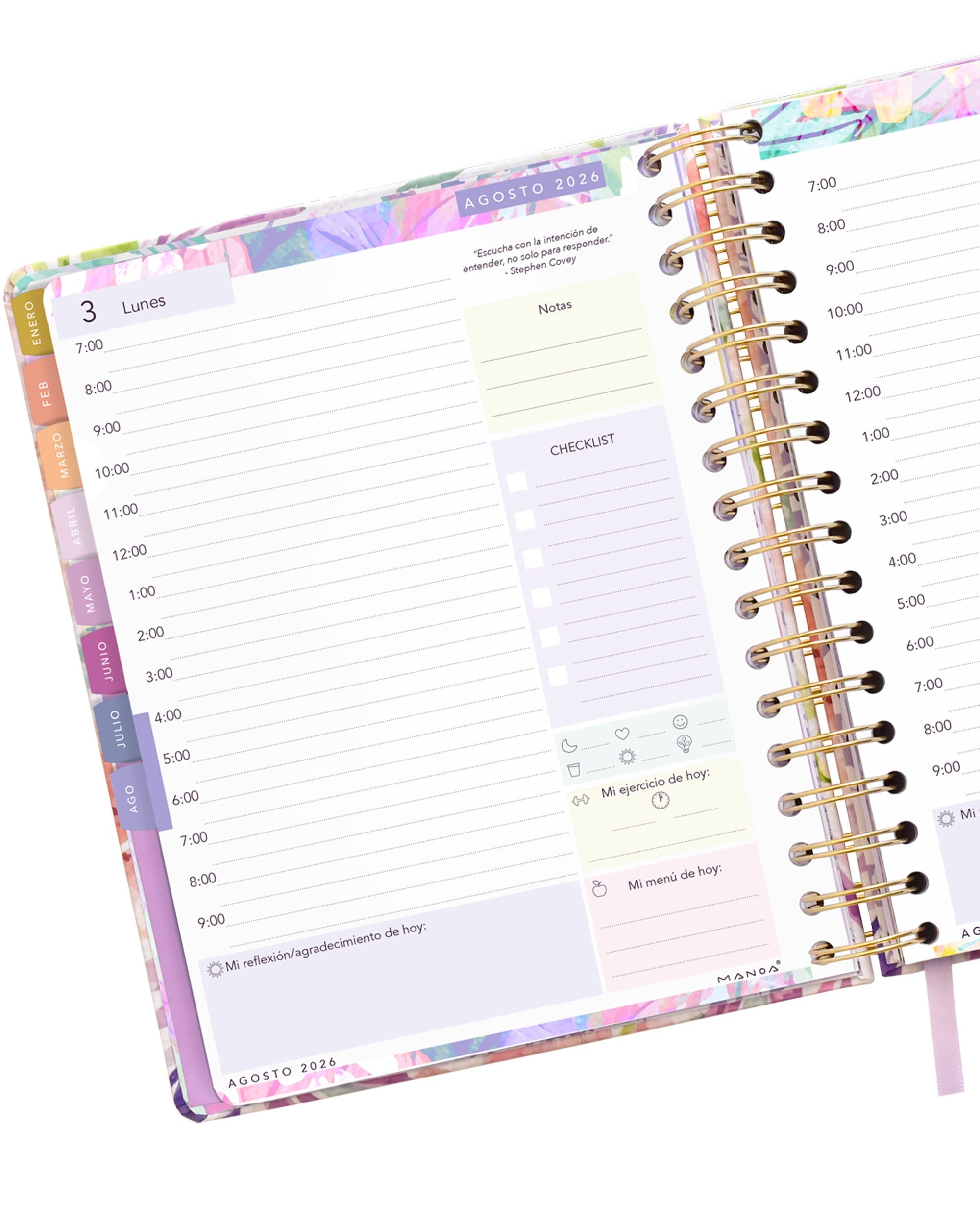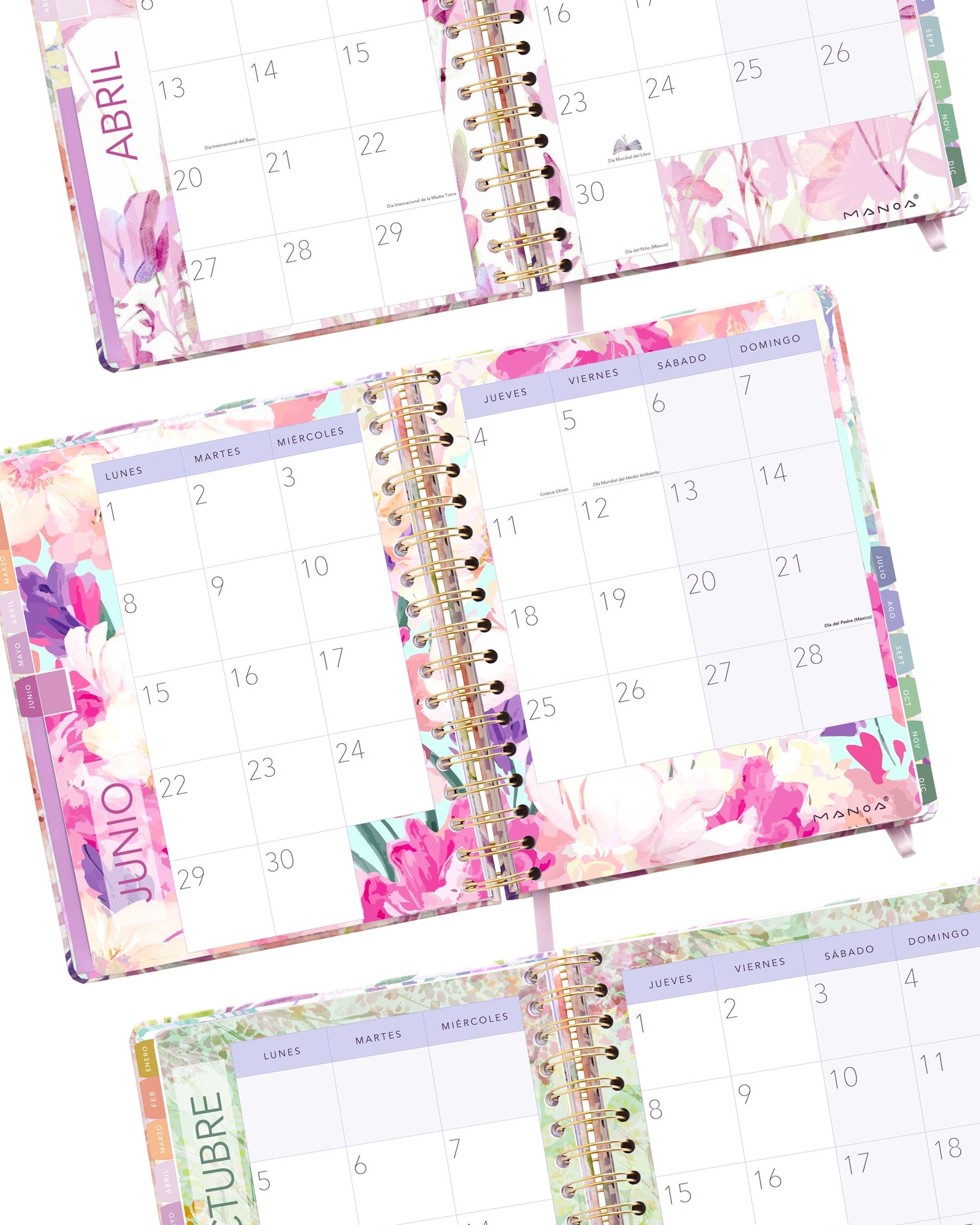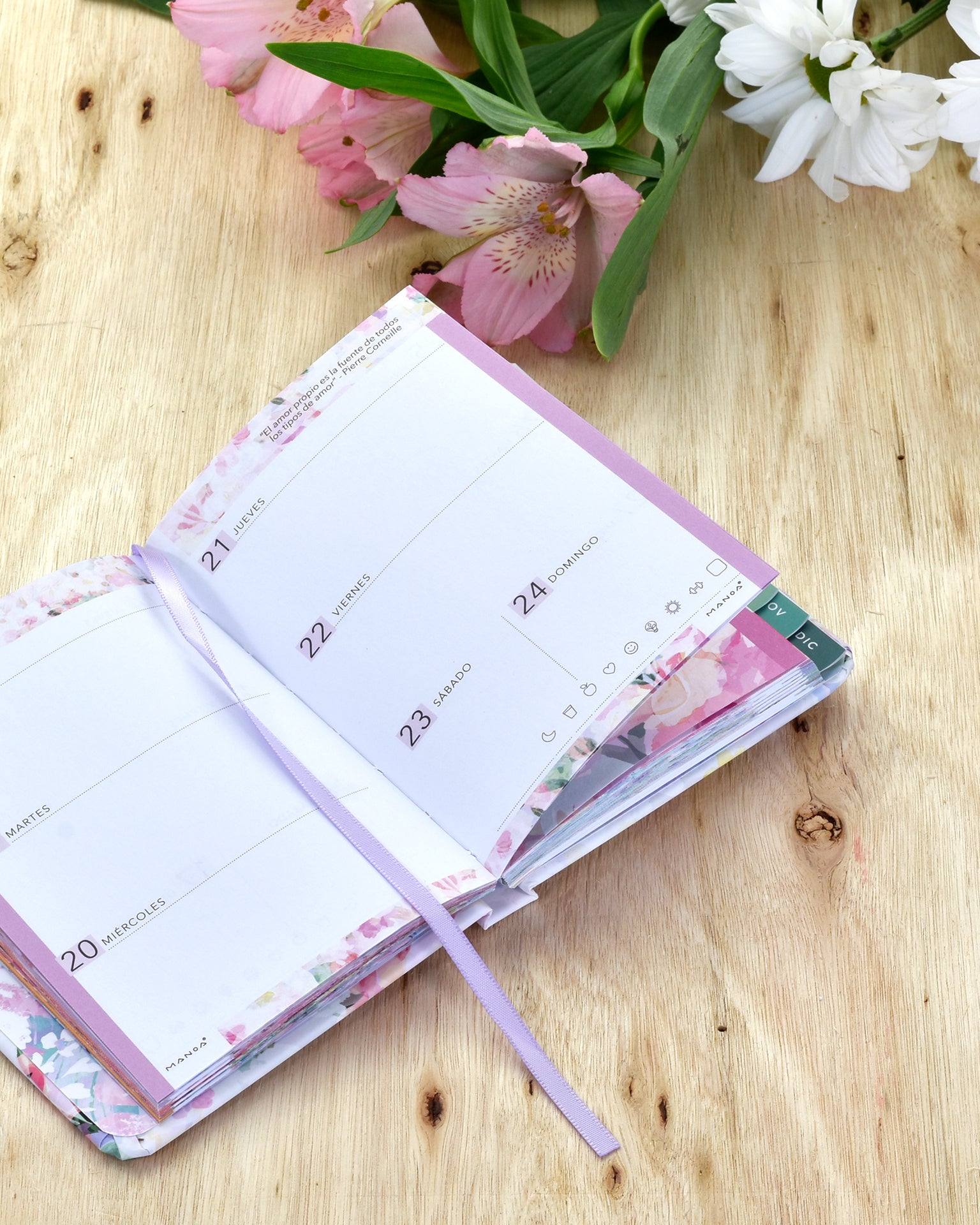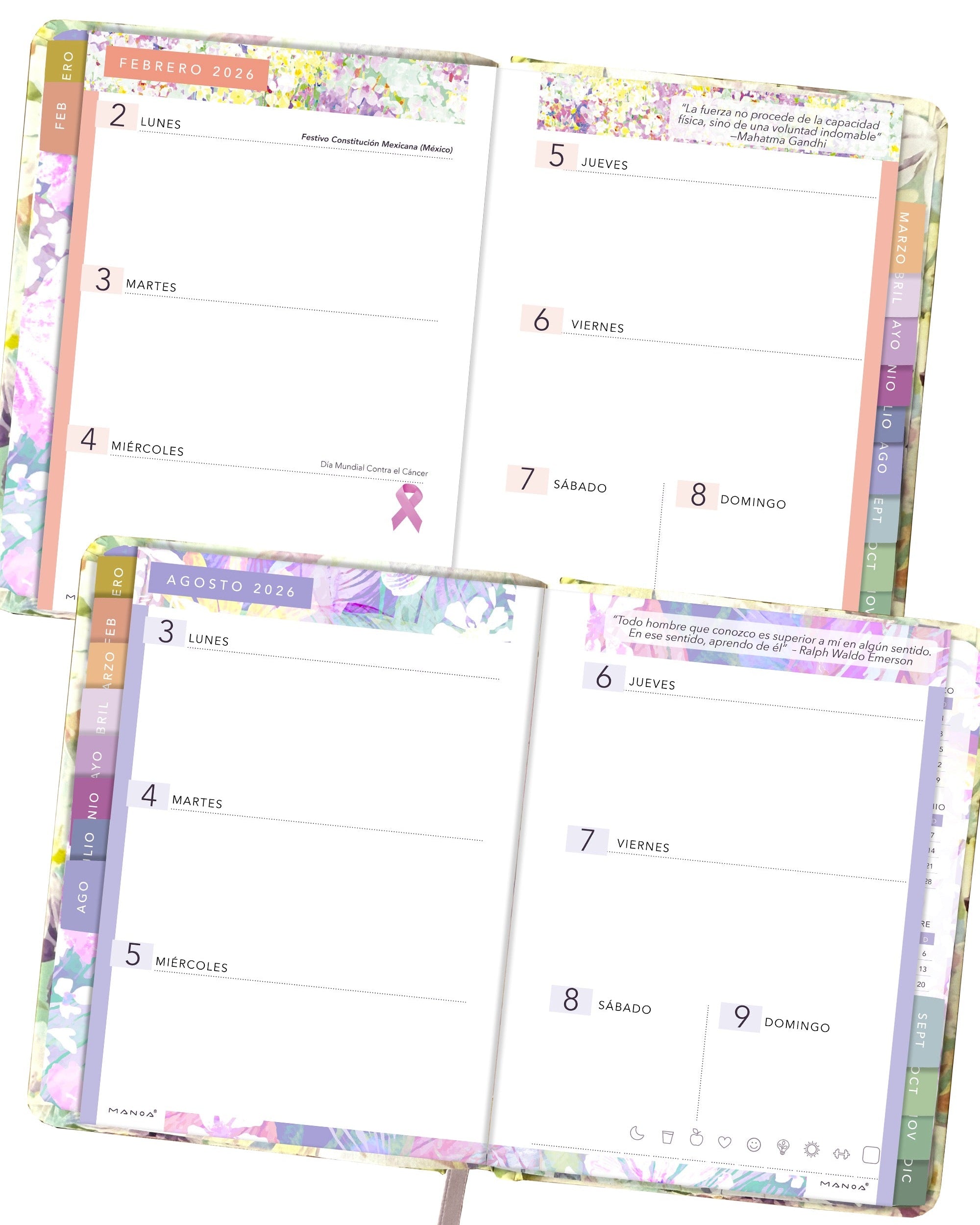 Con la agenda abierta puedes ver la semana completa, son 210 páginas con los días en horizontal, el papel es de máxima calidad y sus páginas están impresas a todo color con diseños y tonos distintos para cada mes.