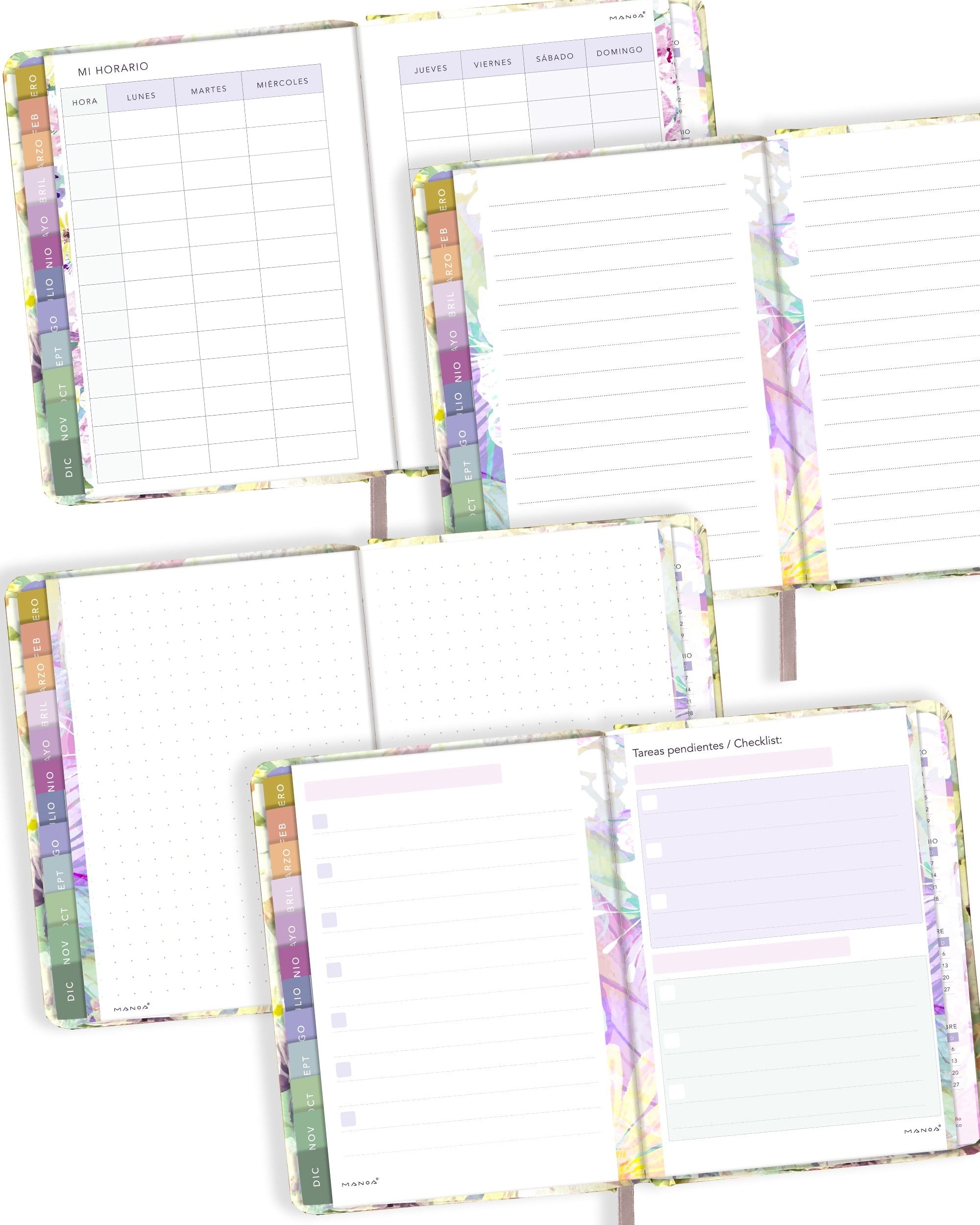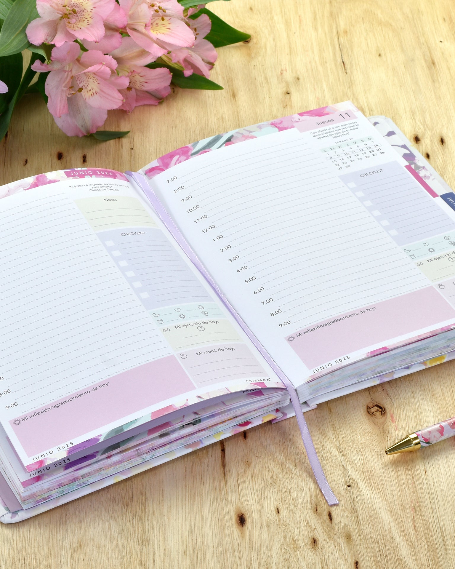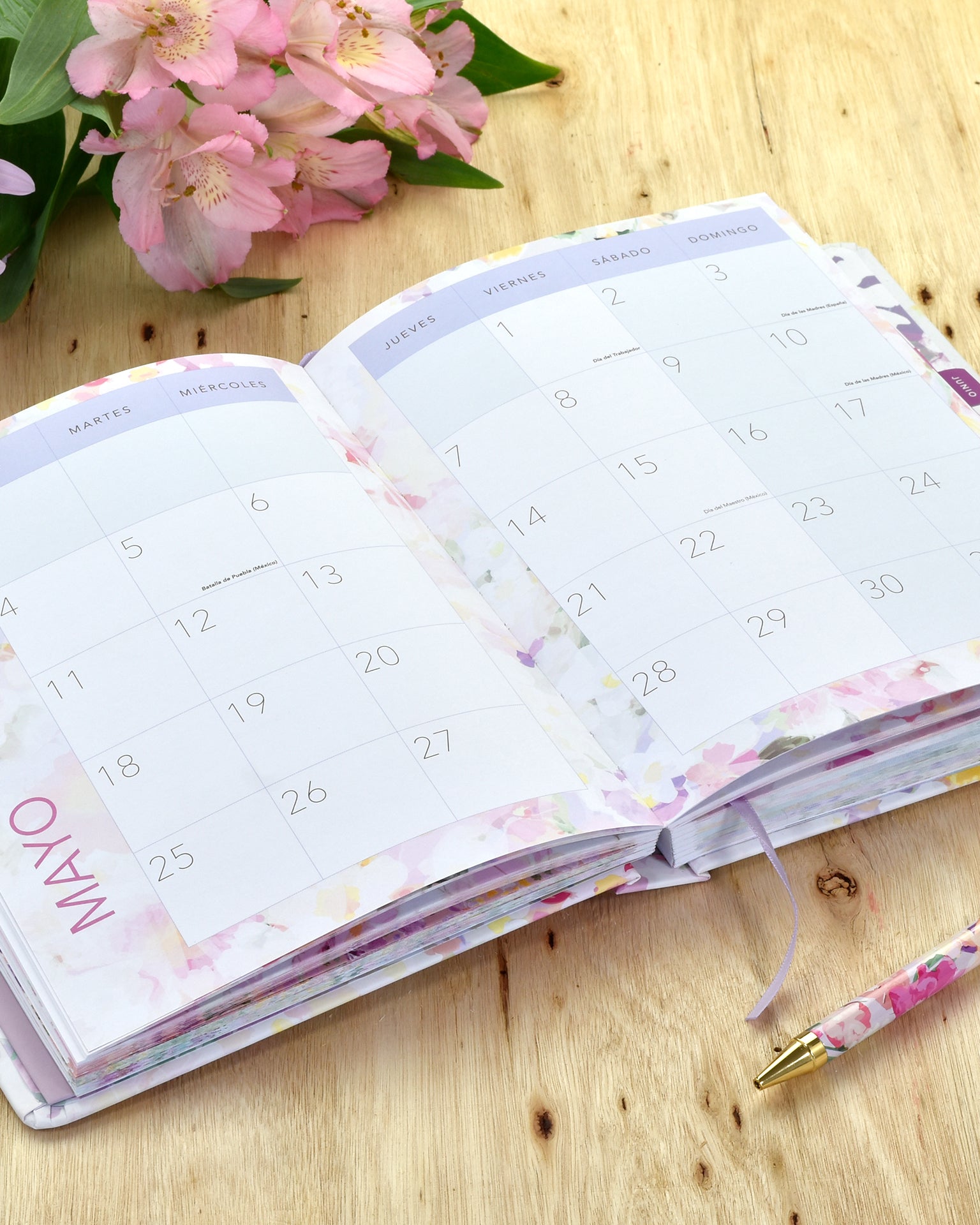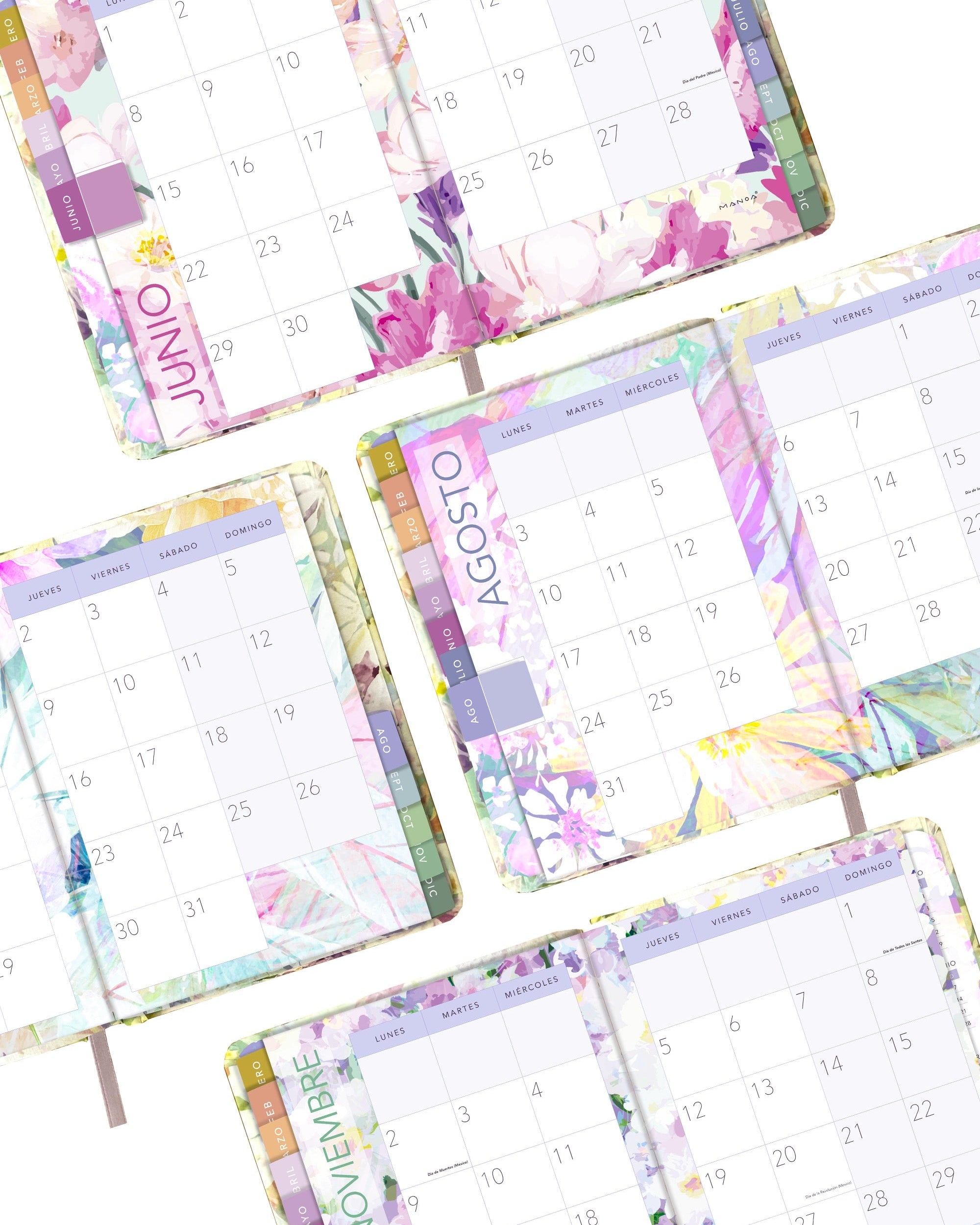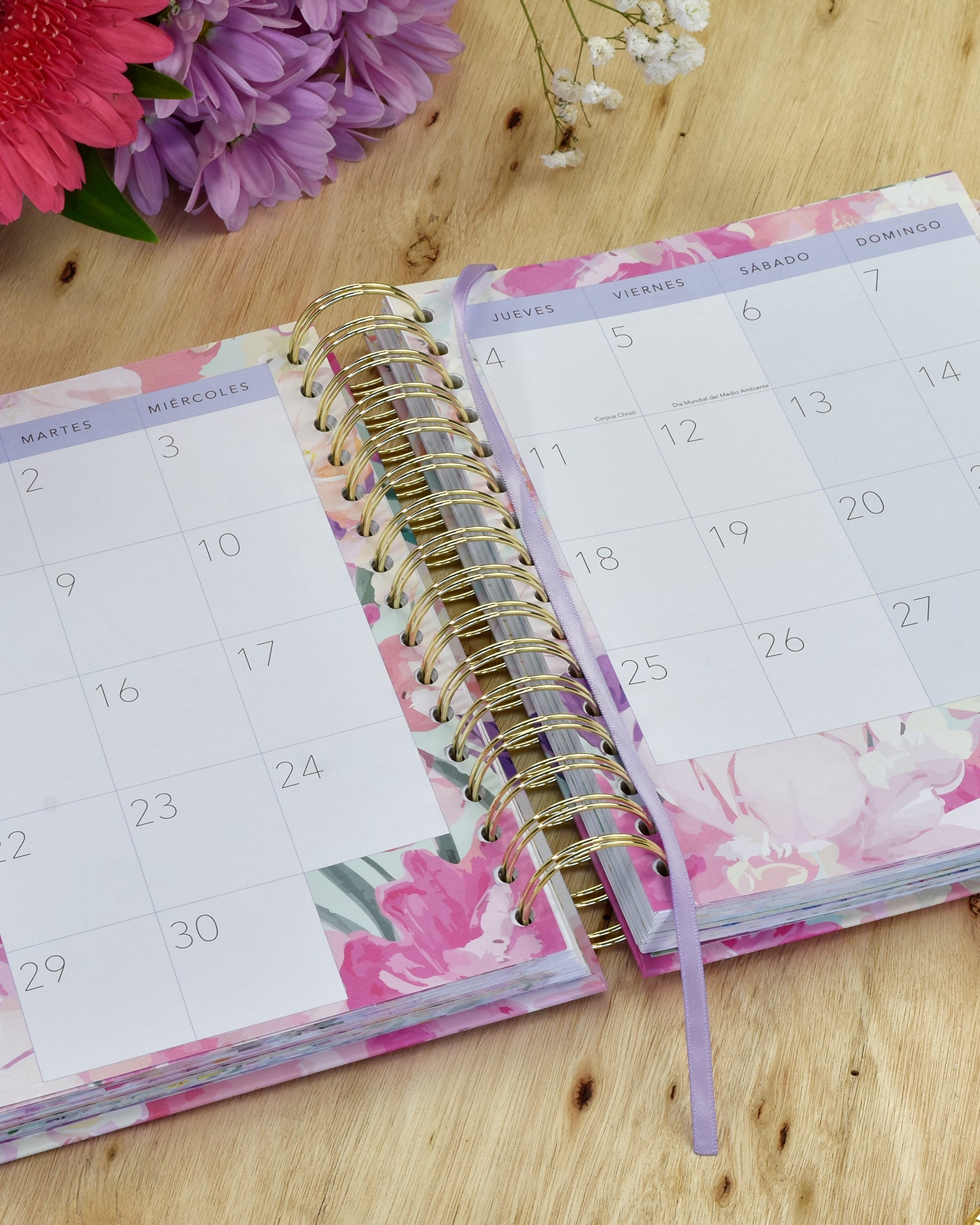 Con la agenda abierta puedes ver la semana completa, son 210 páginas con los días en horizontal, el papel es de máxima calidad y sus páginas están impresas a todo color con diseños y tonos distintos para cada mes.