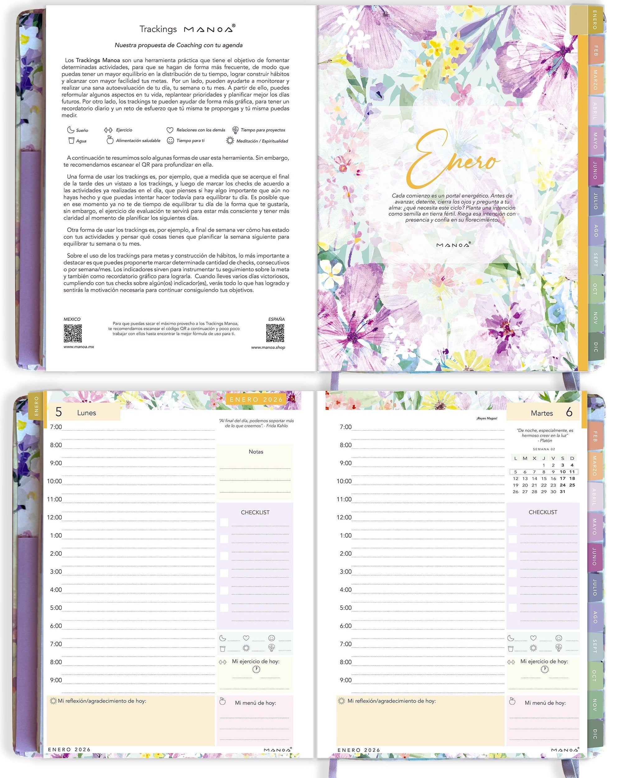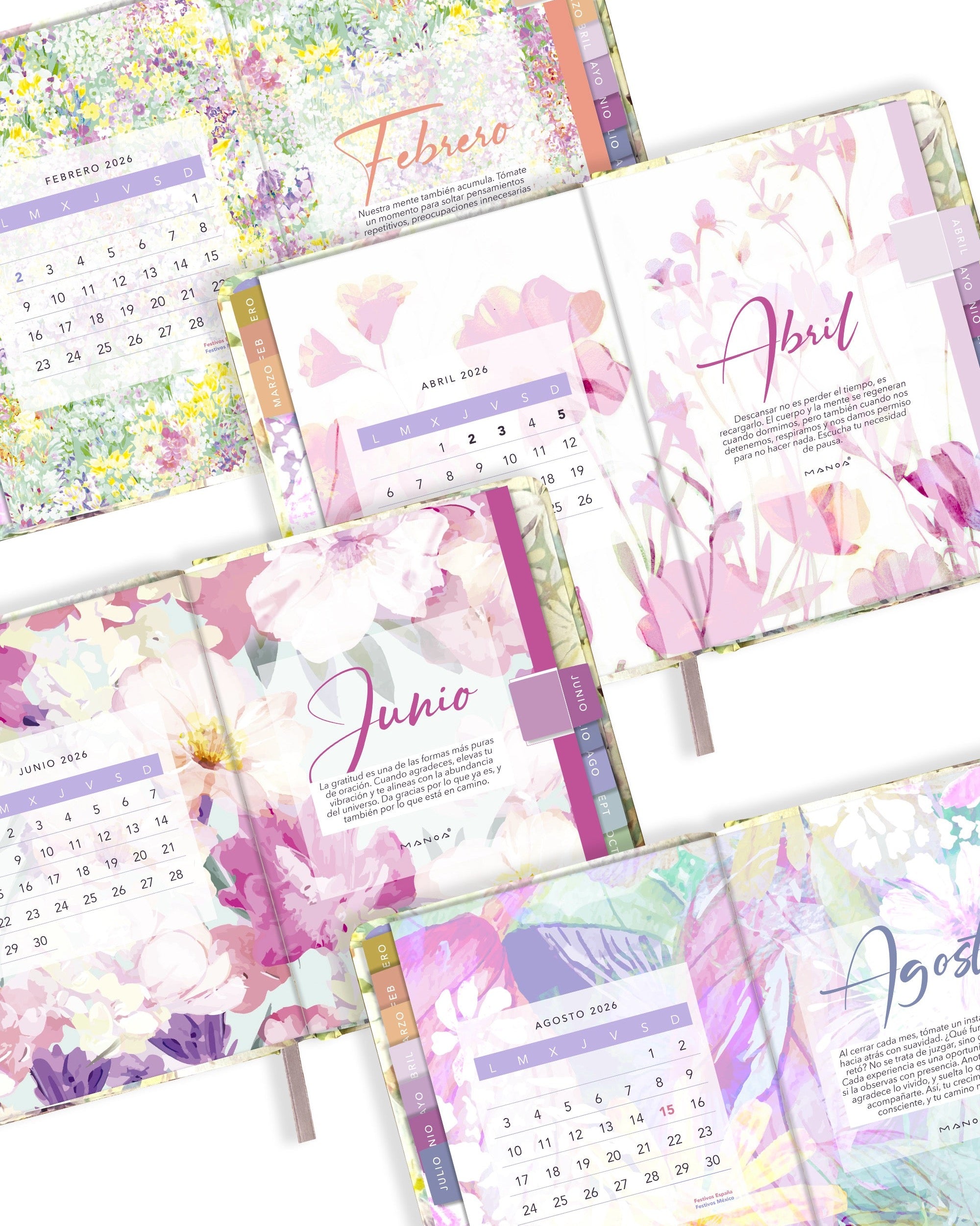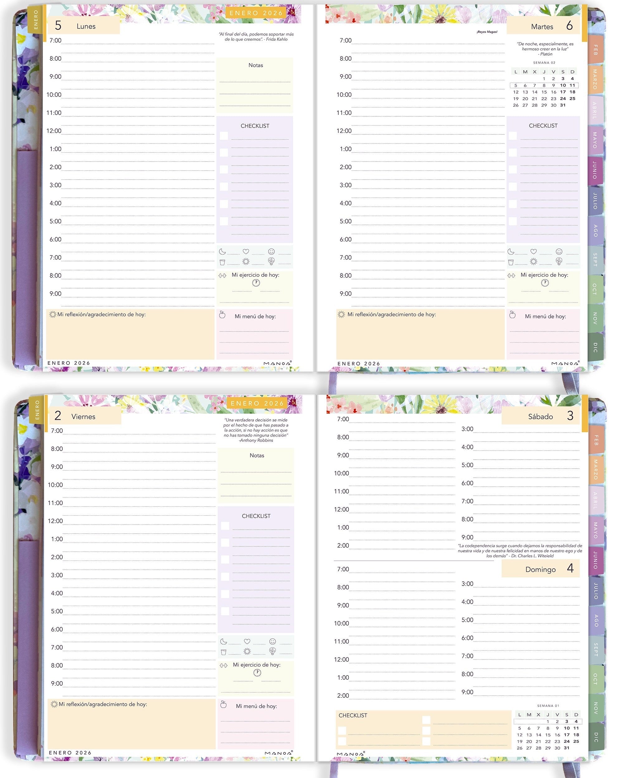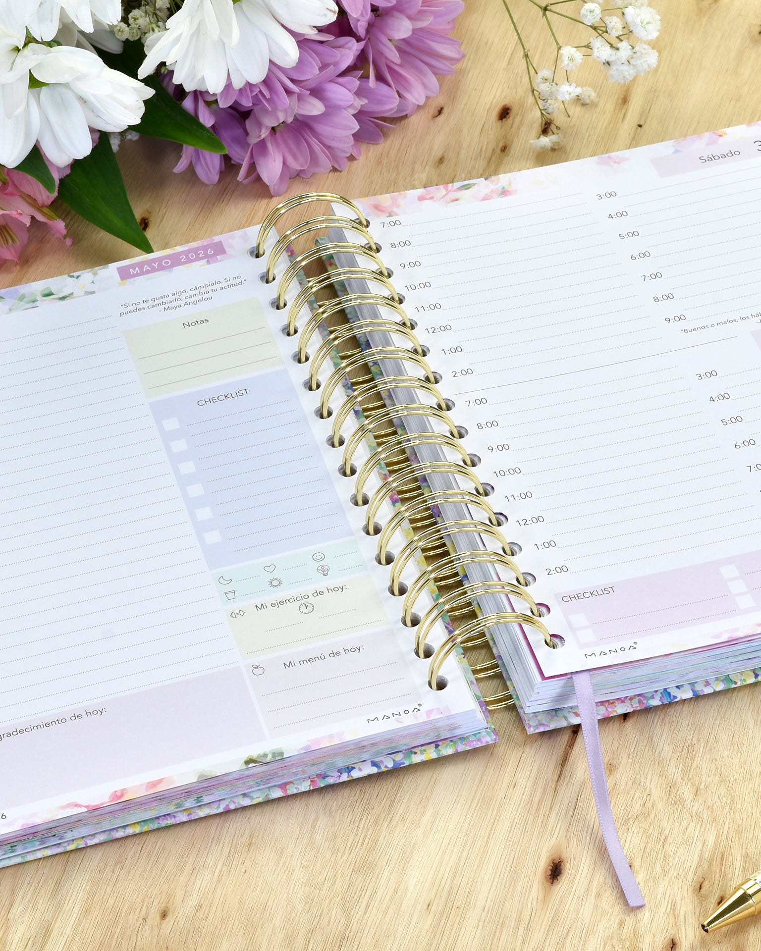 Con la agenda abierta puedes ver la semana completa, son 210 páginas con los días en horizontal, el papel es de máxima calidad y sus páginas están impresas a todo color con diseños y tonos distintos para cada mes.