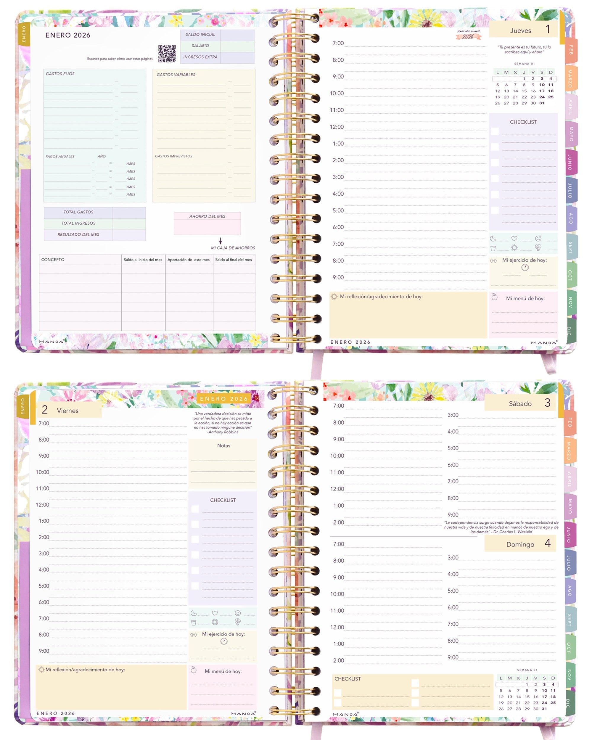 Si necesitas mucho espacio para escribir este formato diario con fechas y horas te encantará. Cada día ocupa toda una página ¡son 380 páginas a todo color! La agenda día por página 2026 ideal para la planificación del día a día. Incluye espacios de checklist diario, frases motivacionales, menú del día y trackings diarios...