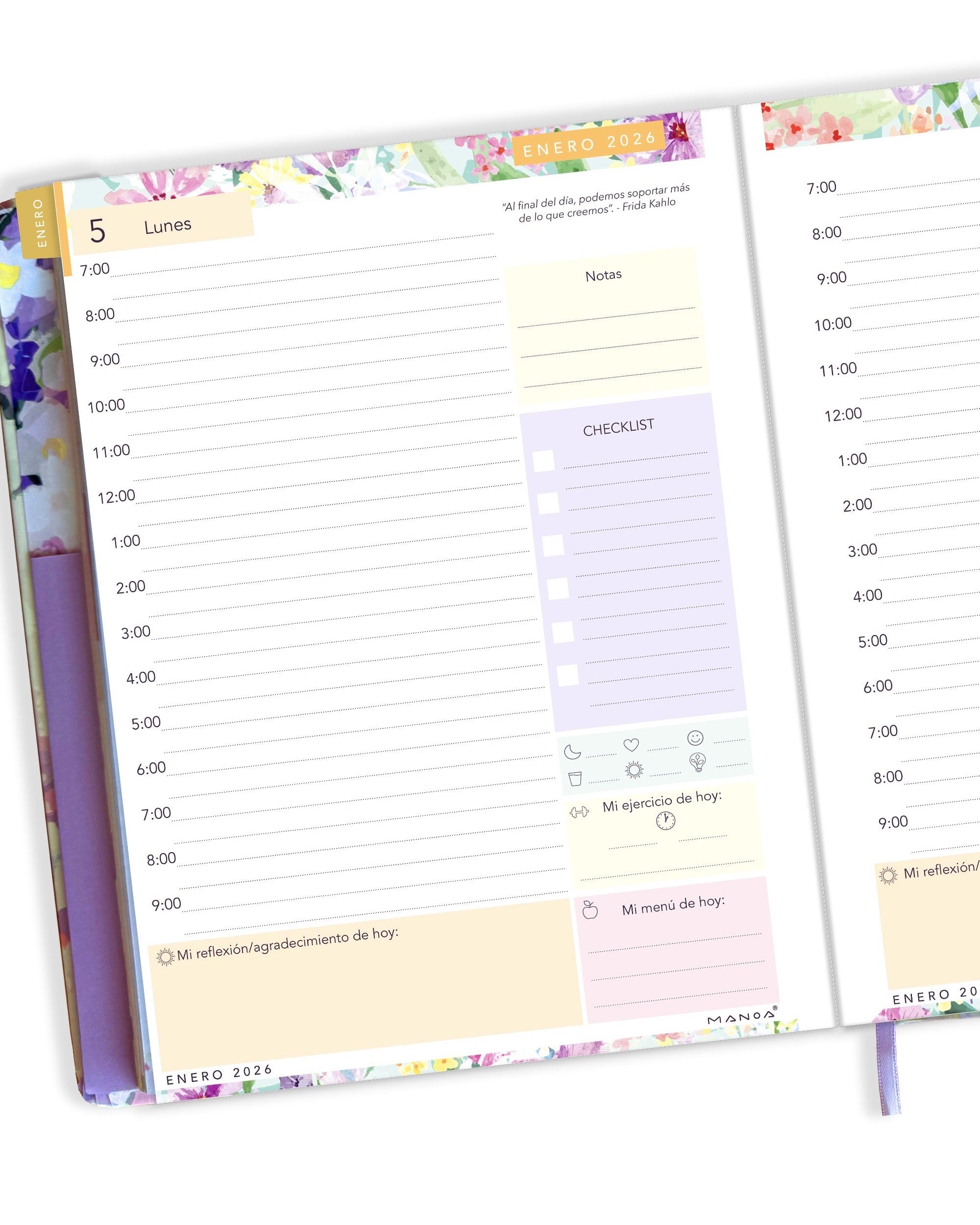 Formato tipo Moleskine, con vista semanal y hoja de Notas.