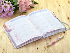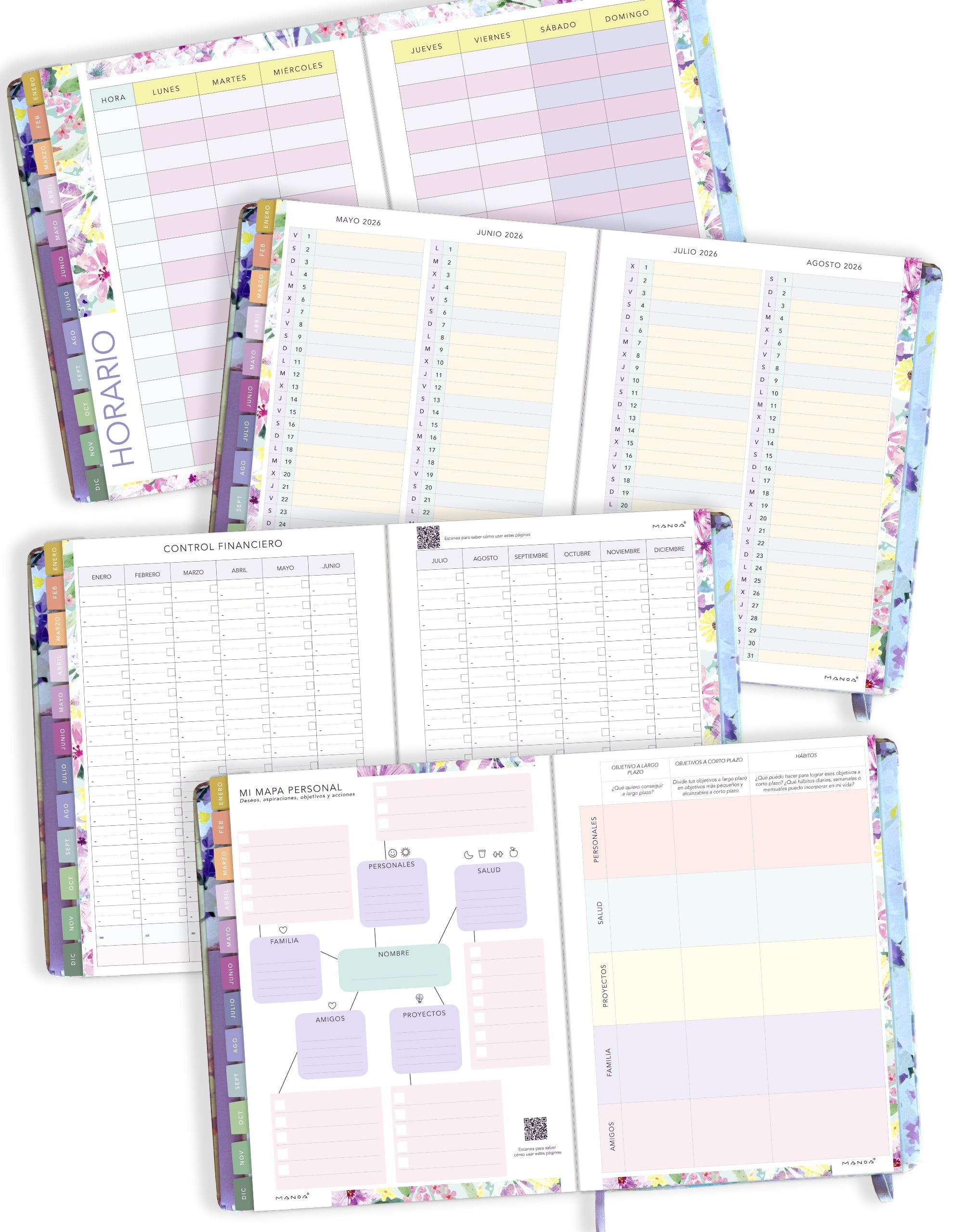 - Incluye hojas de planificación mensual, control financiero, control de gastos e ingresos para cada mes, planning anual en columnas, página de horario, control menstrual, contraseñas y mapa de objetivos.