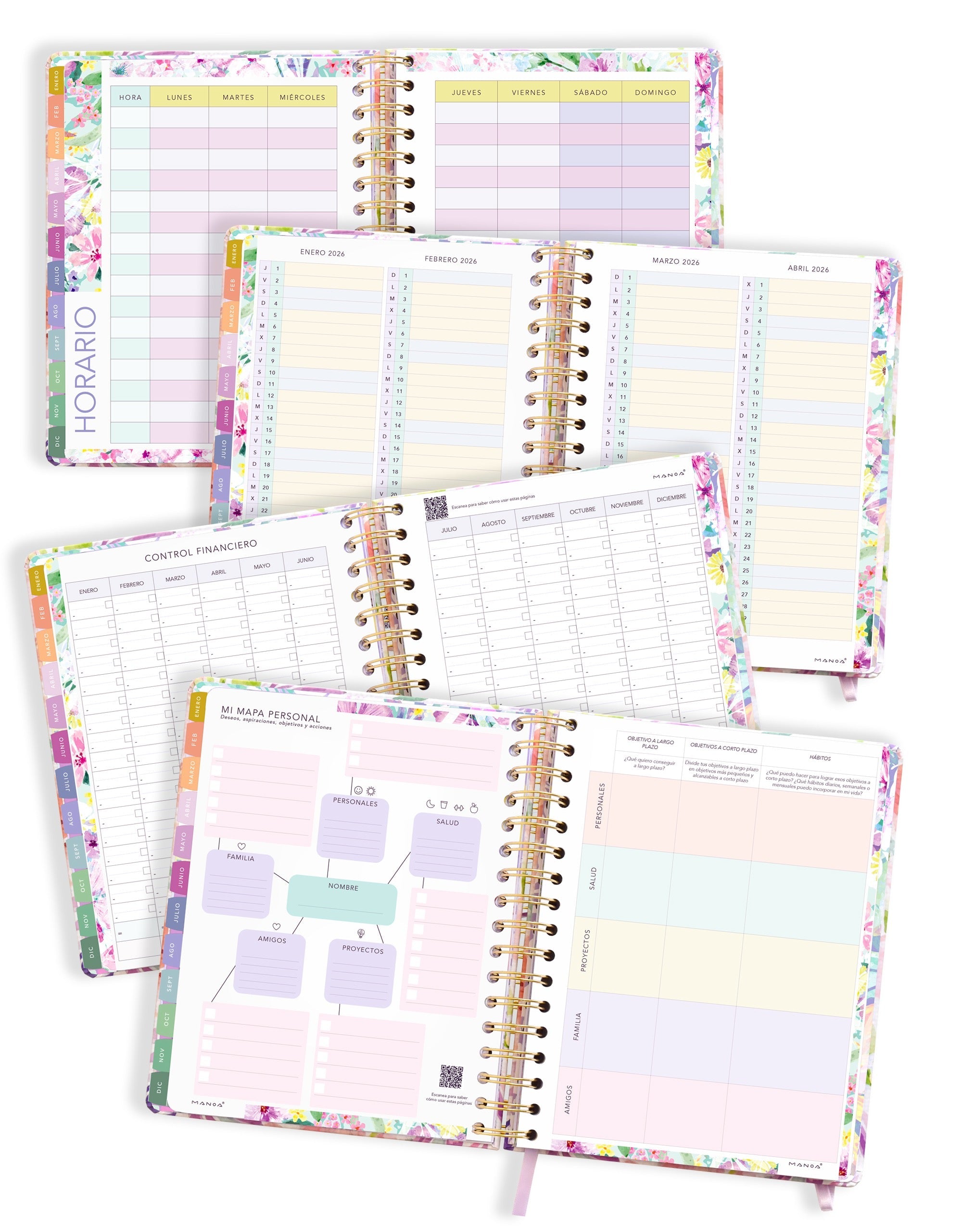 • Incluye hojas de planificación mensual, control financiero, control de gastos e ingresos para cada mes, planning anual en columnas, página de horario, control menstrual, contraseñas y mapa de objetivos.