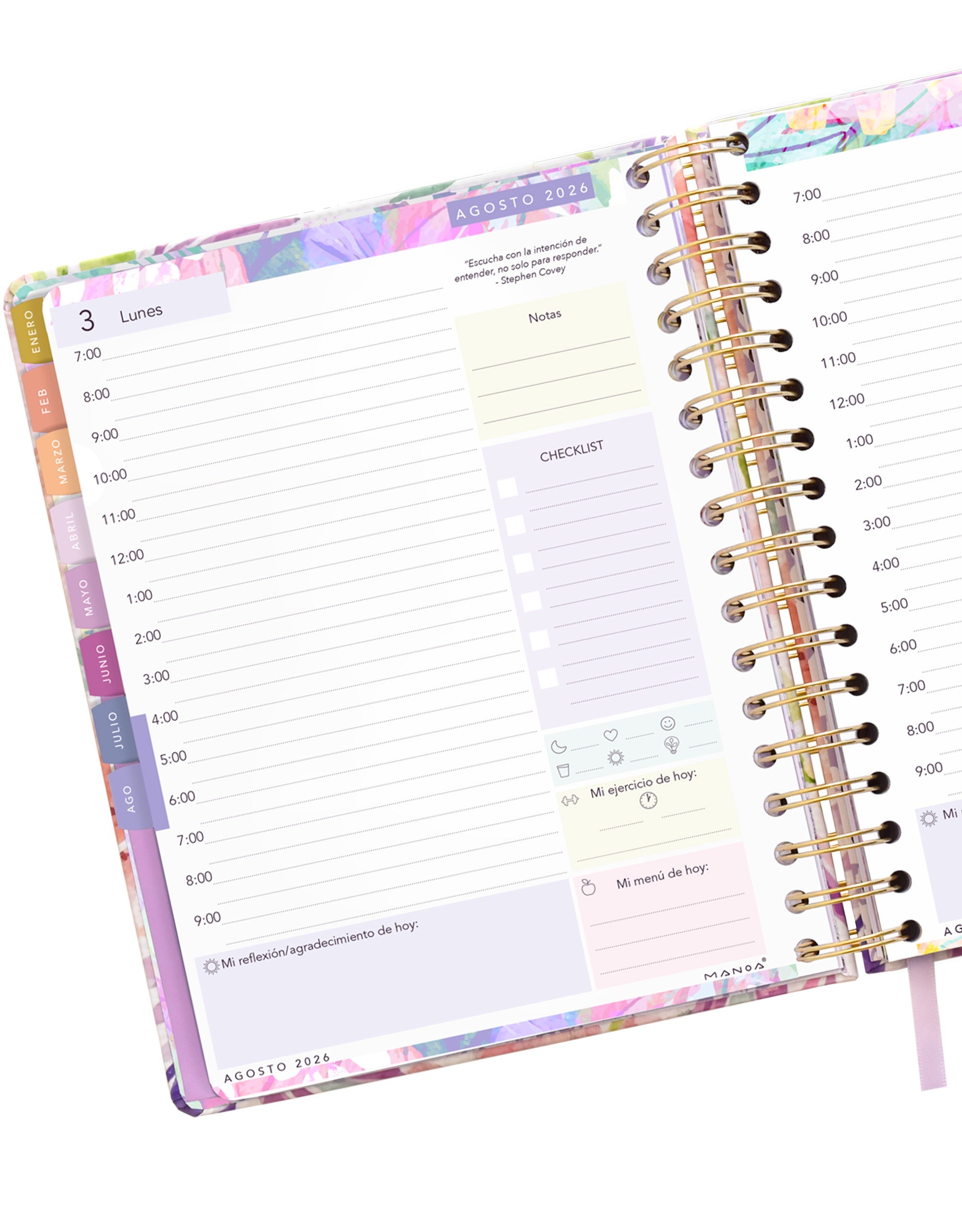 • Vista diaria, un día por página, con franjas horarias de 7:00 am a 9:00 pm.