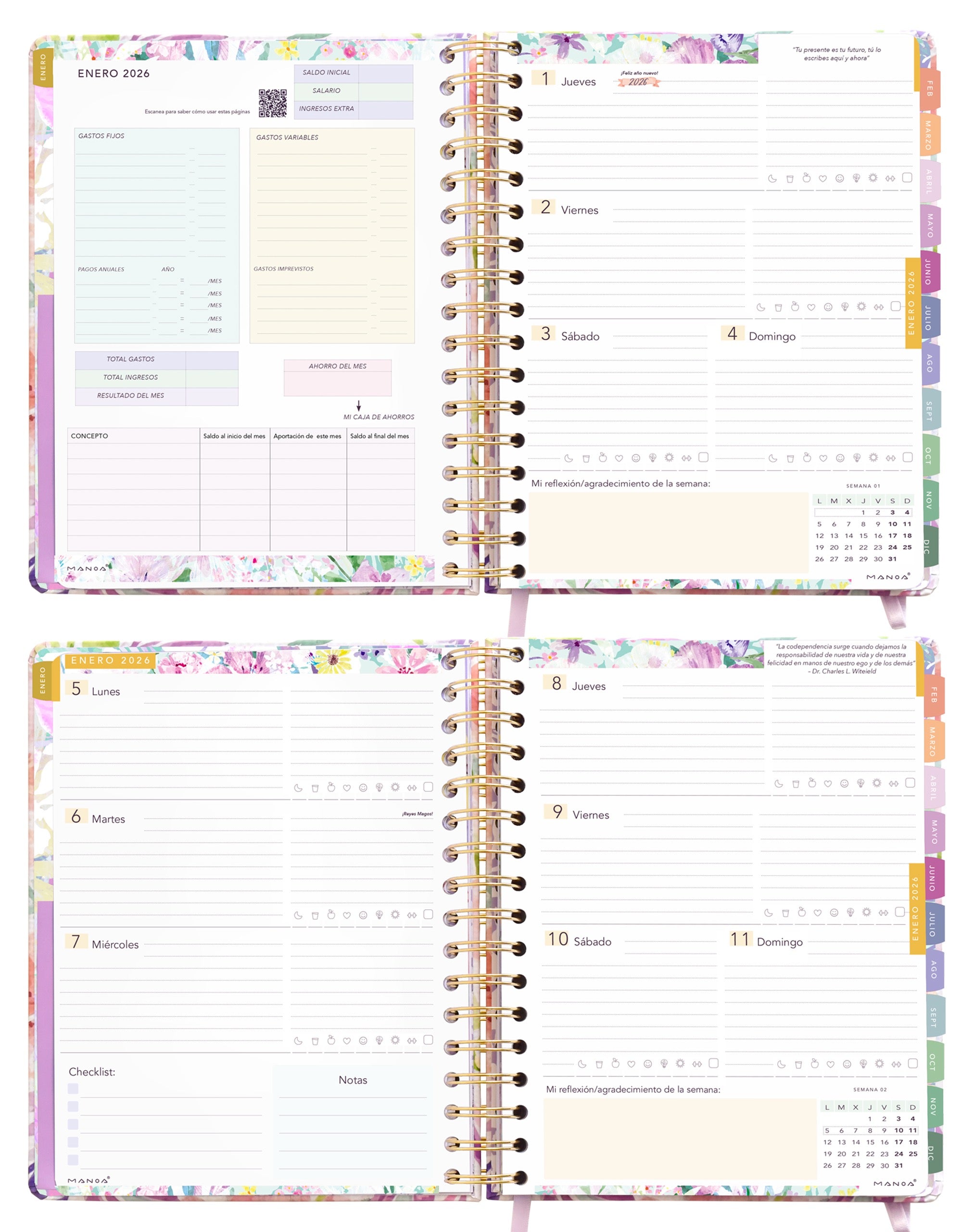 - Incluye checklist semanal, frases motivacionales cada semana y espacio para notas.
