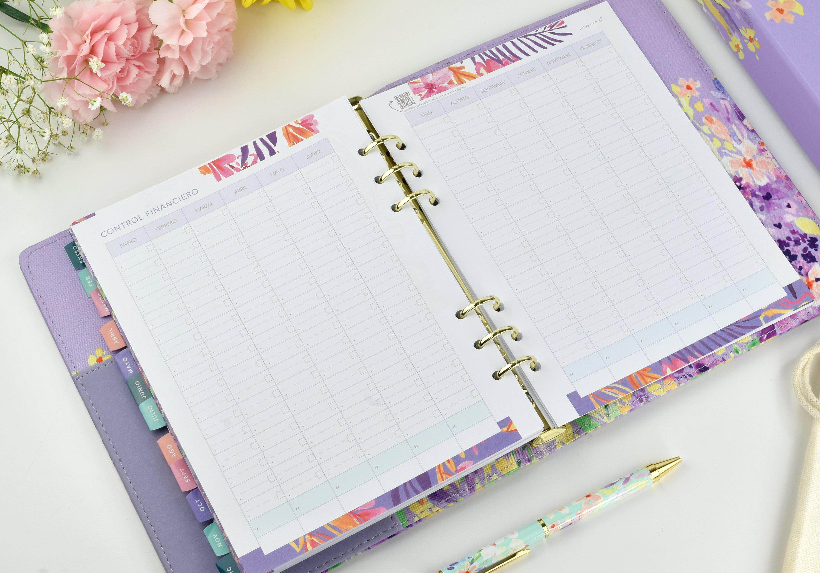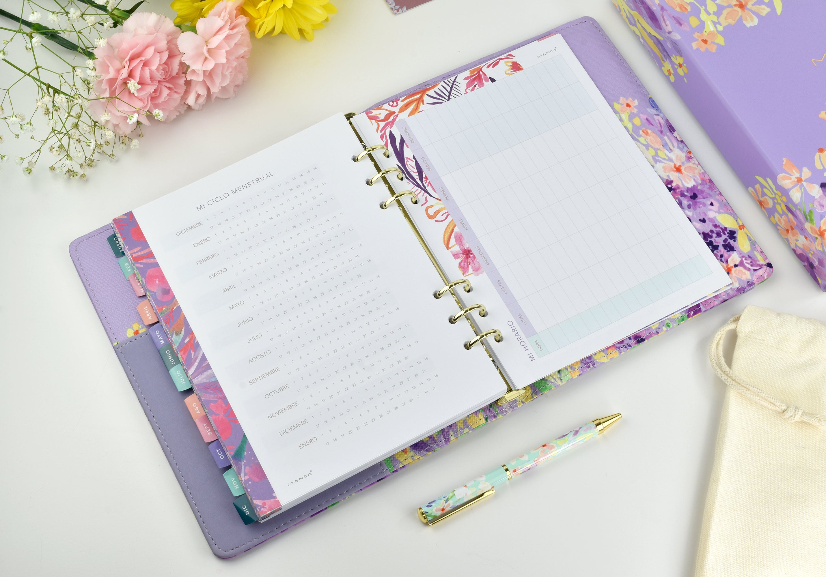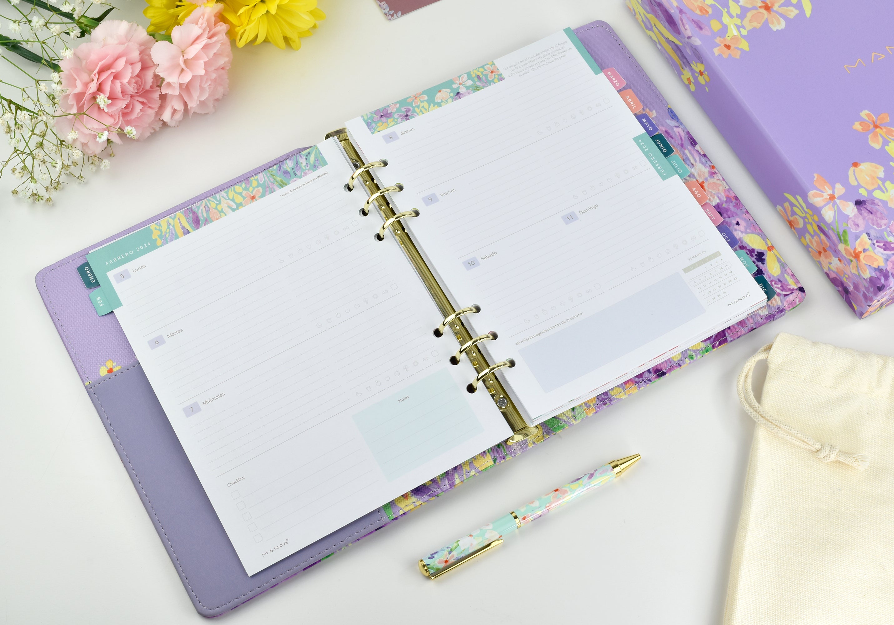 Agenda MANOA® 2026 Día por Página con franjas horarias 380 páginas (190 hojas) que incluyen pestañas separadoras mensuales, páginas de planificación mensual, contraseñas y contactos, horario, control menstrual, control financiero, objetivos y estrategias personales, mis propósitos para el año...) >>>(IMPORTANTE: no caben todas las hojas de este pack, tendrás que llevar solo unos meses).>>>