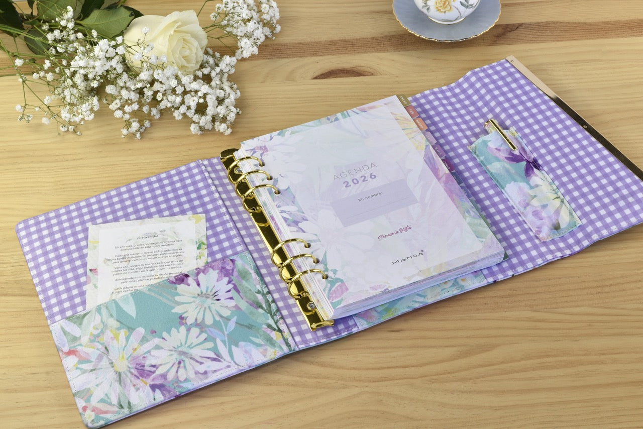 Agenda MANOA® 2026 Día por Página con franjas horarias 380 páginas (190 hojas) que incluyen pestañas separadoras mensuales, páginas de planificación mensual, contraseñas y contactos, horario, control menstrual, control financiero, objetivos y estrategias personales, mis propósitos para el año...)