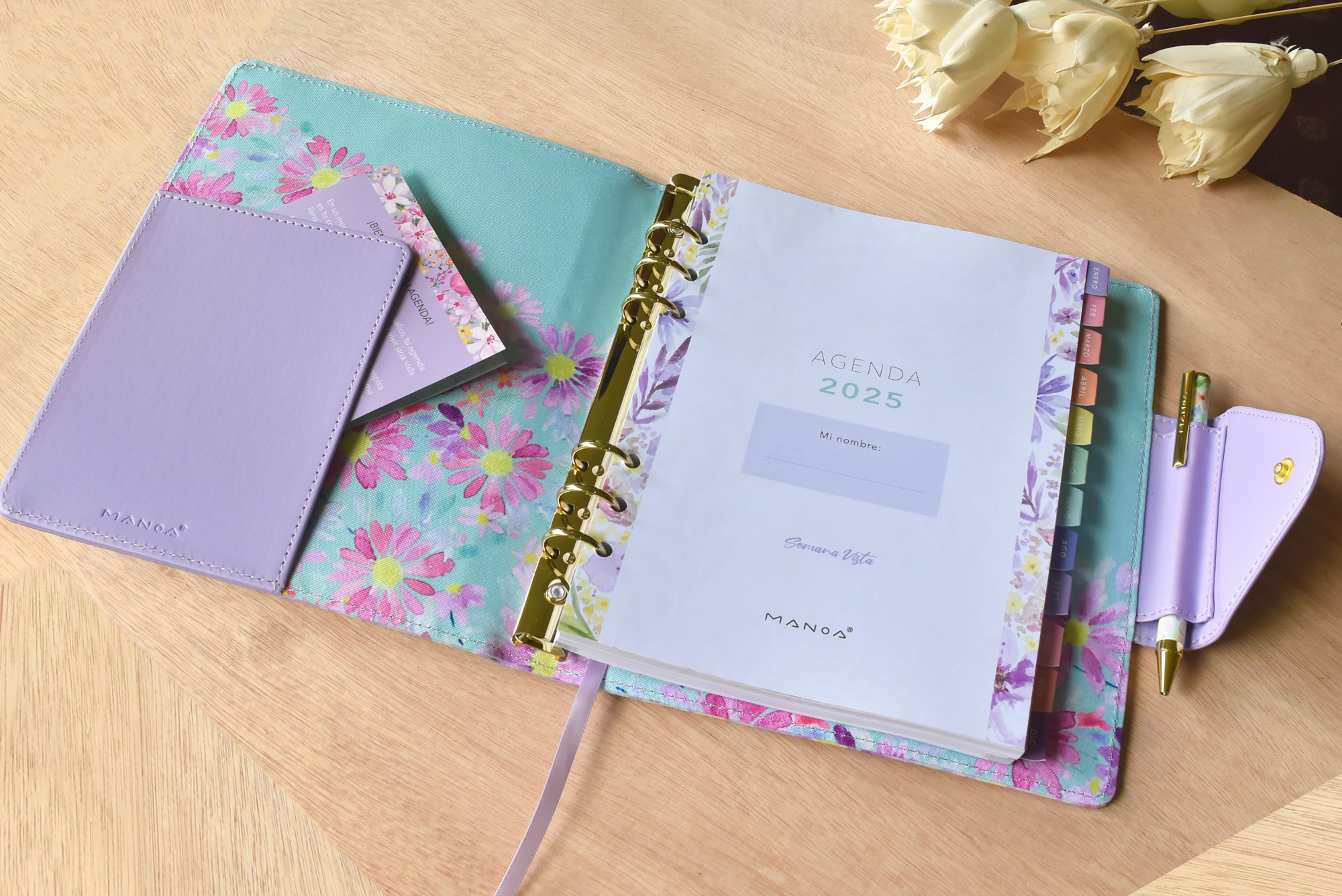 Agenda MANOA® 2026 Día por Página con franjas horarias 380 páginas (190 hojas) que incluyen pestañas separadoras mensuales, páginas de planificación mensual, contraseñas y contactos, horario, control menstrual, control financiero, objetivos y estrategias personales, mis propósitos para el año...) >>>(IMPORTANTE: no caben todas las hojas de este pack, tendrás que llevar solo unos meses).>>>