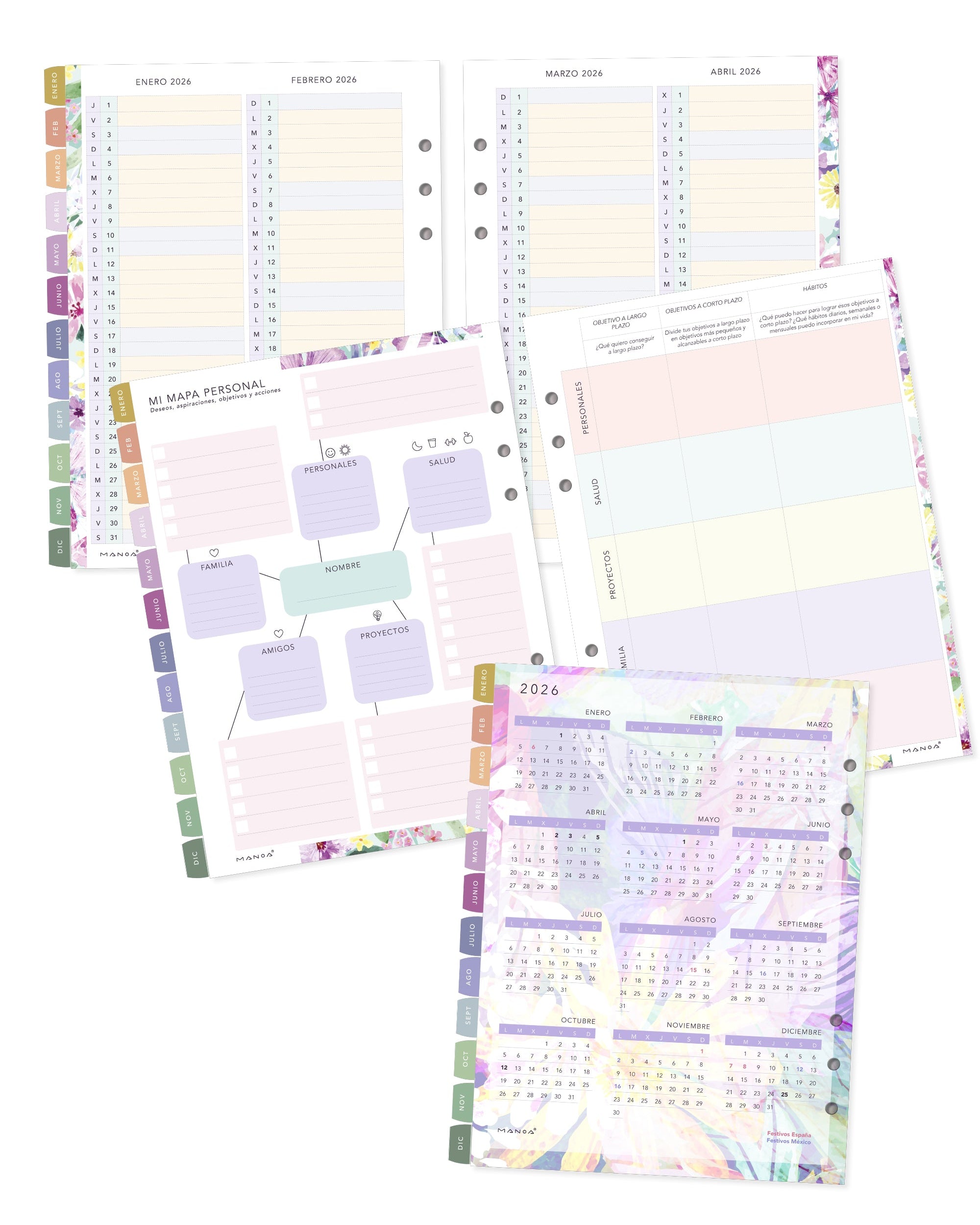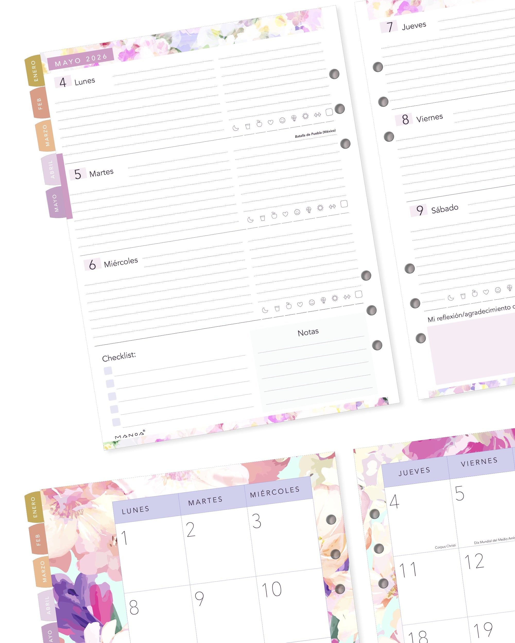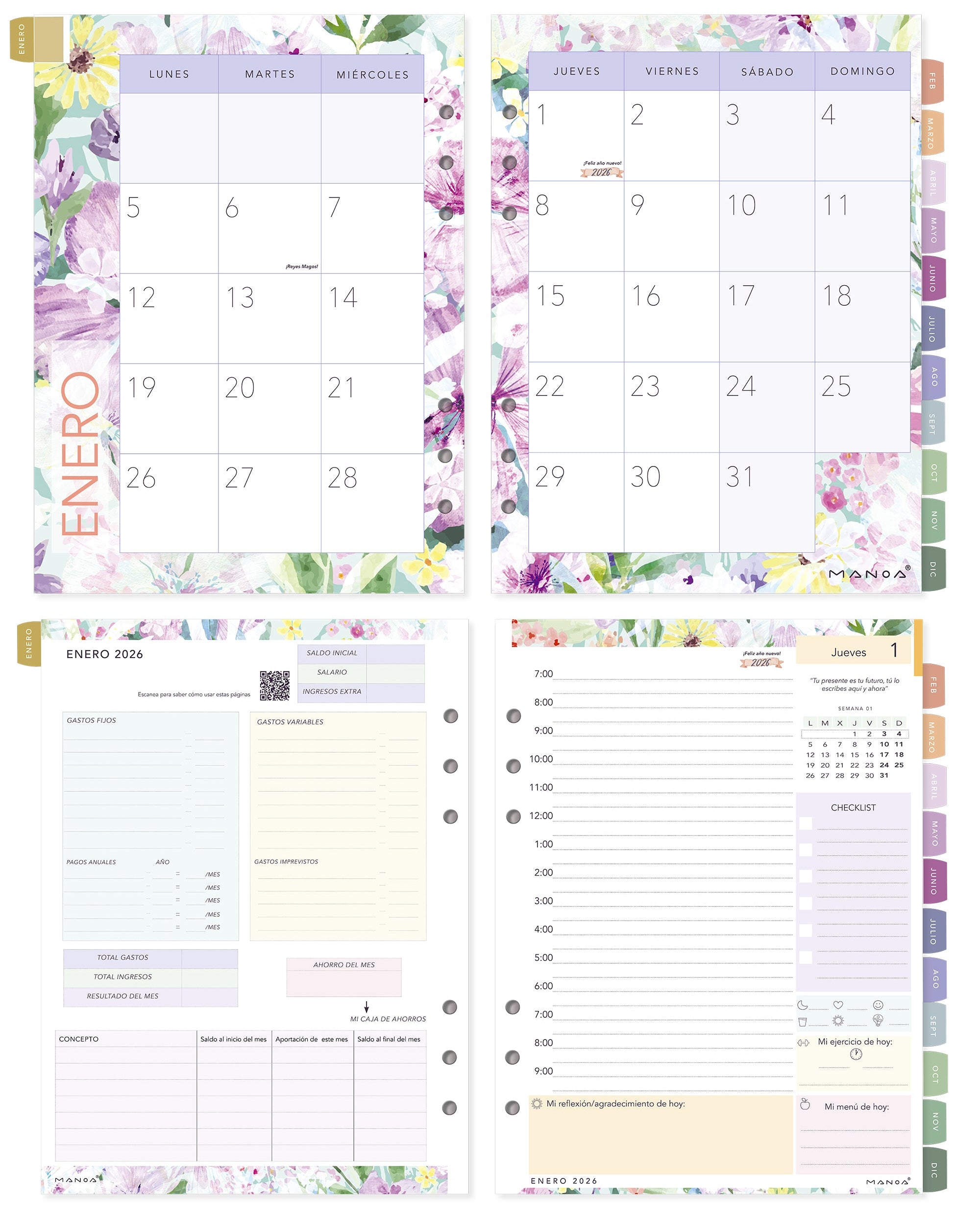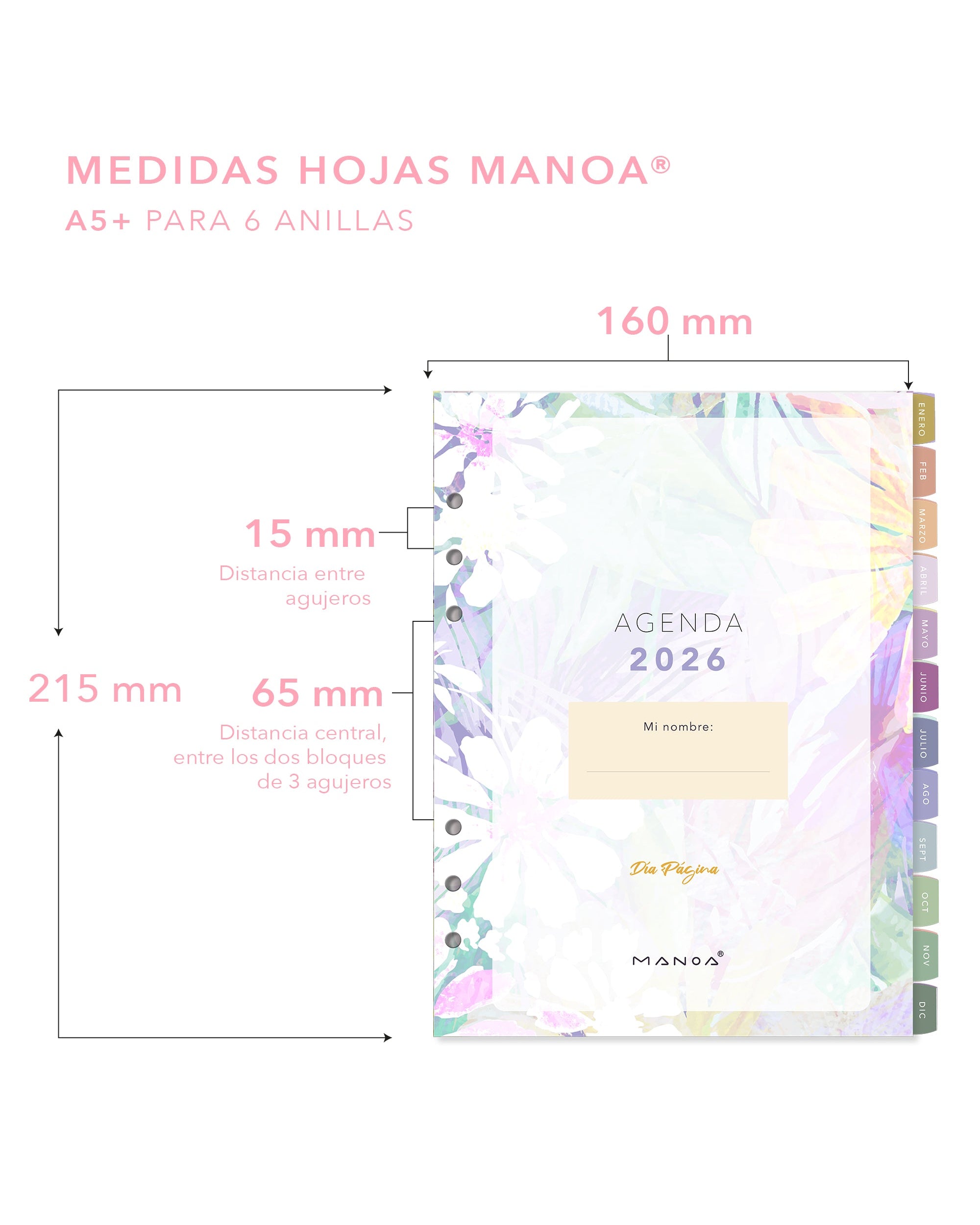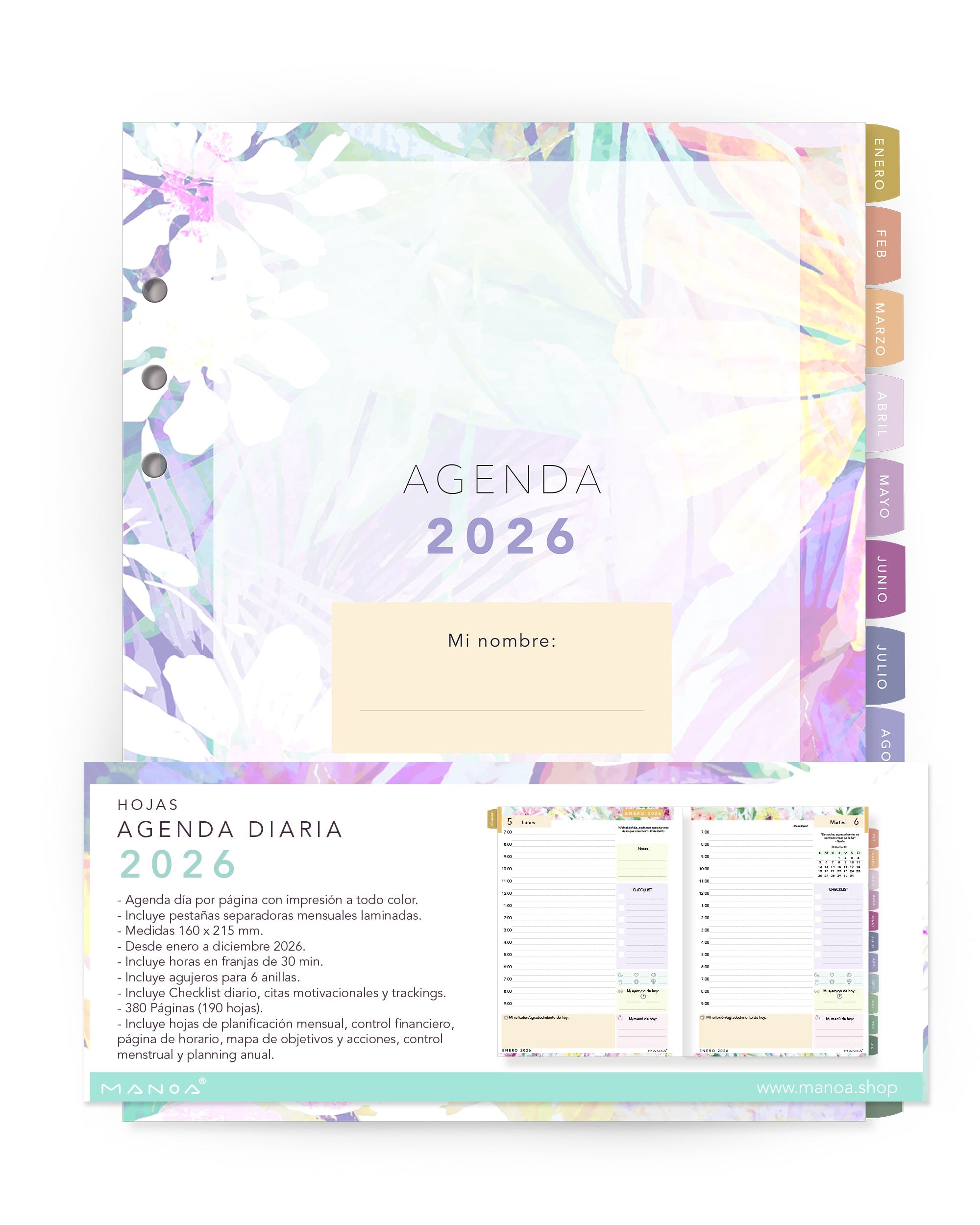 Agenda MANOA® 2026 Día por Página con franjas horarias 380 páginas (190 hojas) que incluyen pestañas separadoras mensuales, páginas de planificación mensual, contraseñas y contactos, horario, control menstrual, control financiero, objetivos y estrategias personales, mis propósitos para el año...)