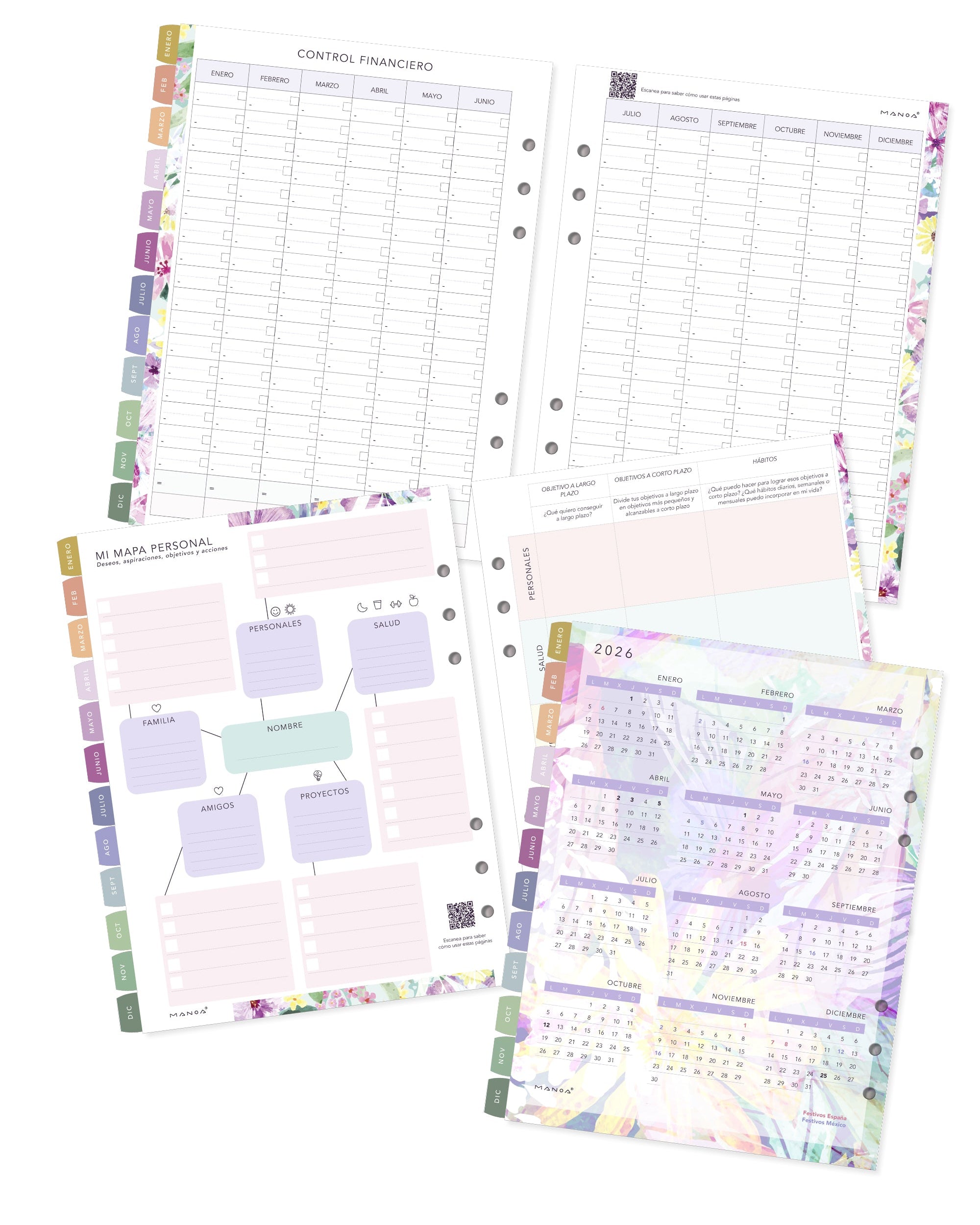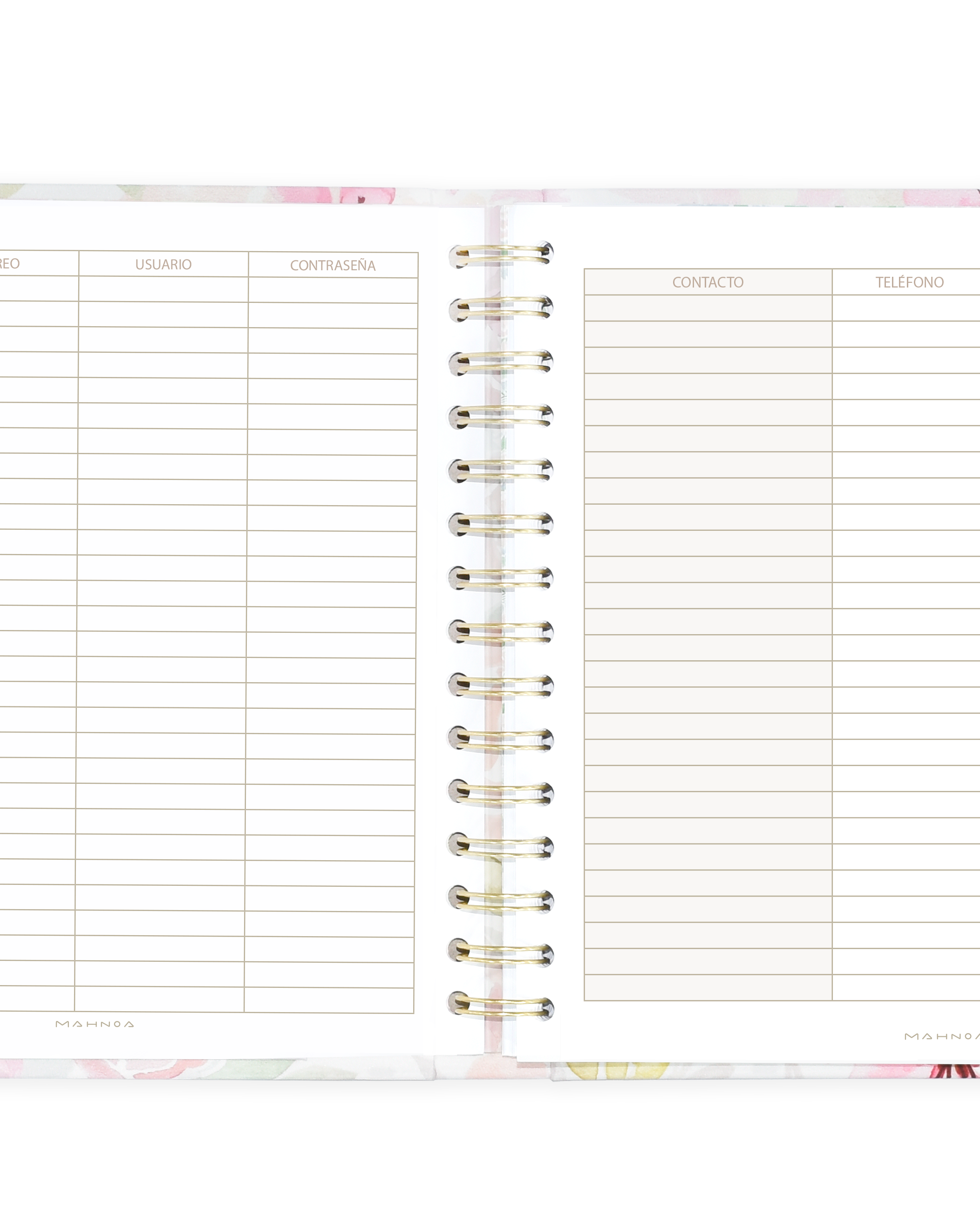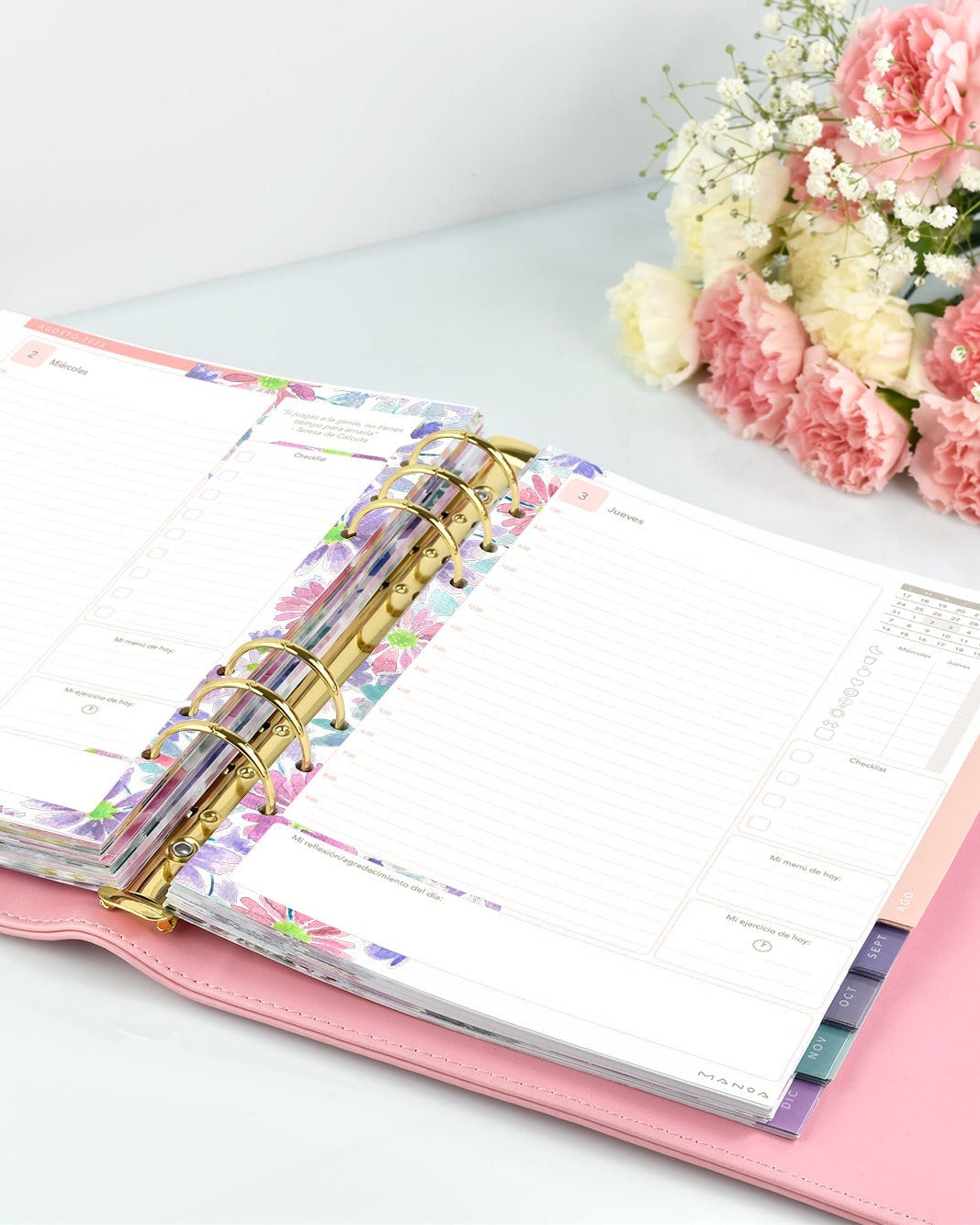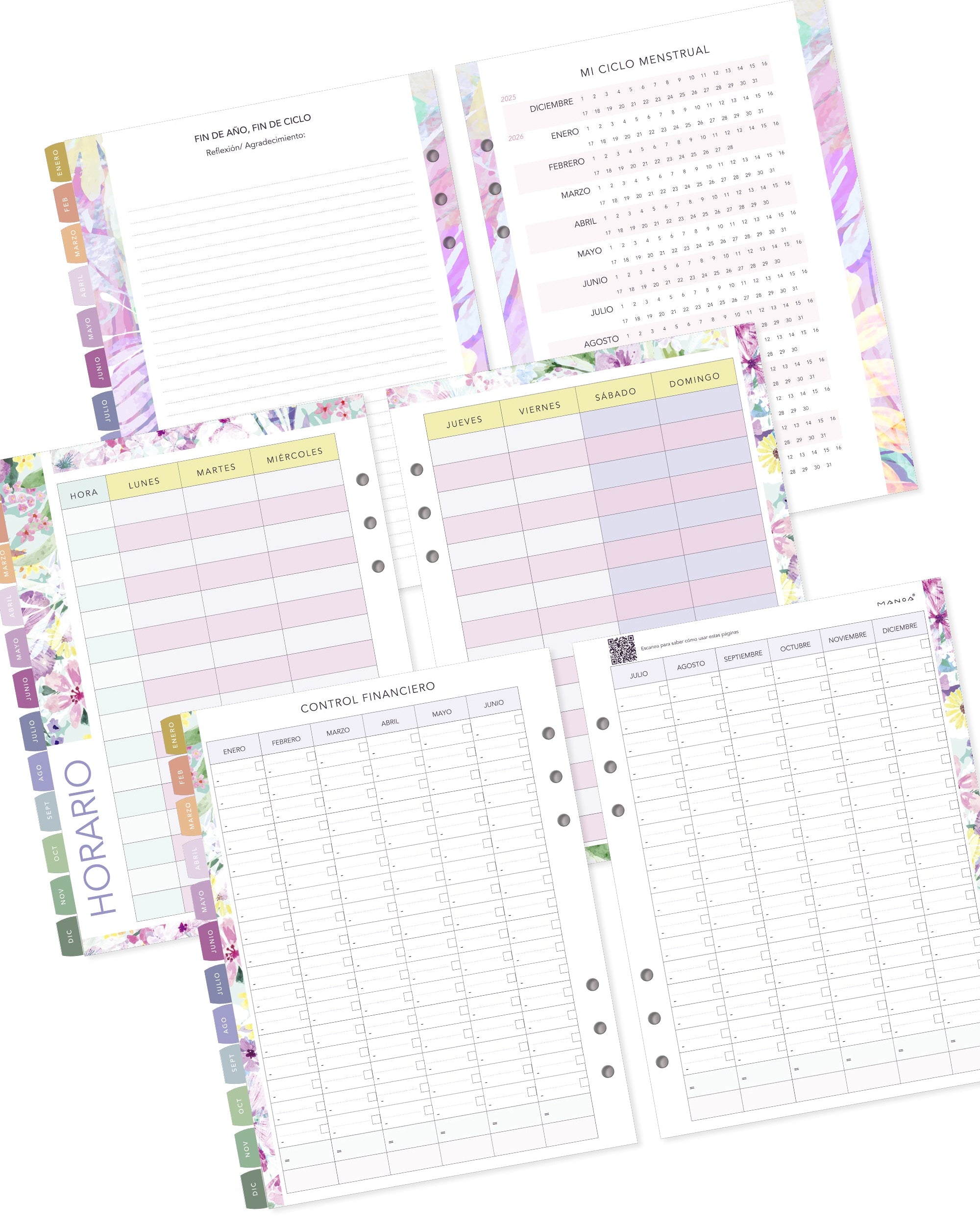 Agenda MANOA® 2026 Día por Página con franjas horarias 380 páginas (190 hojas) que incluyen pestañas separadoras mensuales, páginas de planificación mensual, contraseñas y contactos, horario, control menstrual, control financiero, objetivos y estrategias personales, mis propósitos para el año...)