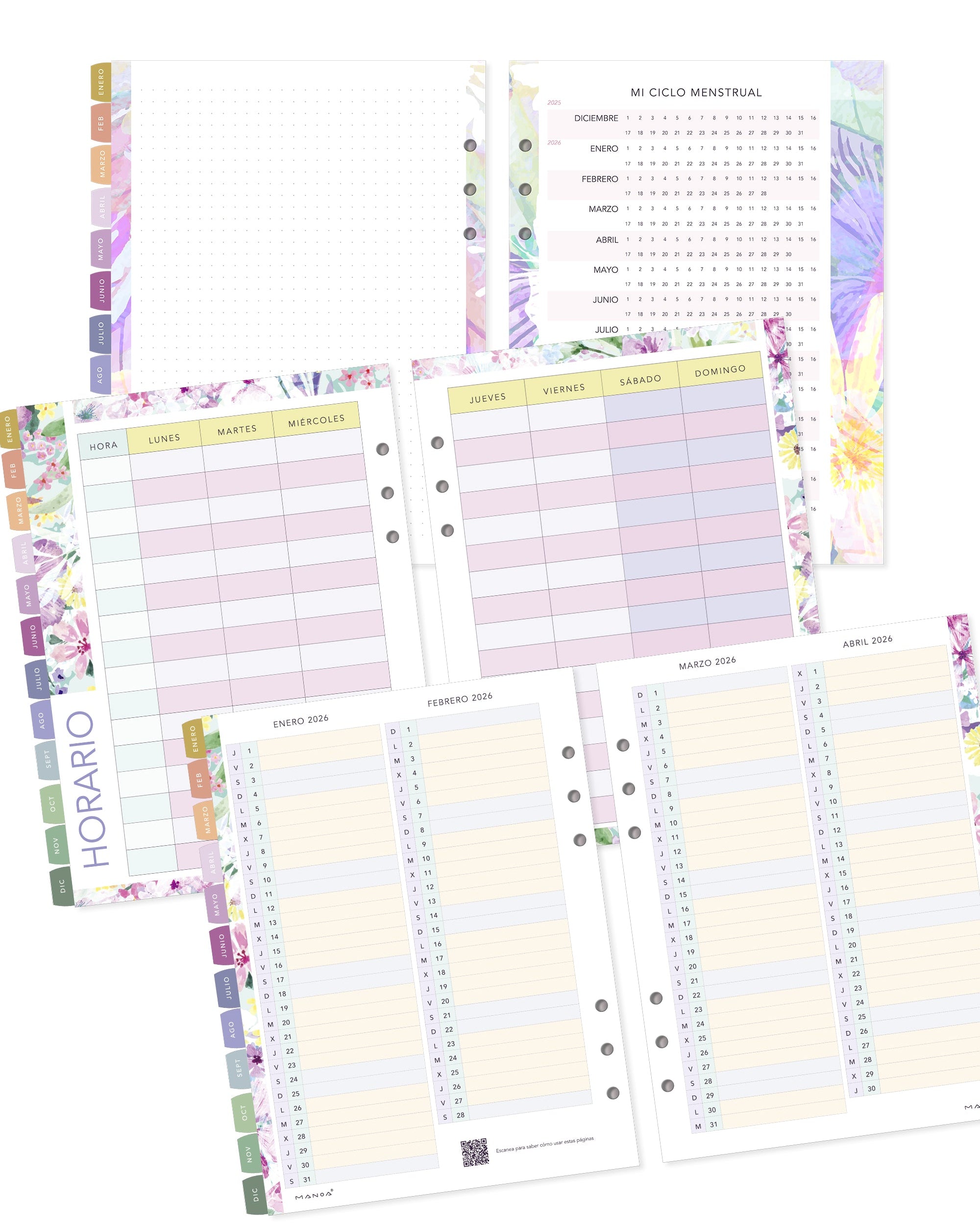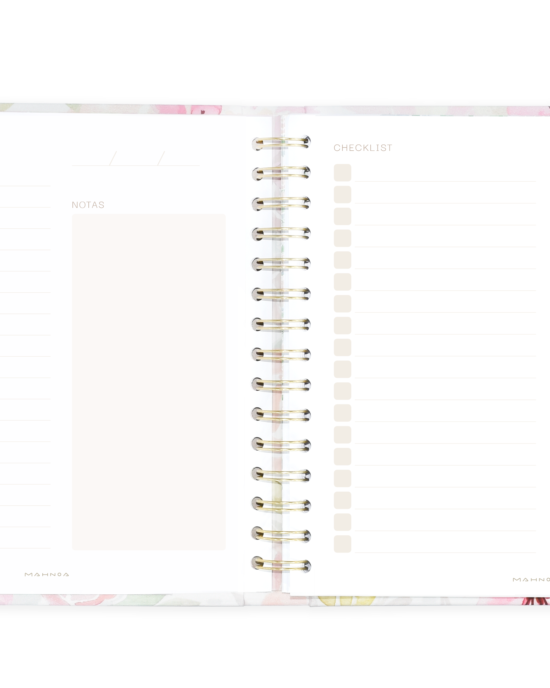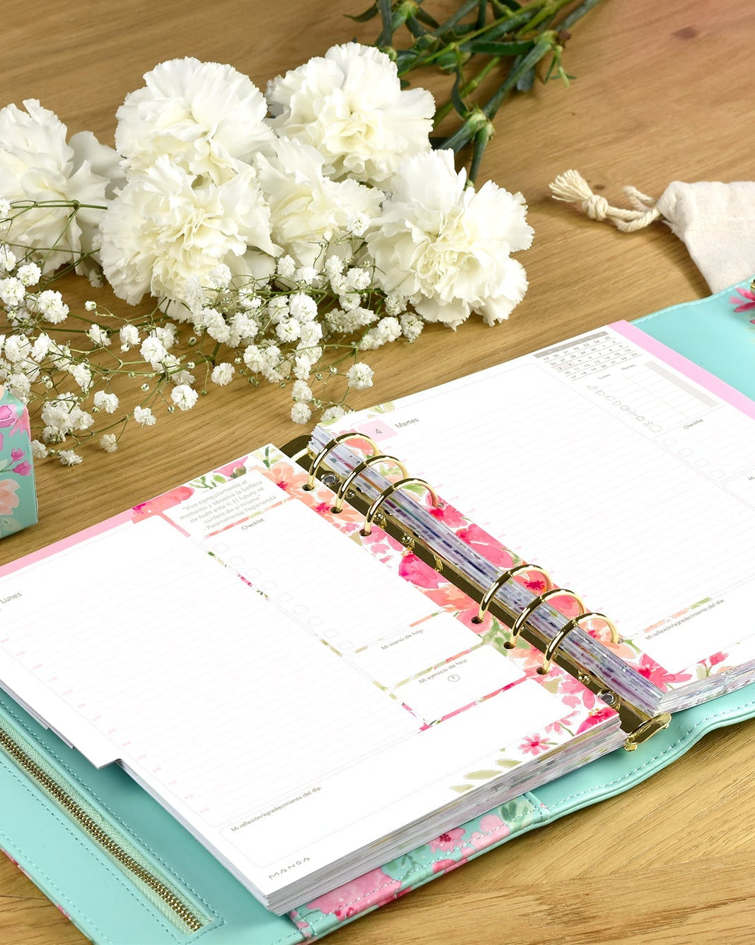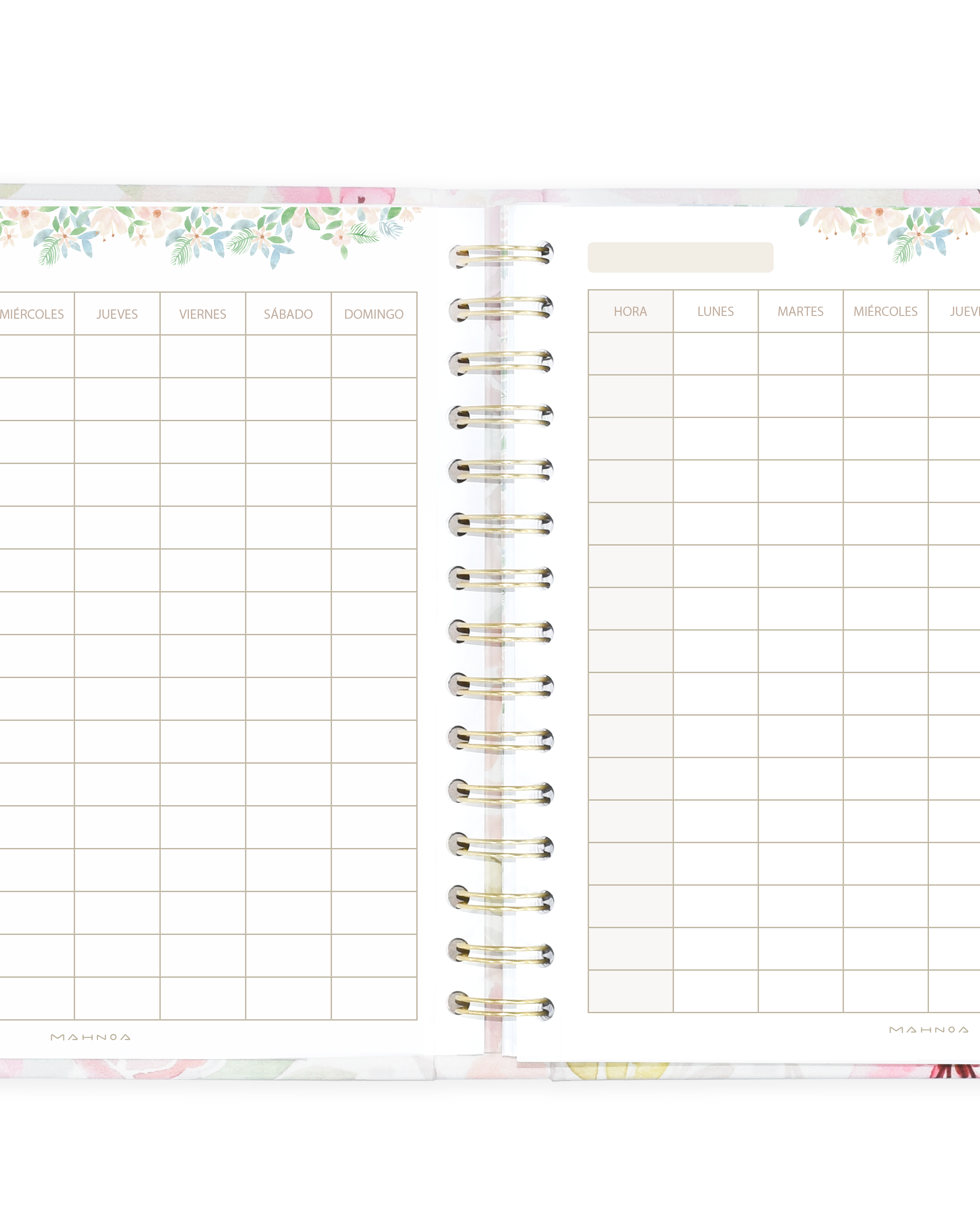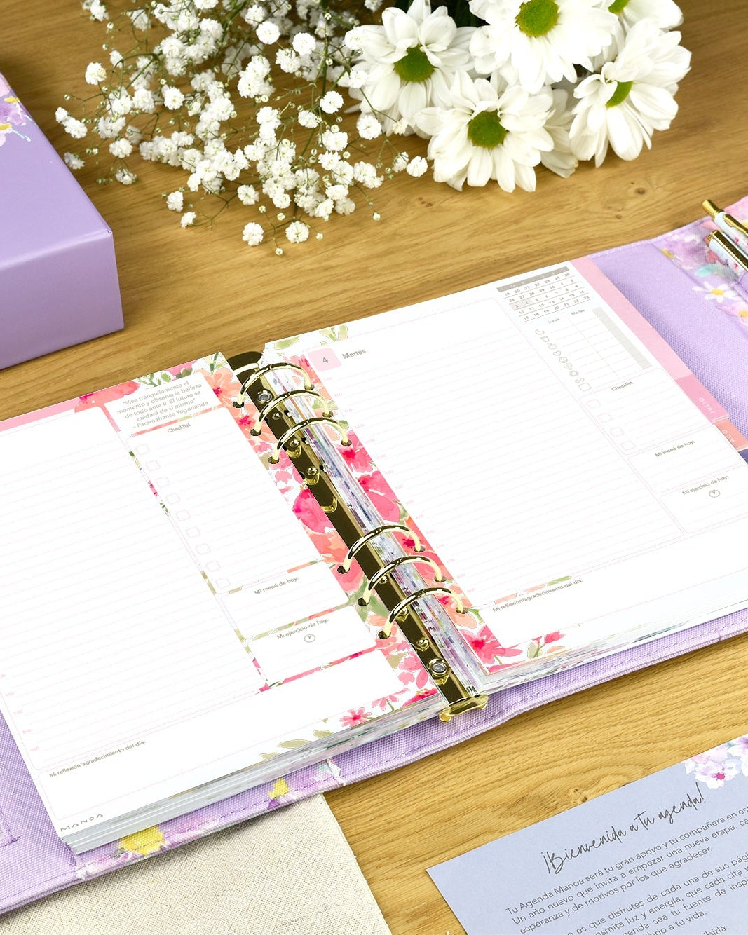 Agenda MANOA® 2026 Día por Página con franjas horarias 380 páginas (190 hojas) que incluyen pestañas separadoras mensuales, páginas de planificación mensual, contraseñas y contactos, horario, control menstrual, control financiero, objetivos y estrategias personales, mis propósitos para el año...)