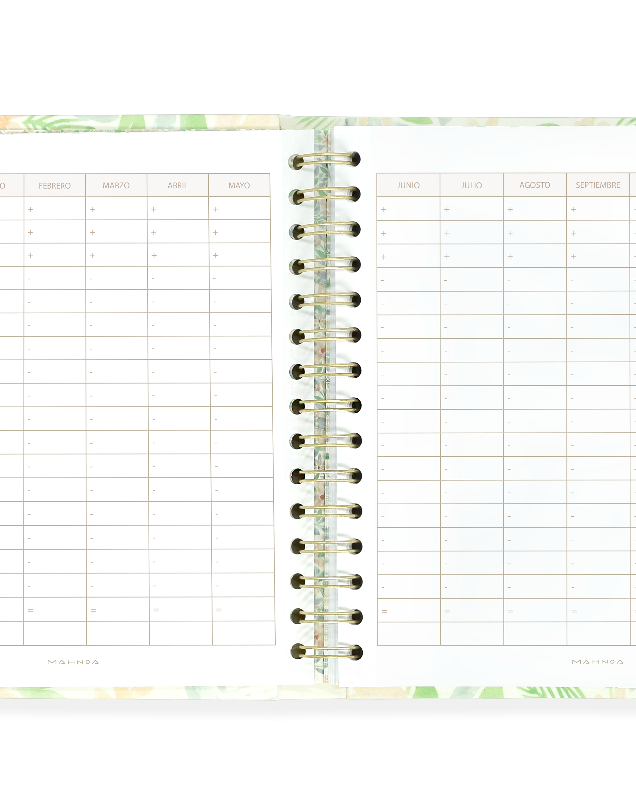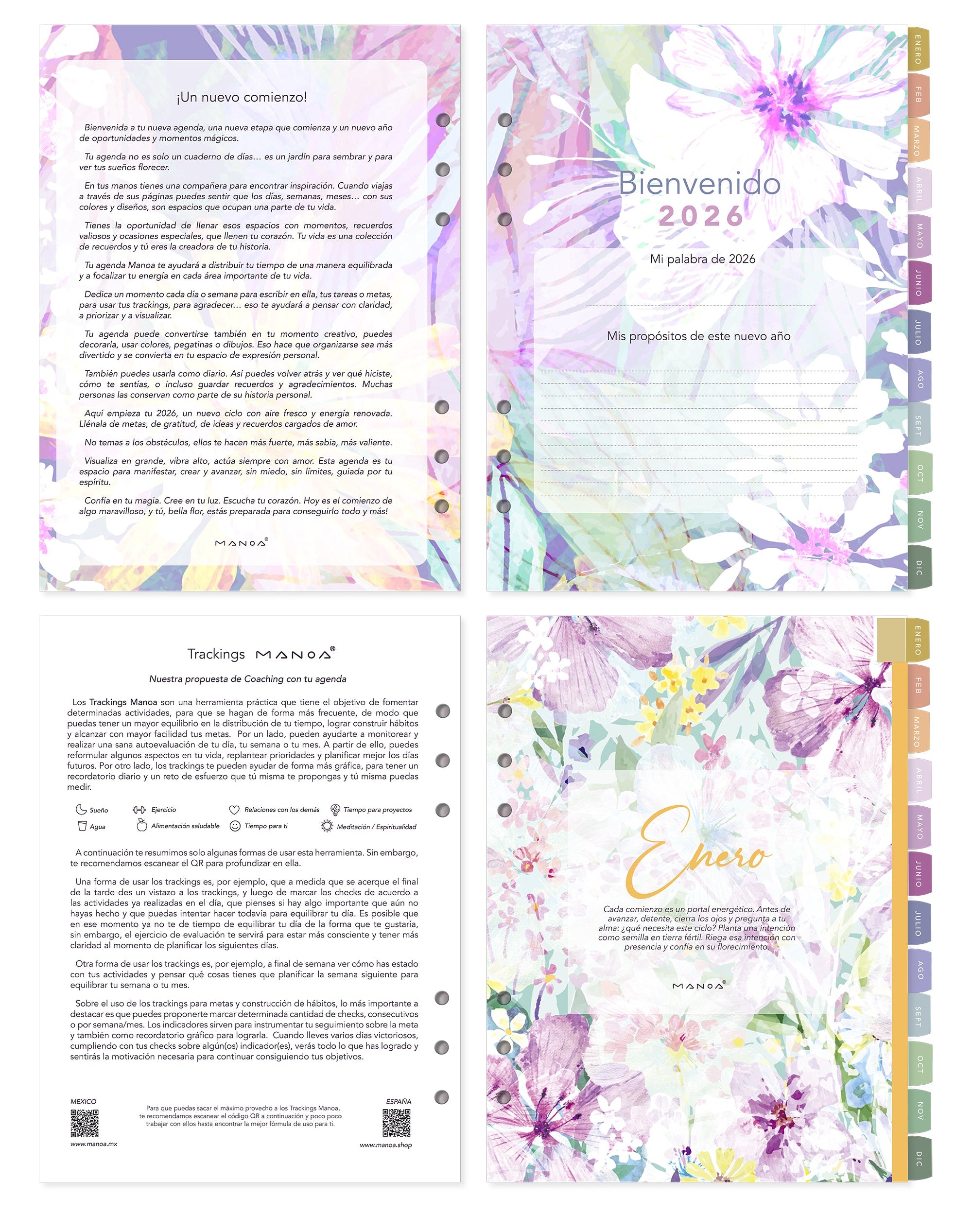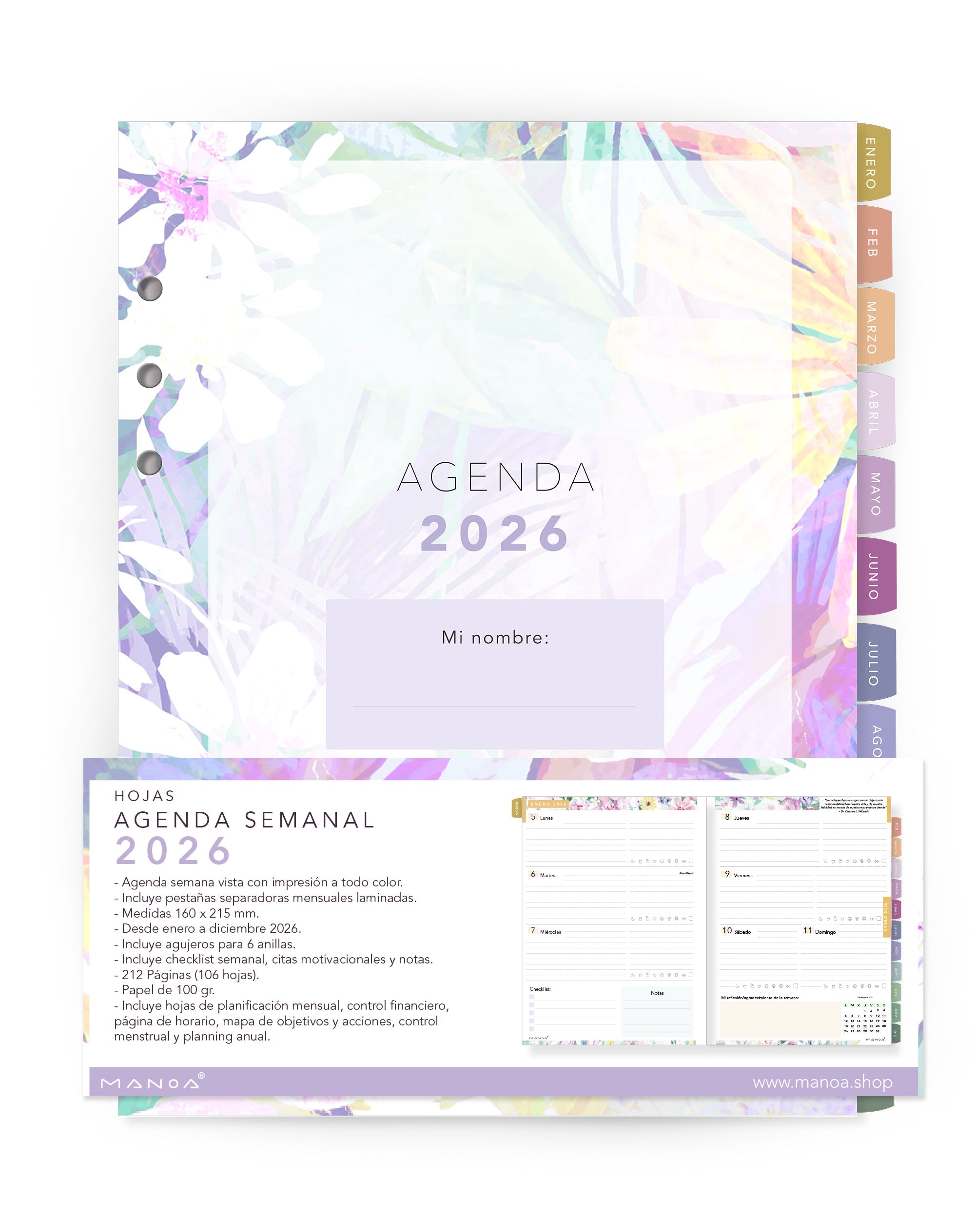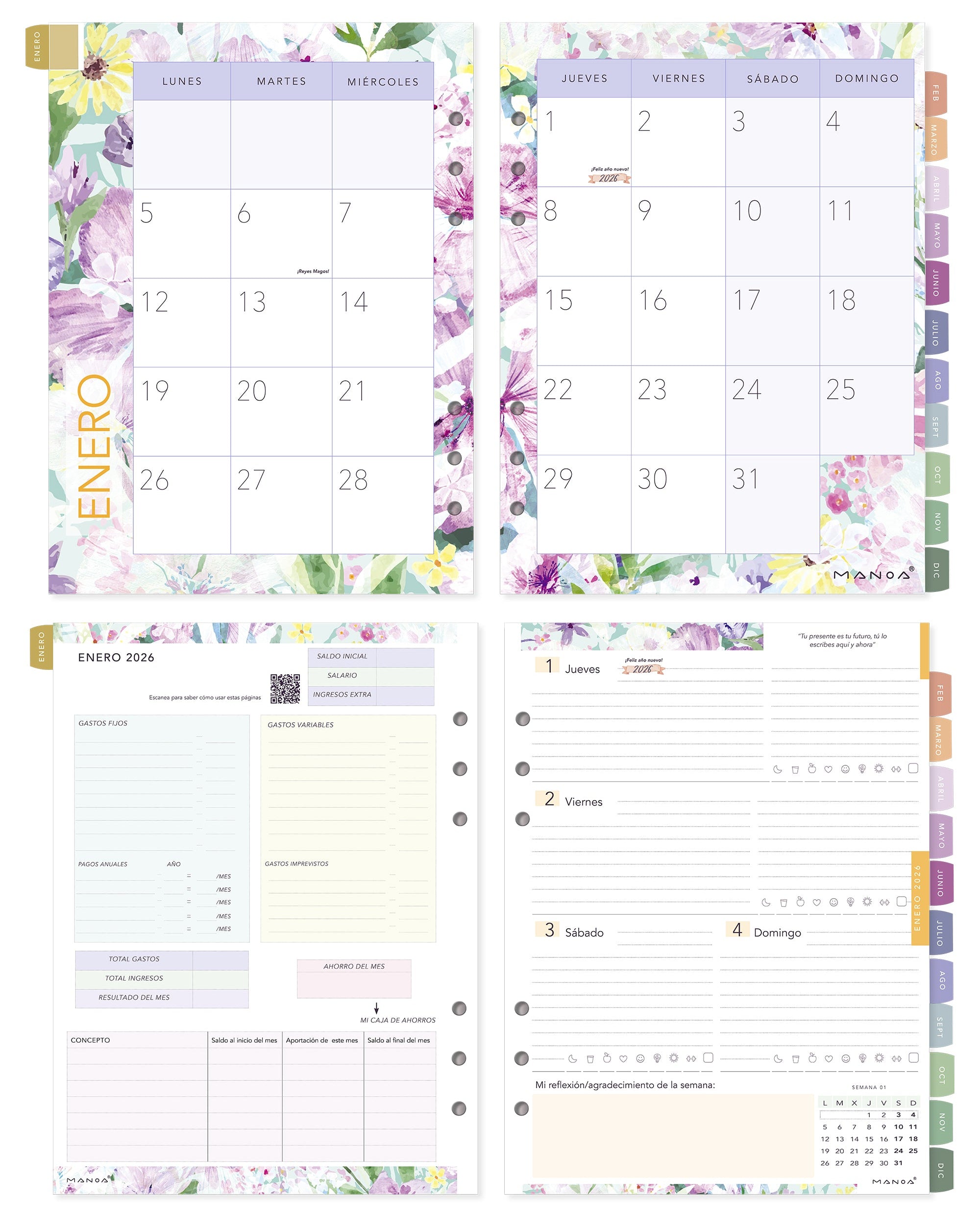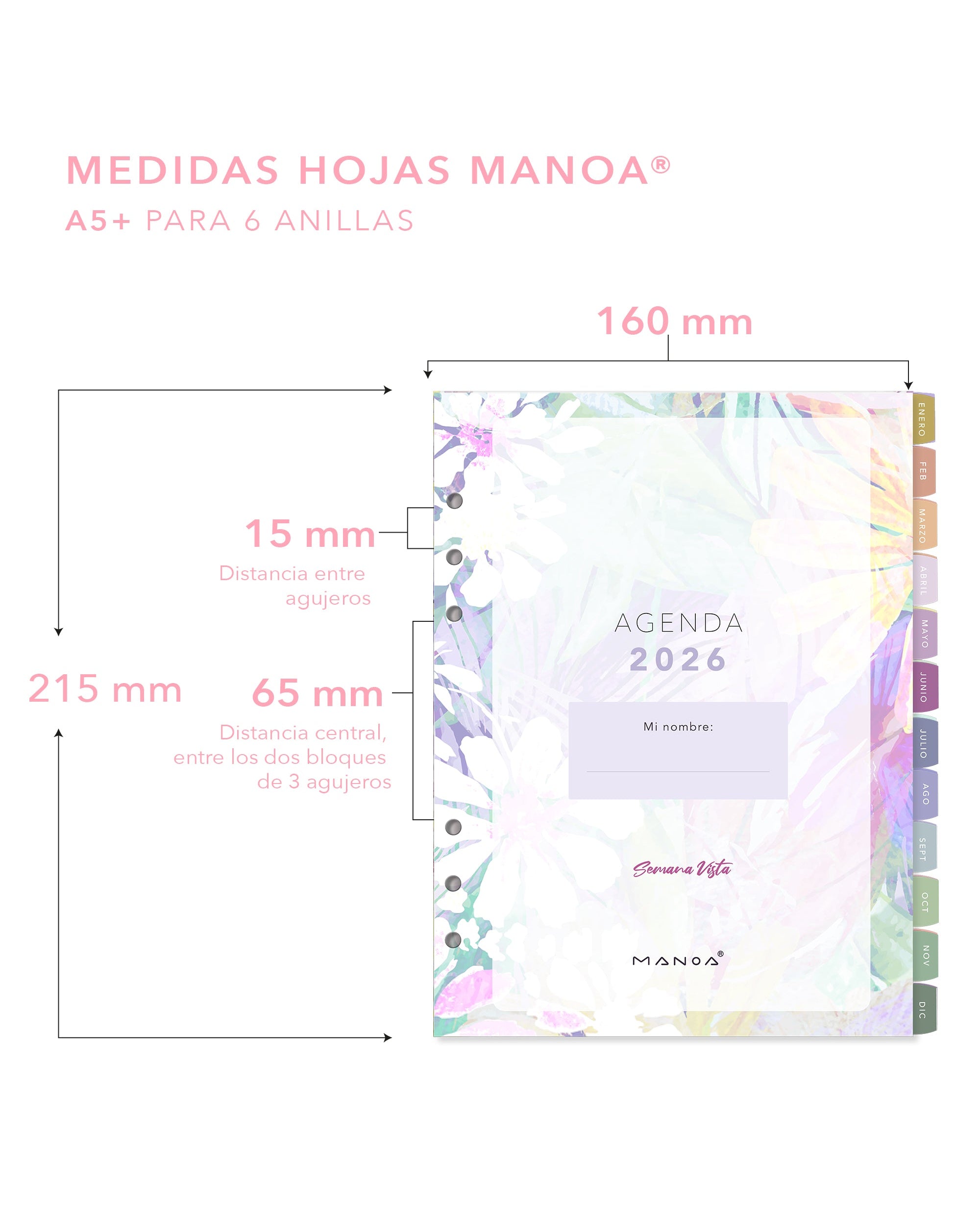 Agenda MANOA® 2026 Semanal con días en horizontal 210 páginas (105 hojas) que incluyen pestañas separadoras mensuales, 40 páginas para notas, hojas de planificación mensual, contraseñas y contactos, horario, planning anual en columnas, objetivos y estrategias personales, control financiero, mis propósitos para el año...