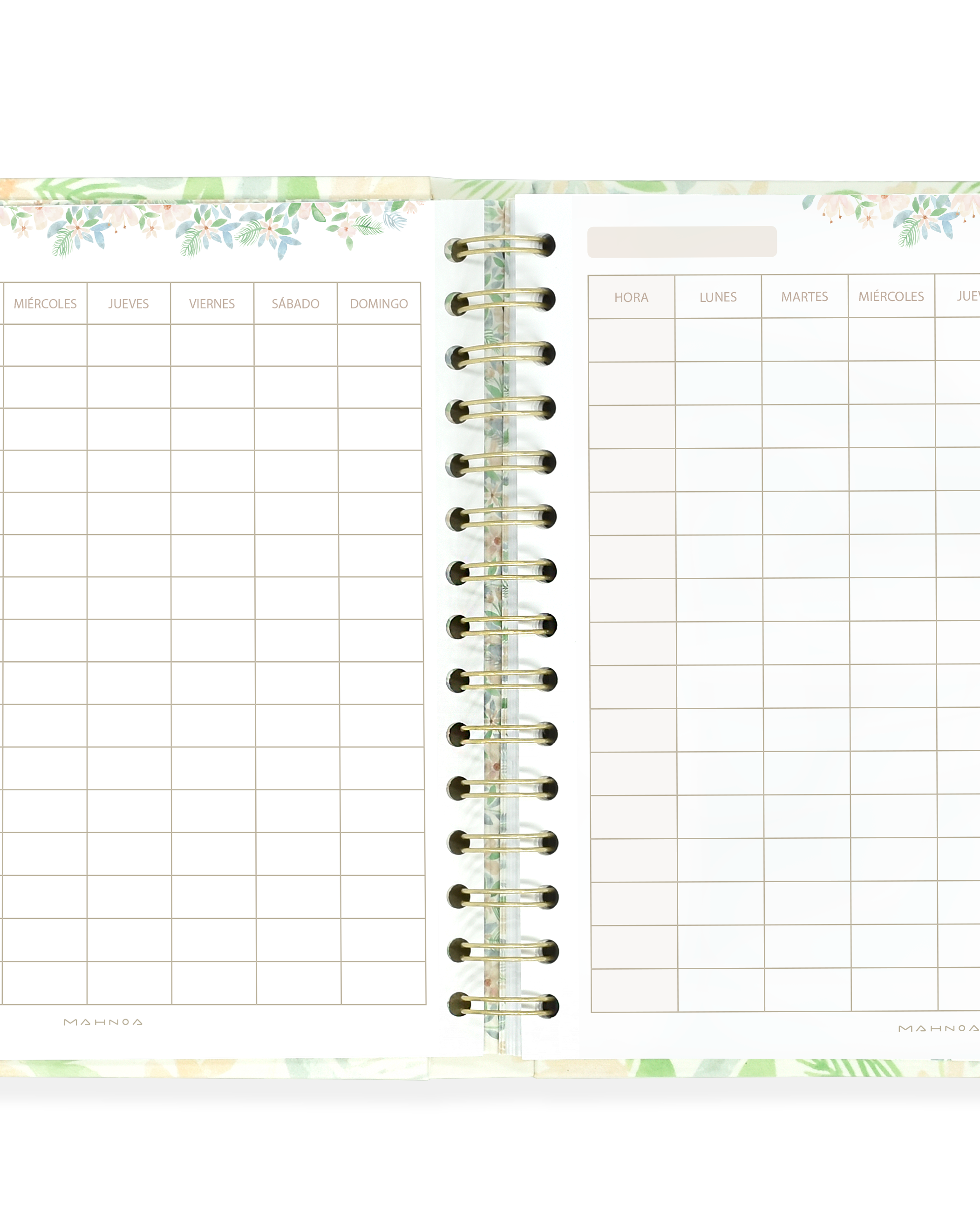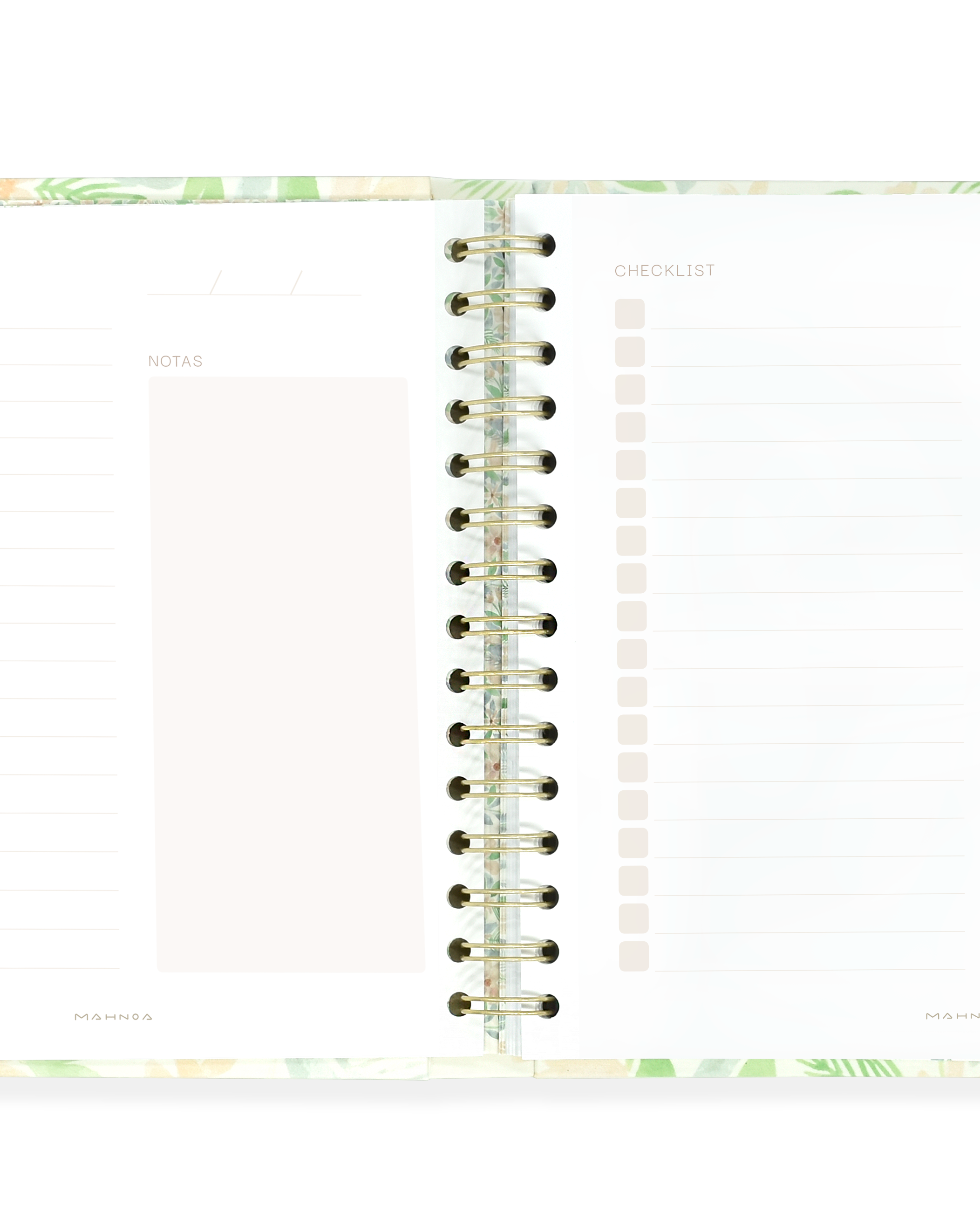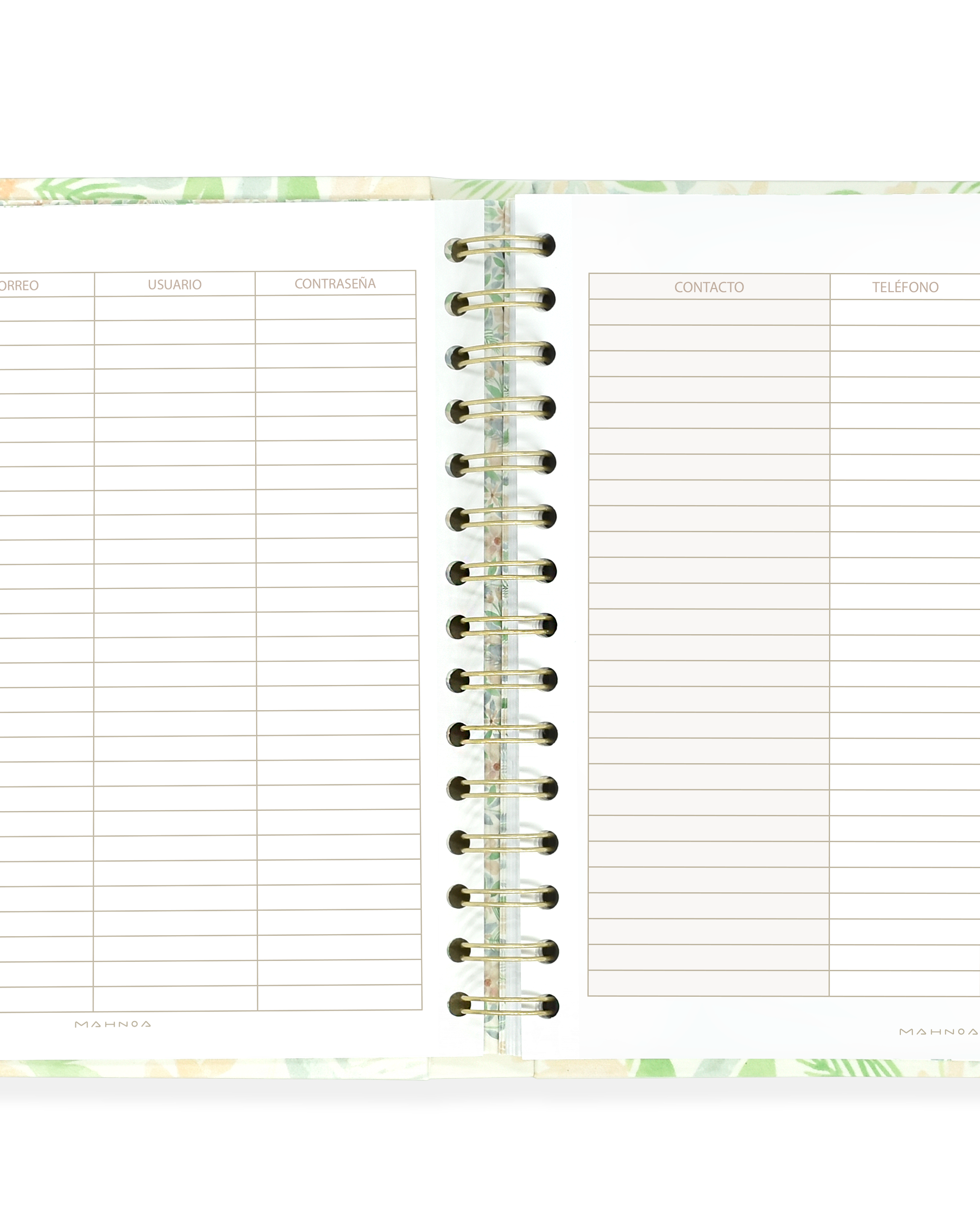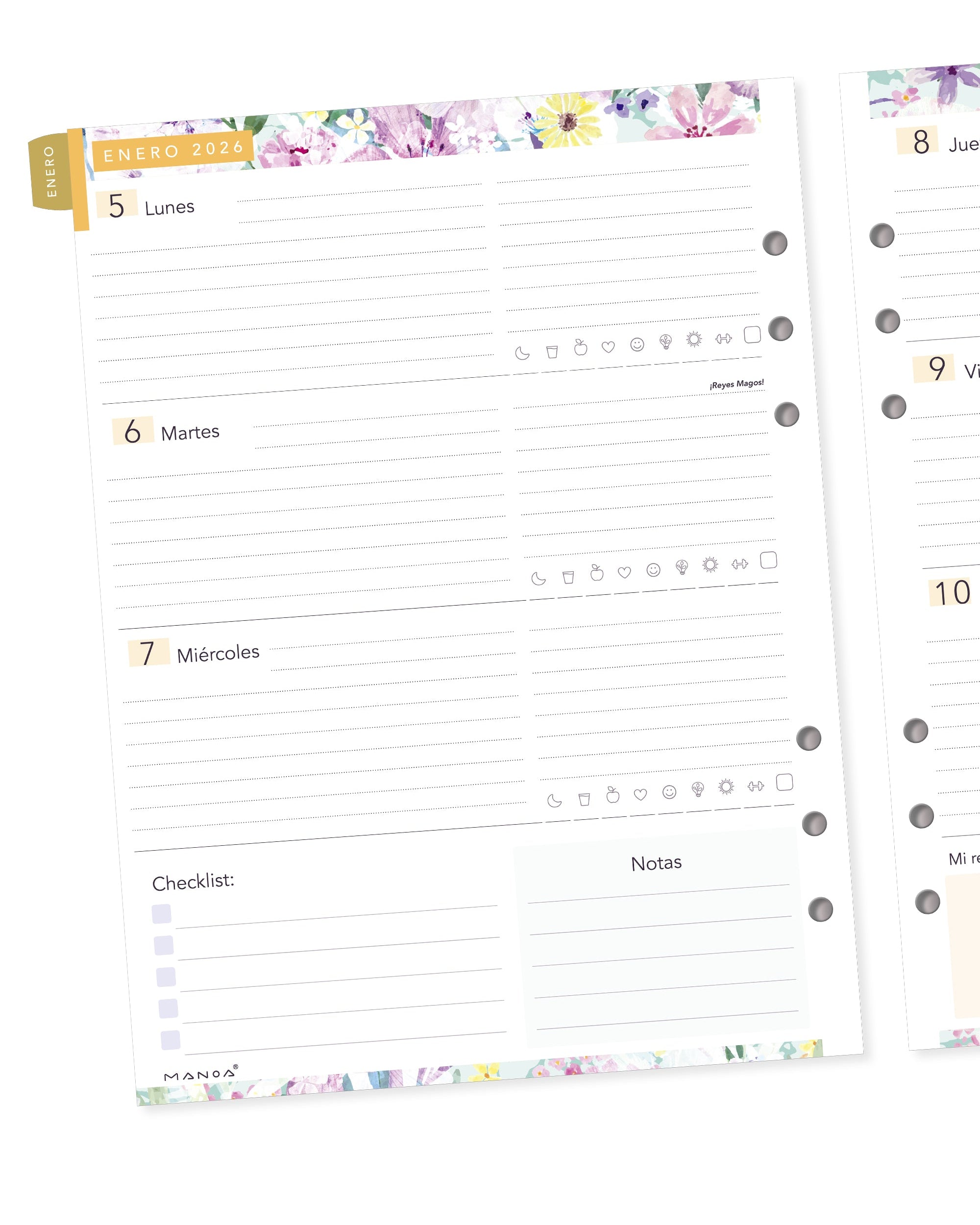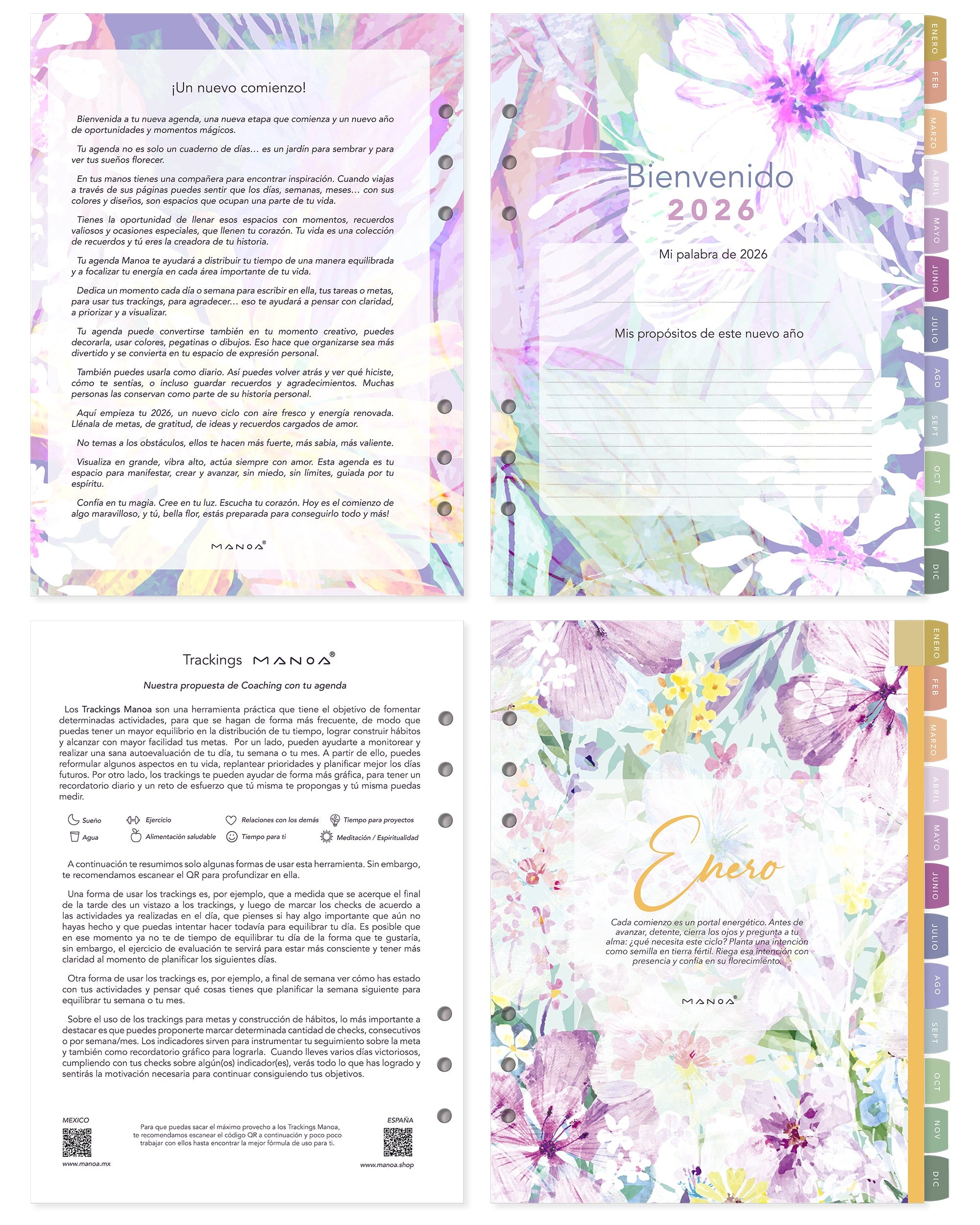 Agenda MANOA® 2026 Semanal con días en horizontal 210 páginas (105 hojas) que incluyen pestañas separadoras mensuales, 40 páginas para notas, hojas de planificación mensual, contraseñas y contactos, horario, planning anual en columnas, objetivos y estrategias personales, control financiero, mis propósitos para el año...