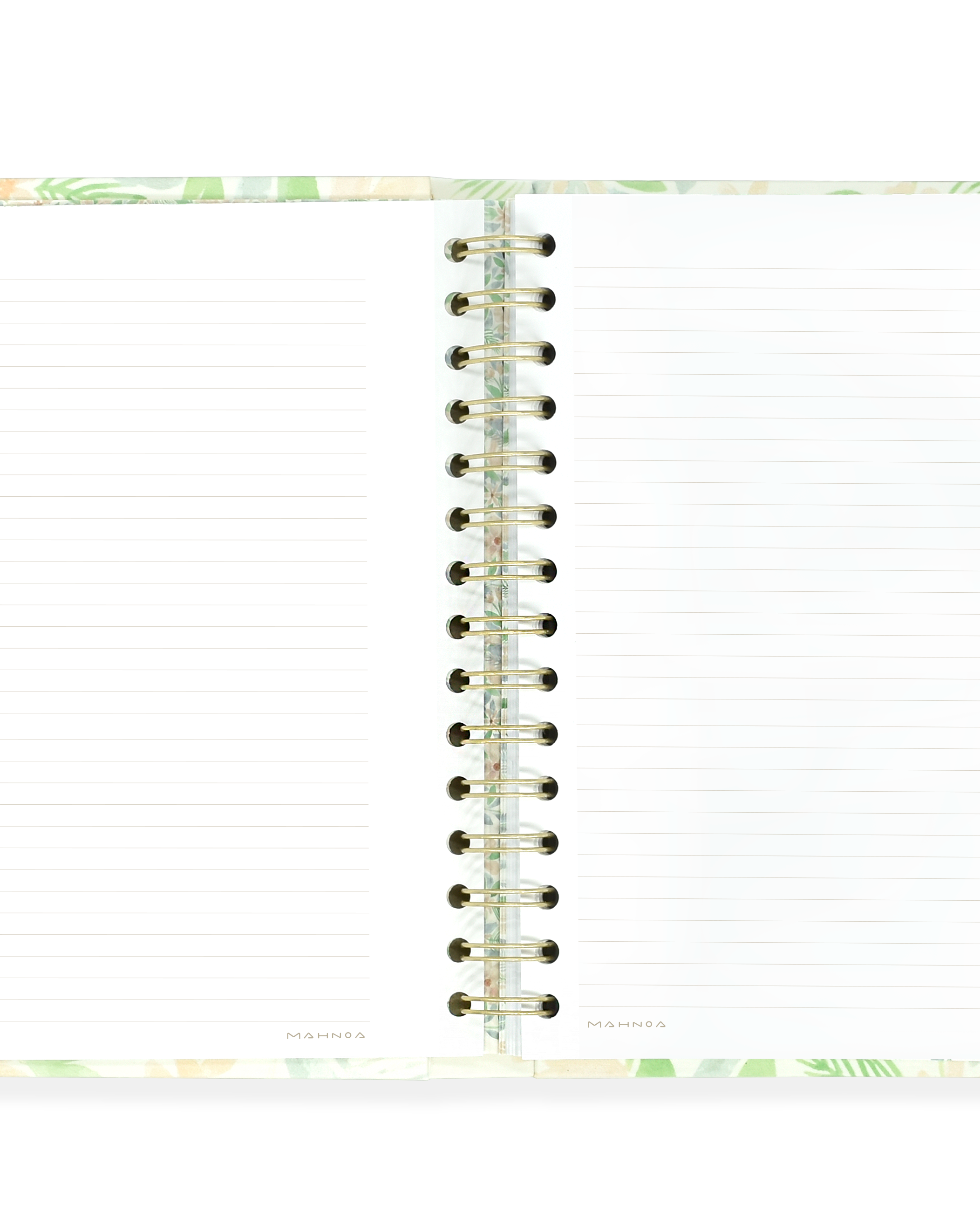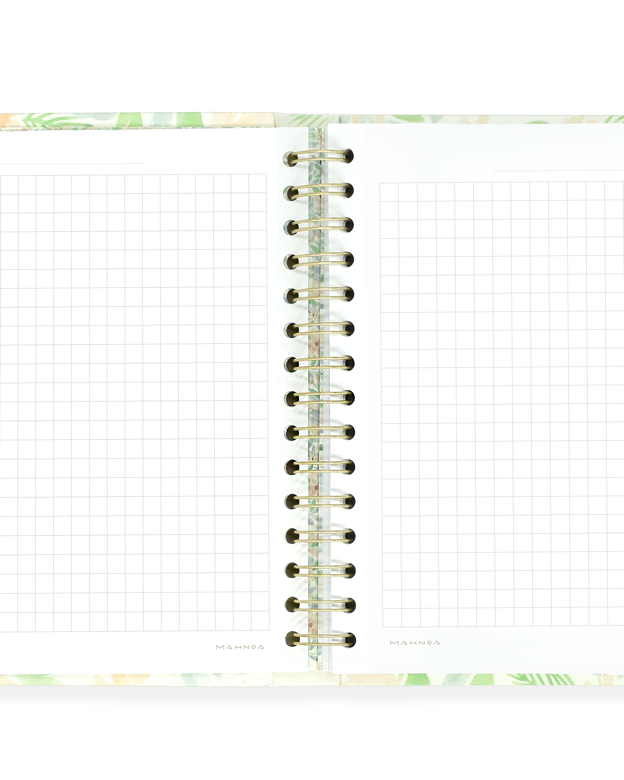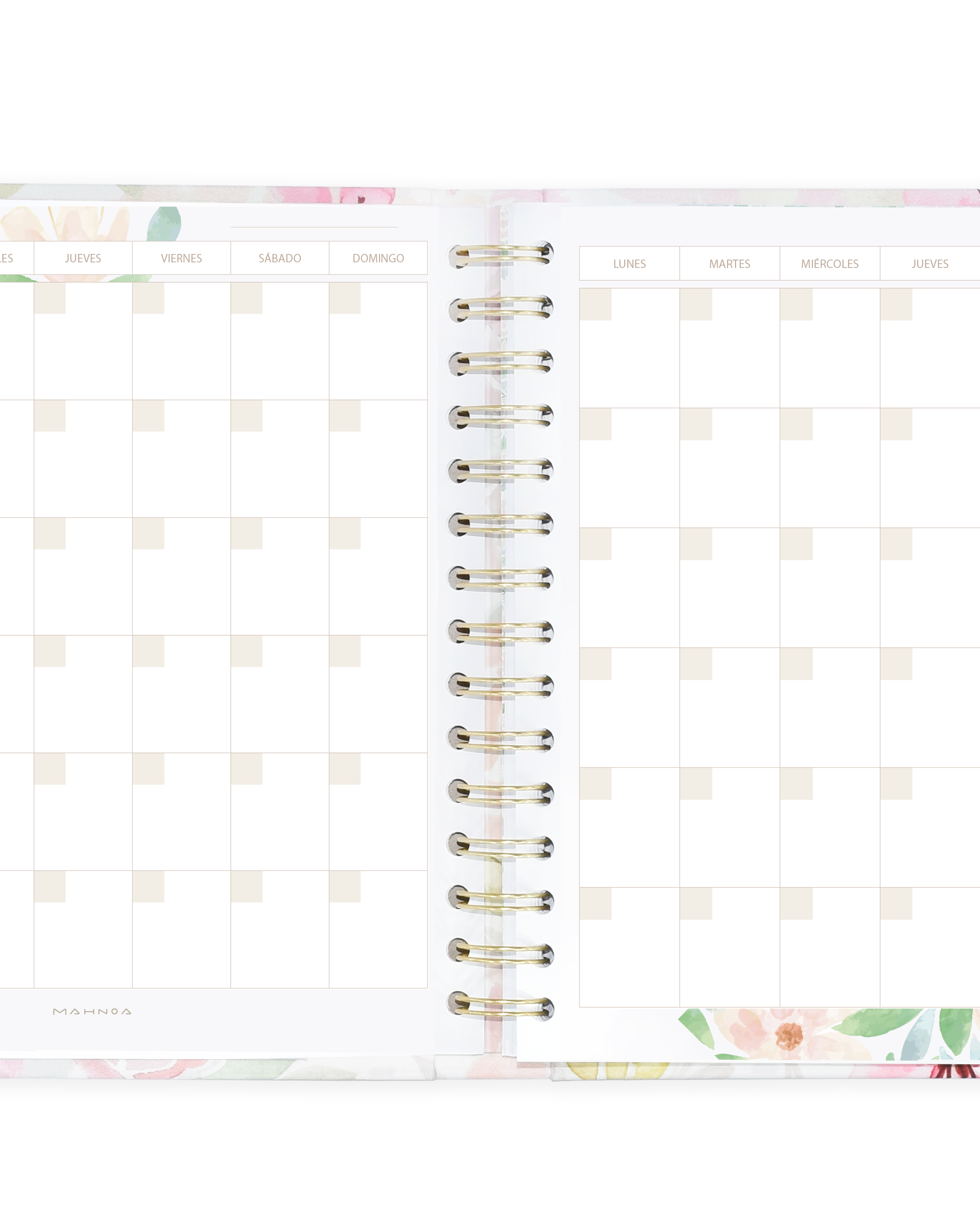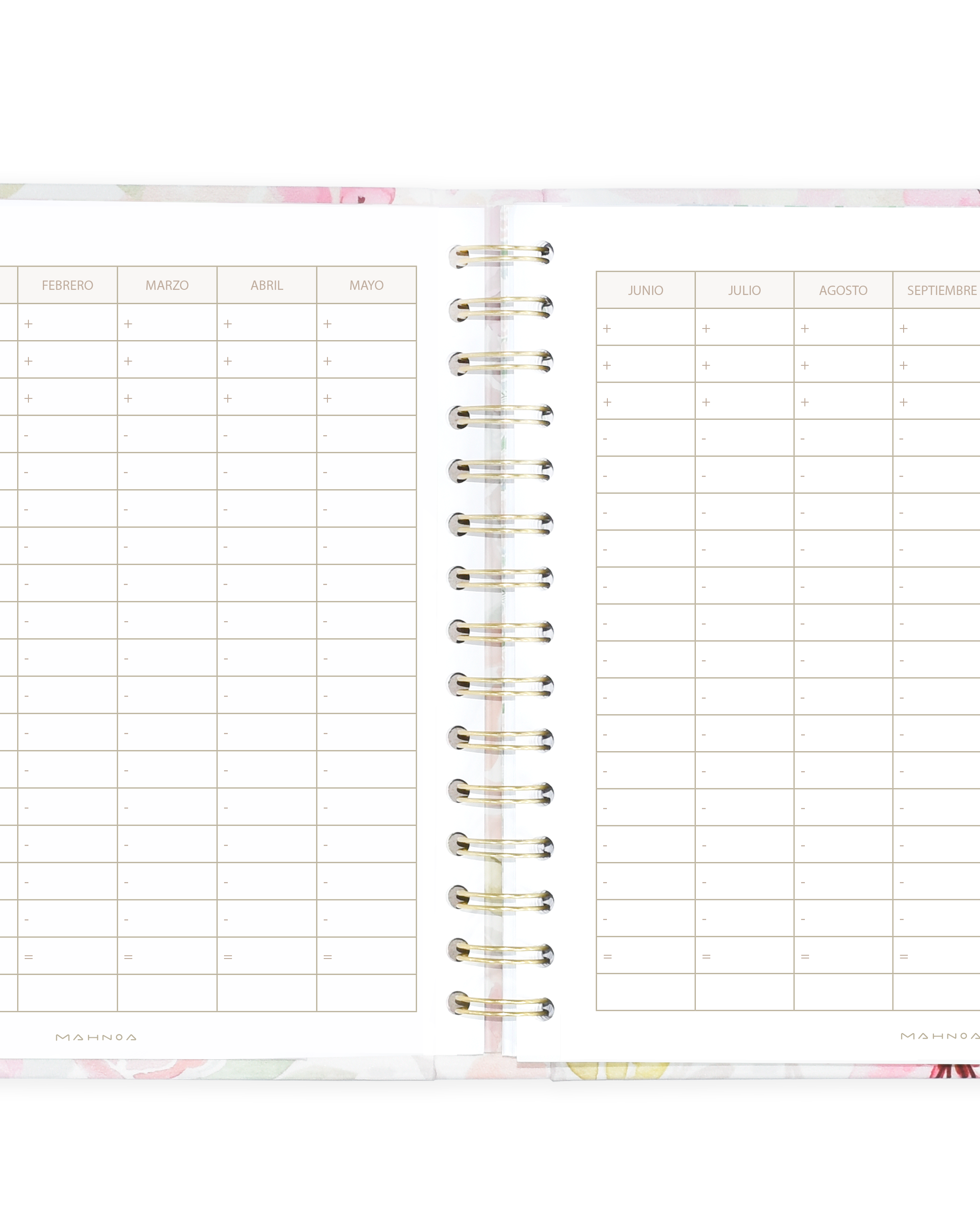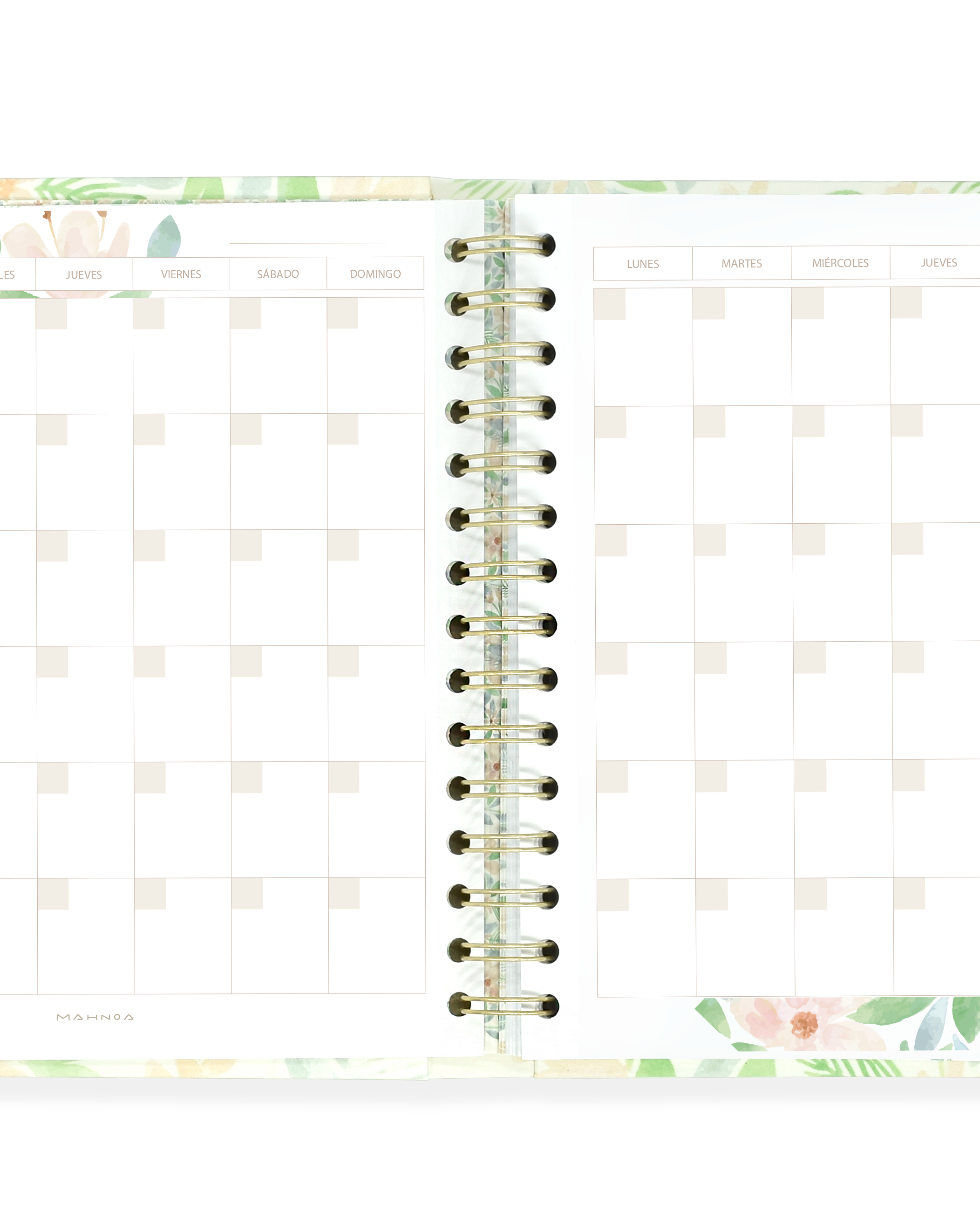 Agenda MANOA® 2026 Semanal con días en horizontal 210 páginas (105 hojas) que incluyen pestañas separadoras mensuales, 40 páginas para notas, hojas de planificación mensual, contraseñas y contactos, horario, planning anual en columnas, objetivos y estrategias personales, control financiero, mis propósitos para el año...