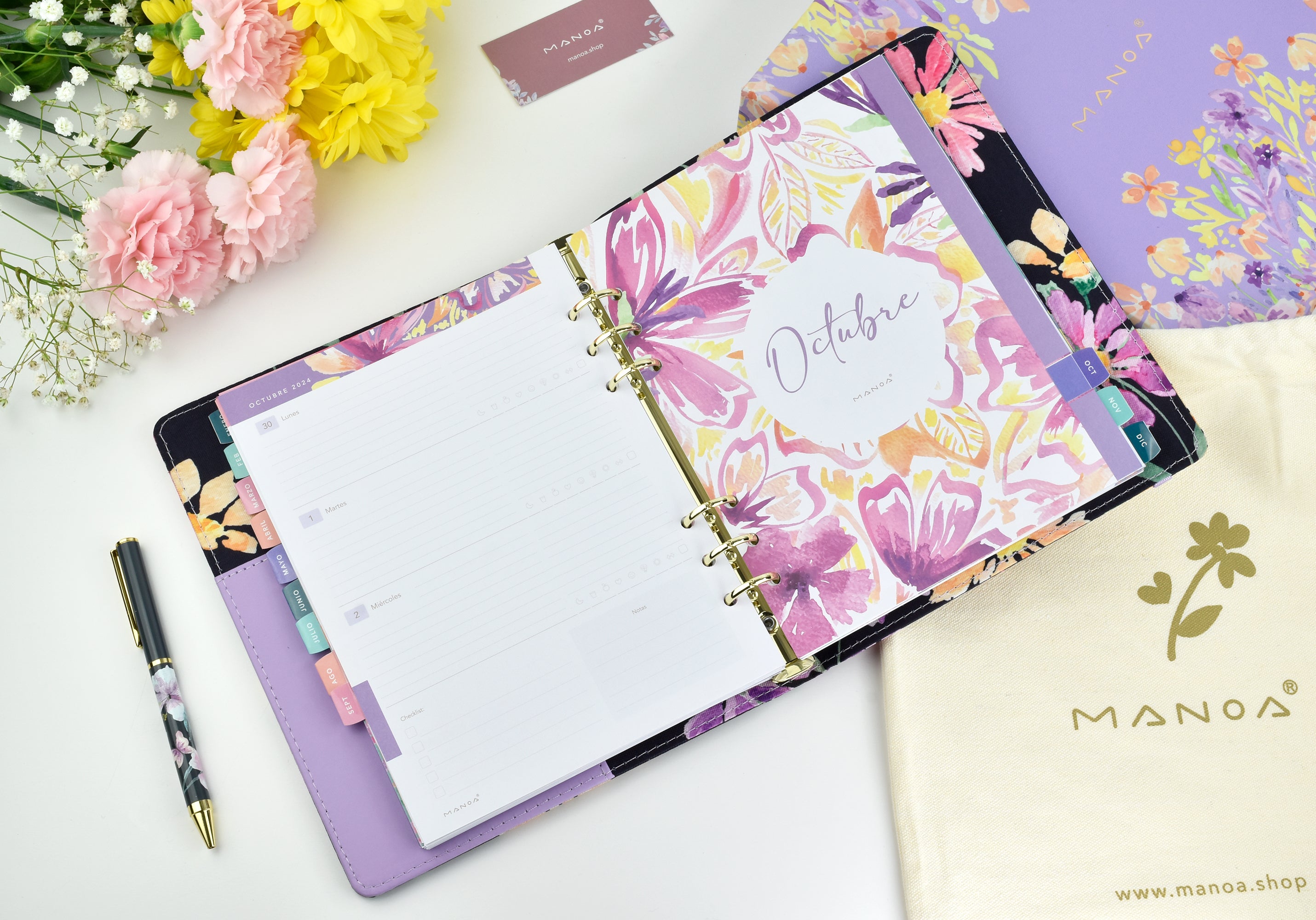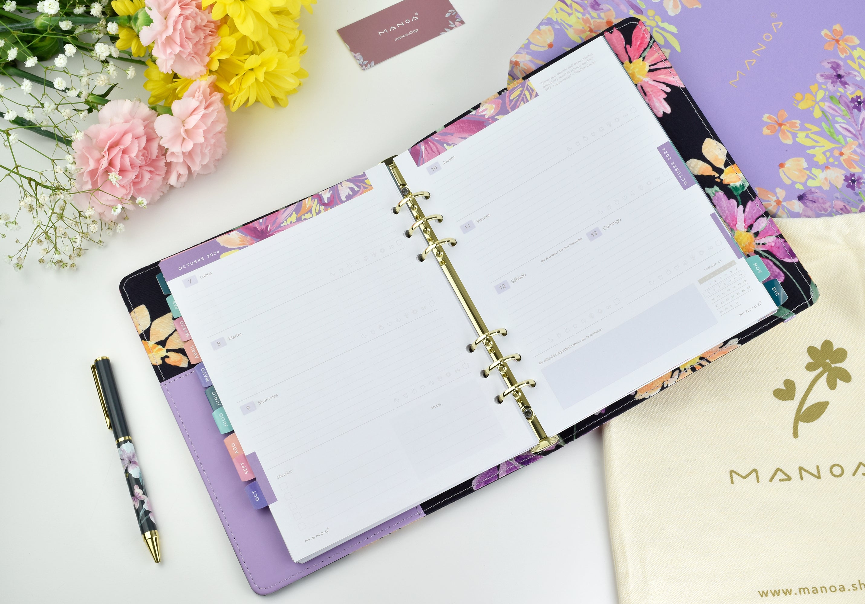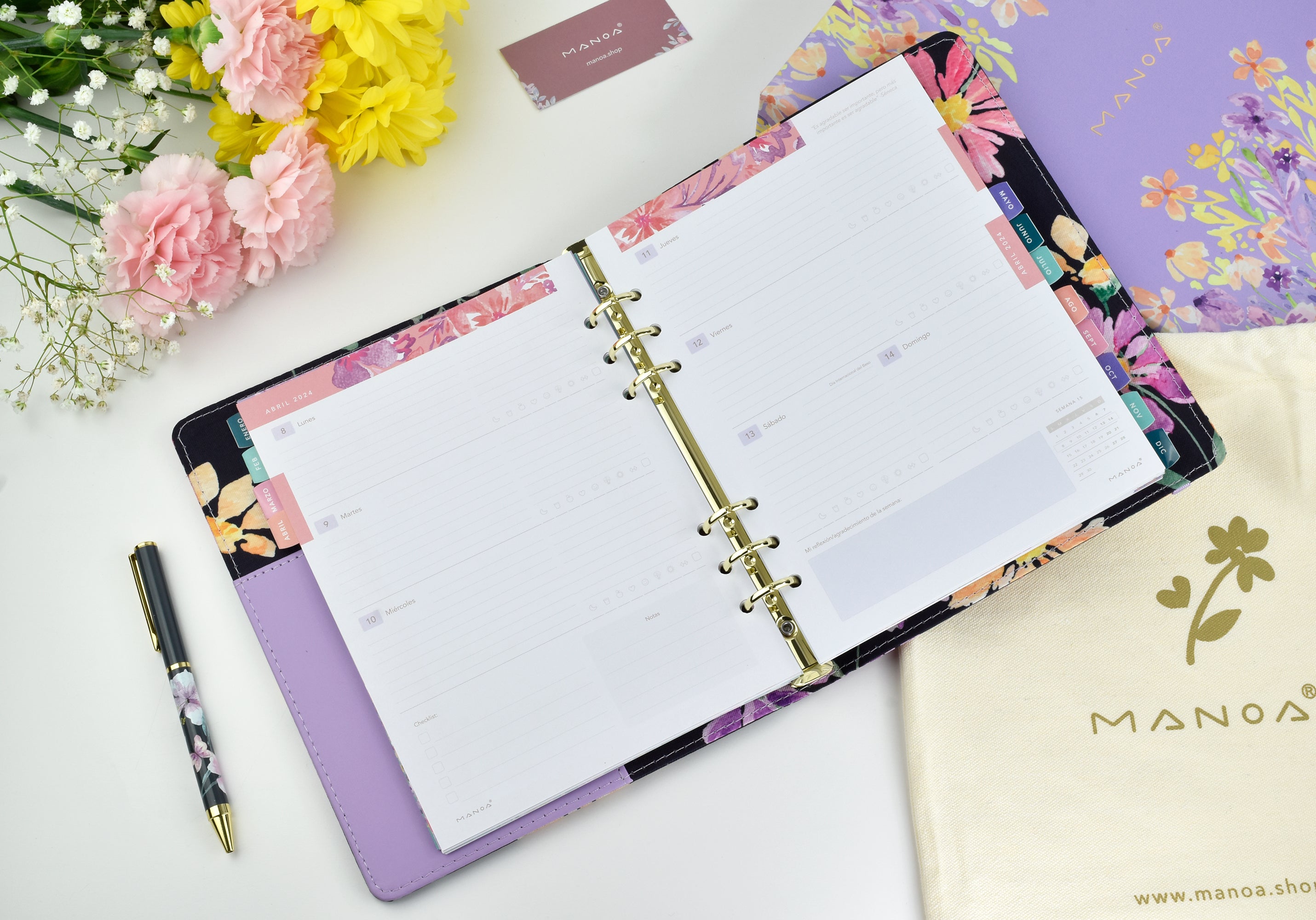 • Agenda MANOA® 2026 Día por Página con franjas horarias 380 páginas (190 hojas) que incluyen  pestañas separadoras mensuales, páginas de planificación mensualcontraseñas y contactos, horario, control menstrual, control financiero, objetivos y estrategias personales, mis propósitos para el año...) >>>(IMPORTANTE: no caben todas las hojas de este pack, tendrás que llevar solo unos meses).>>>