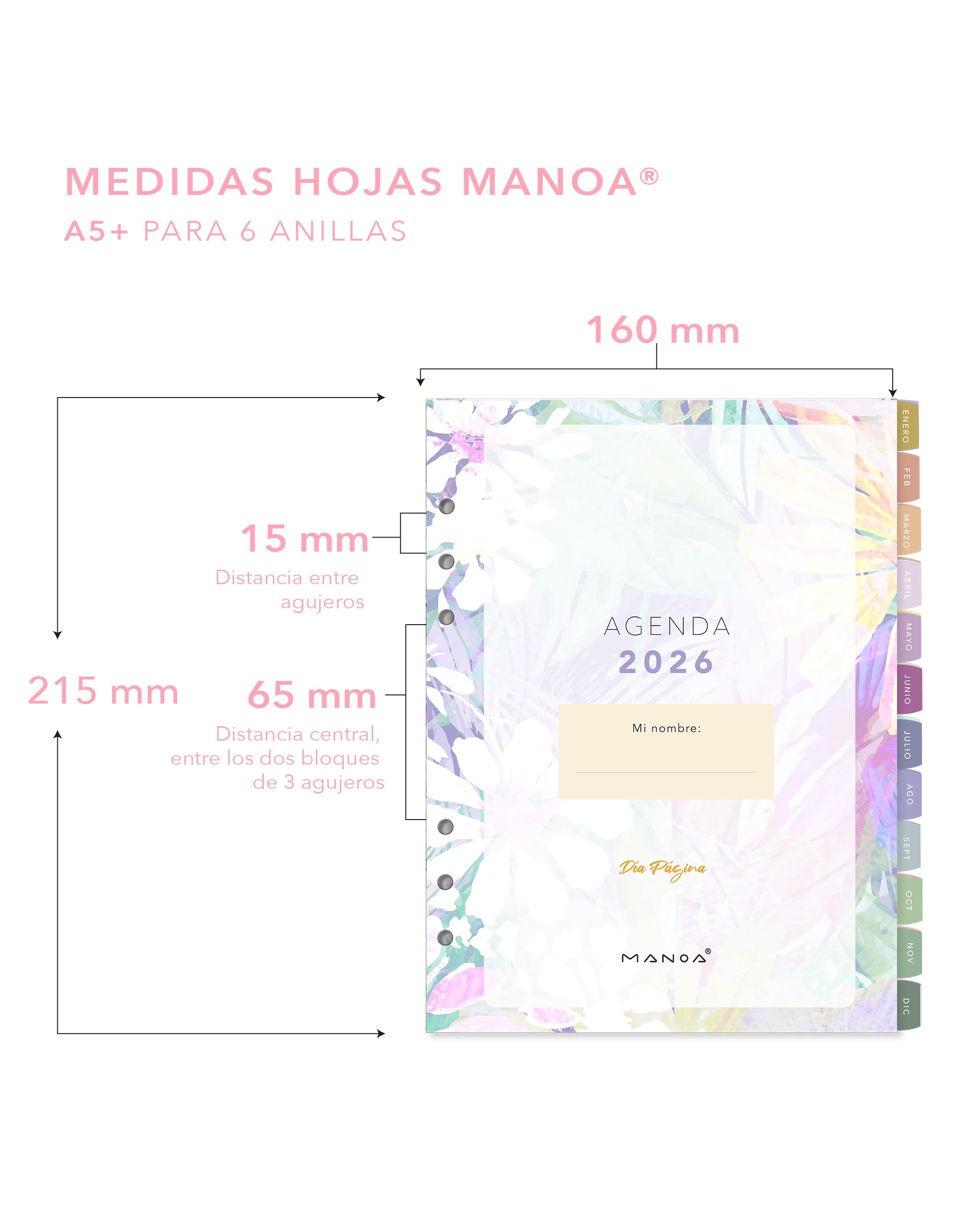 • Medidas: A5+ (160 x 215 mm) con 6 agujeros para planner y cover MANOA®.