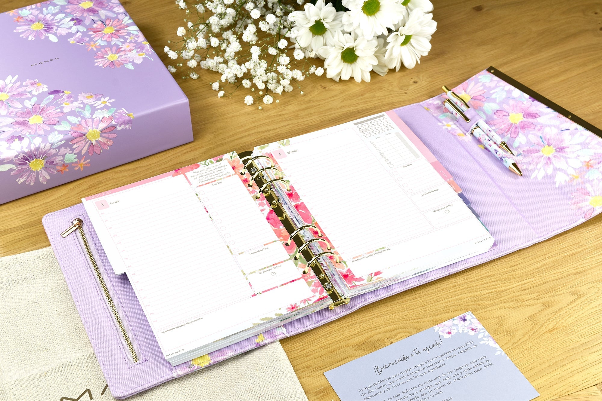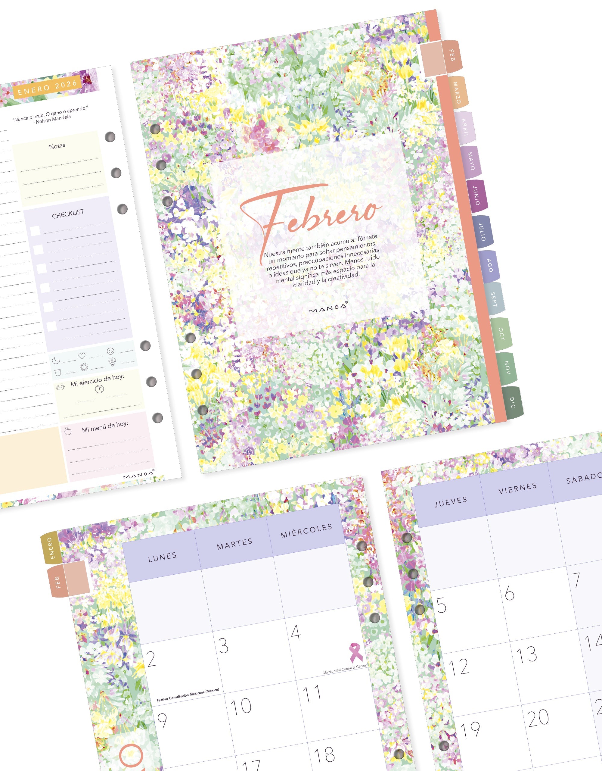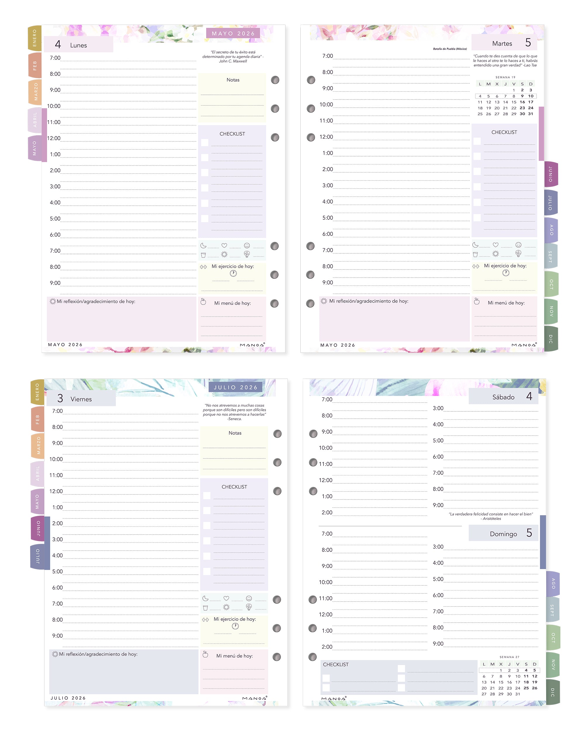 • Agenda día por página con impresión a todo color. Cada mes tiene un diseño distinto pintado con acuarelas y un mensaje motivacional.