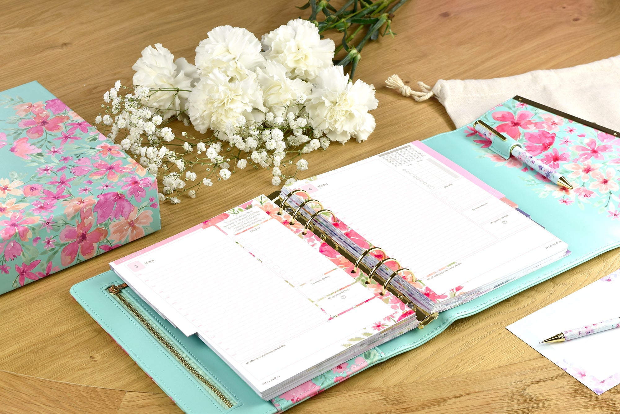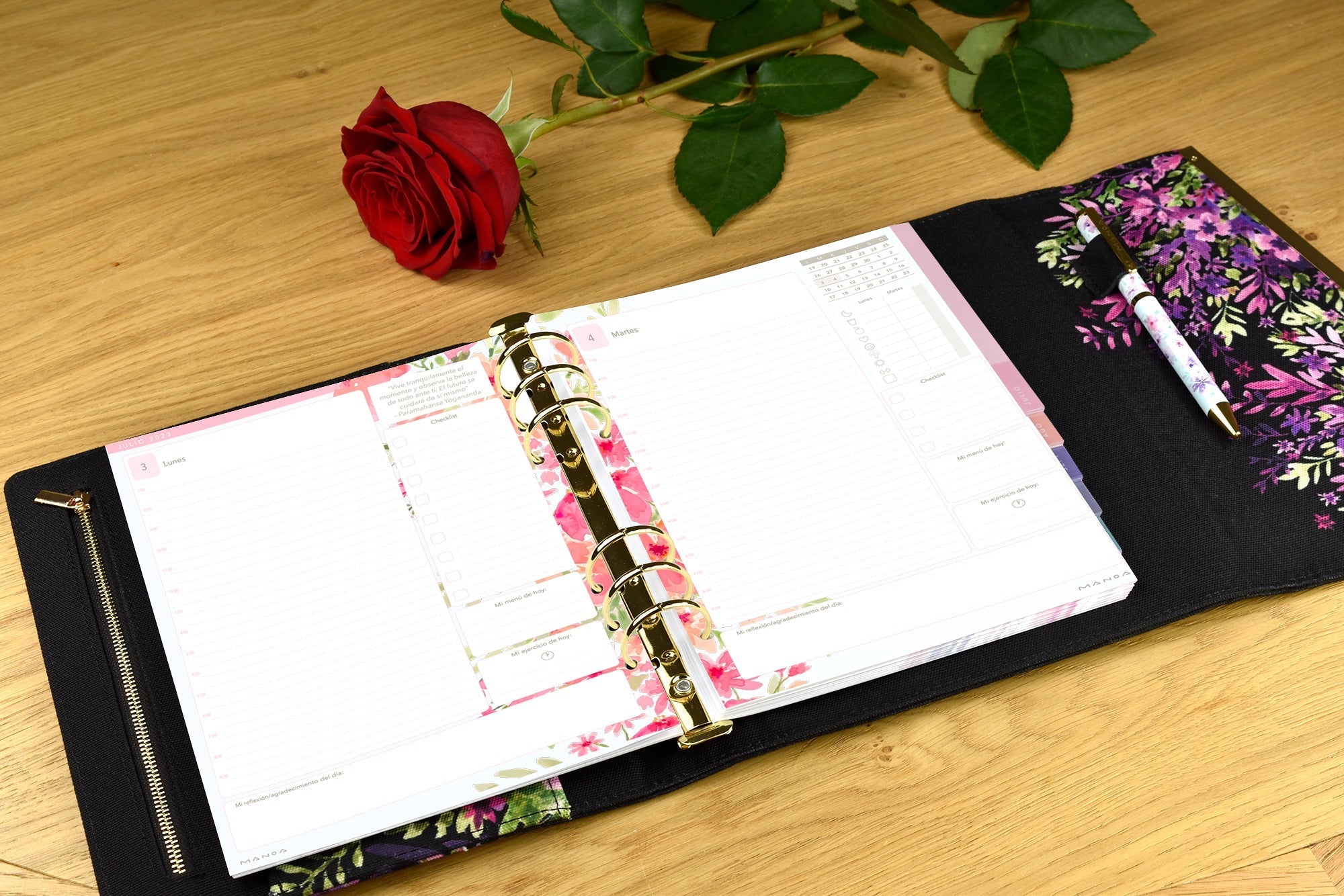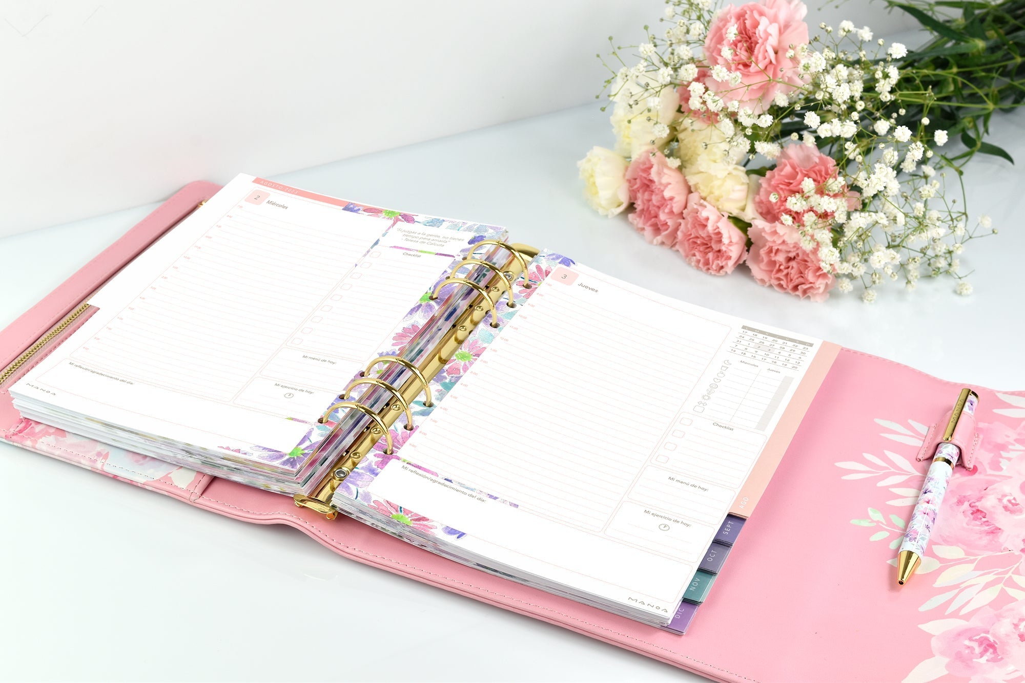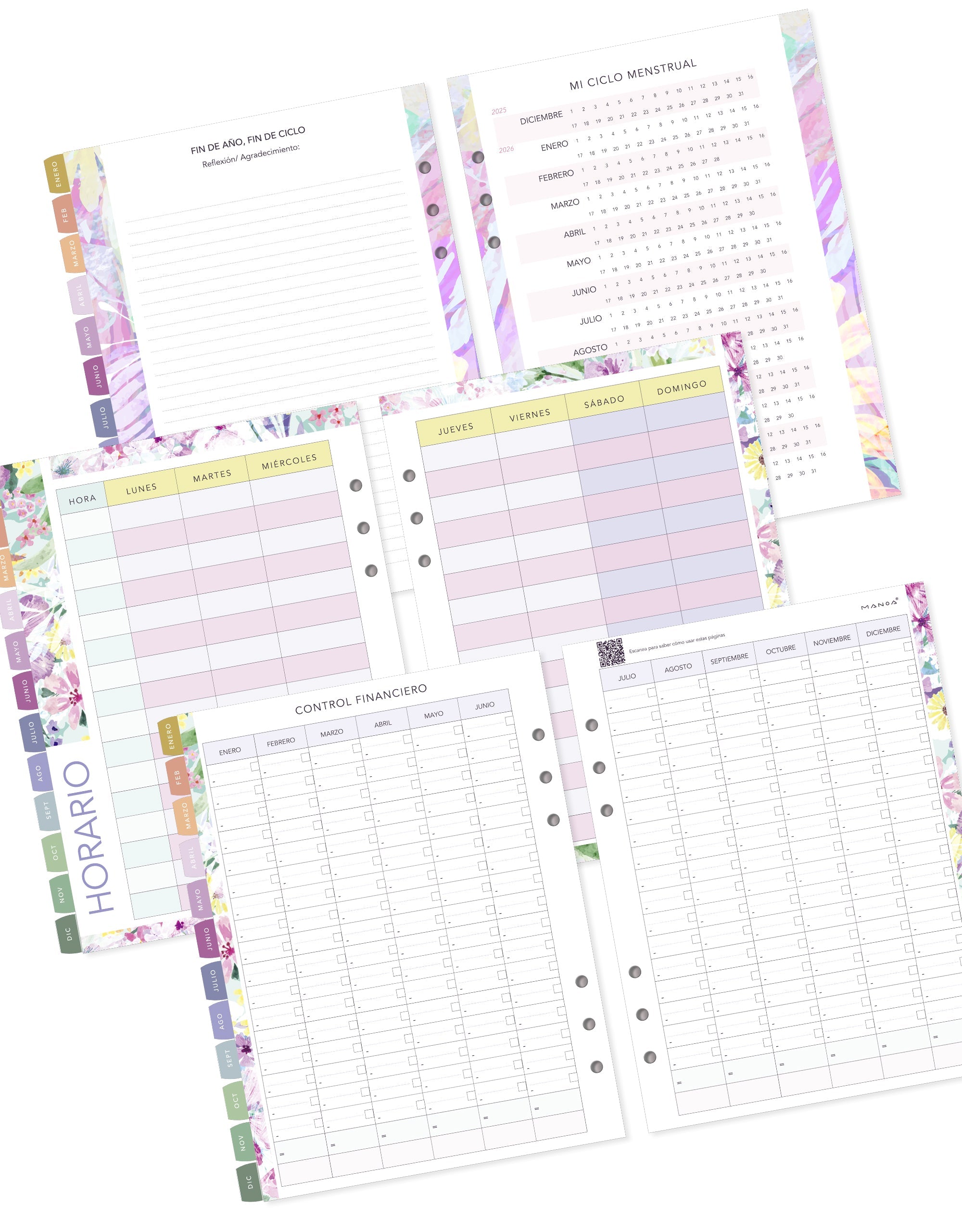 • Incluye hojas de planificación mensual, control financiero, página de horario, mapa de objetivos y estrategias, control menstrual y planning anual en columnas.