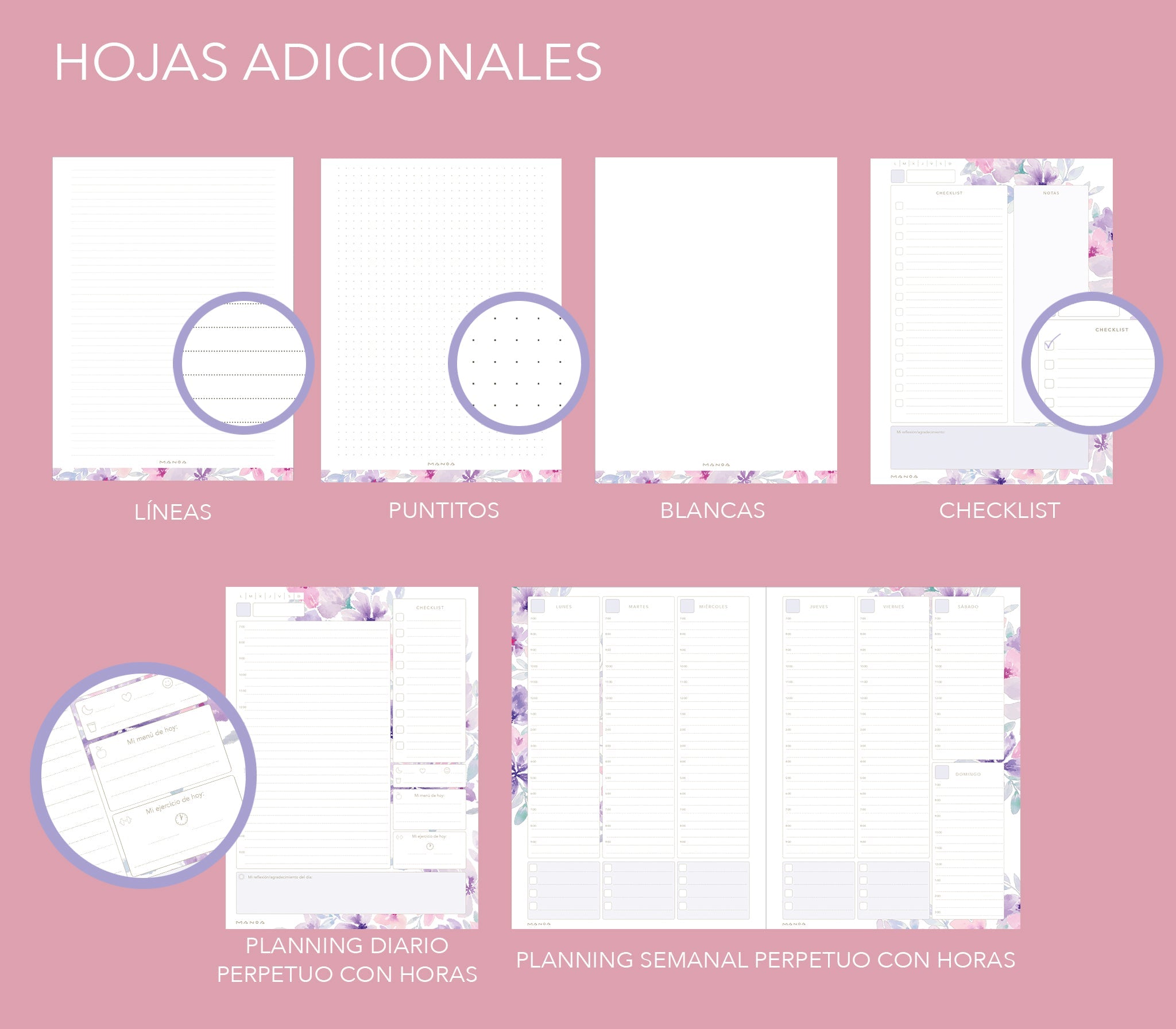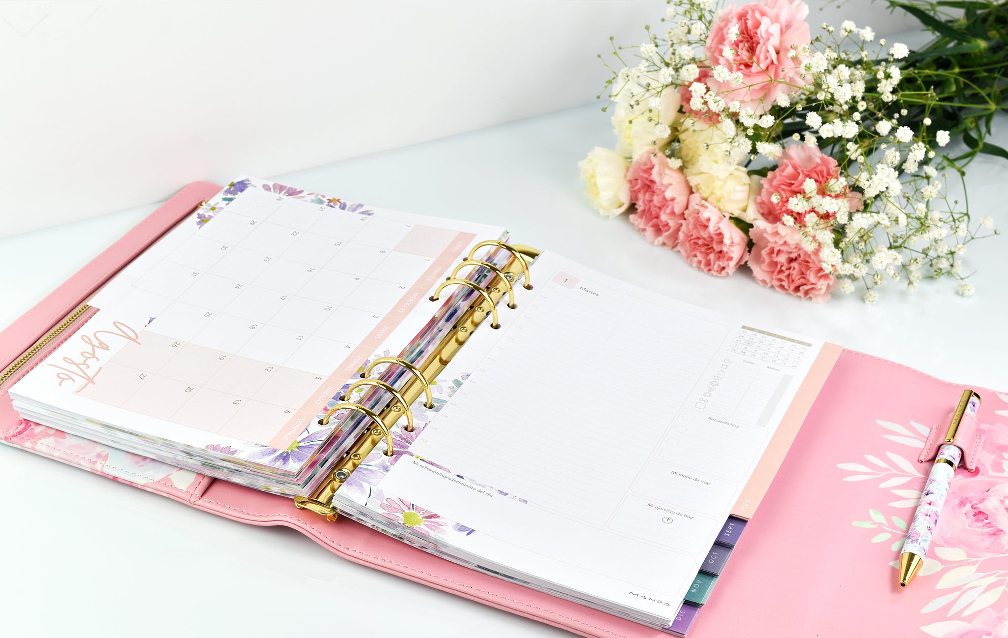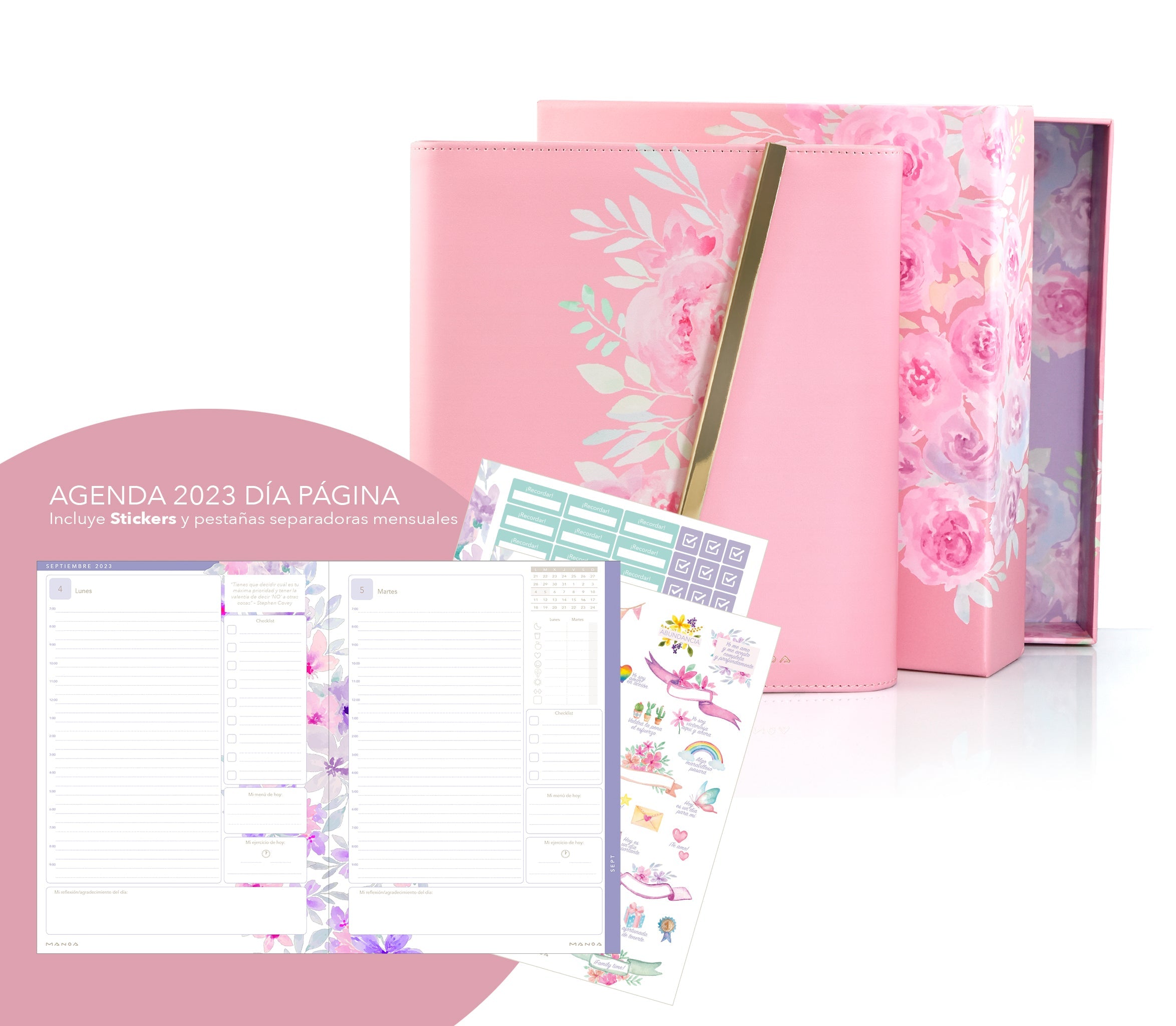 • Agenda MANOA® 2025 Día por Página con franjas horarias 364 páginas (182 hojas) que incluyen  pestañas separadoras mensuales, páginas de planificación mensualcontraseñas y contactos, horario, control menstrual, control financiero, objetivos y estrategias personales, mis propósitos para el año...)