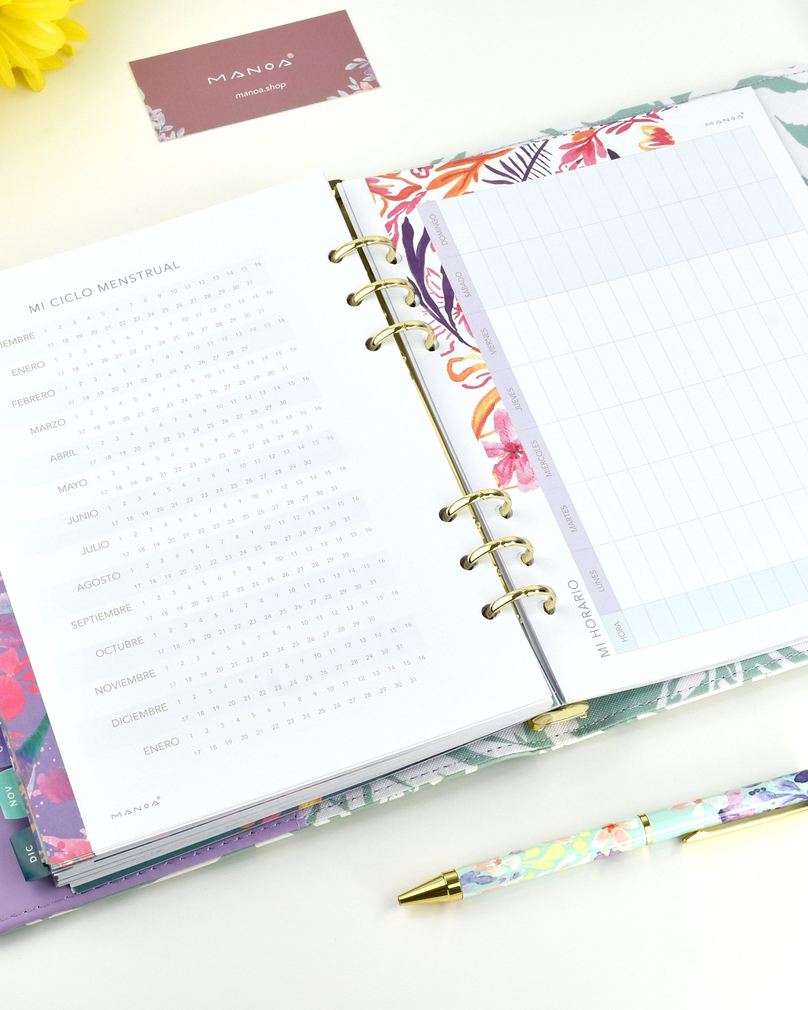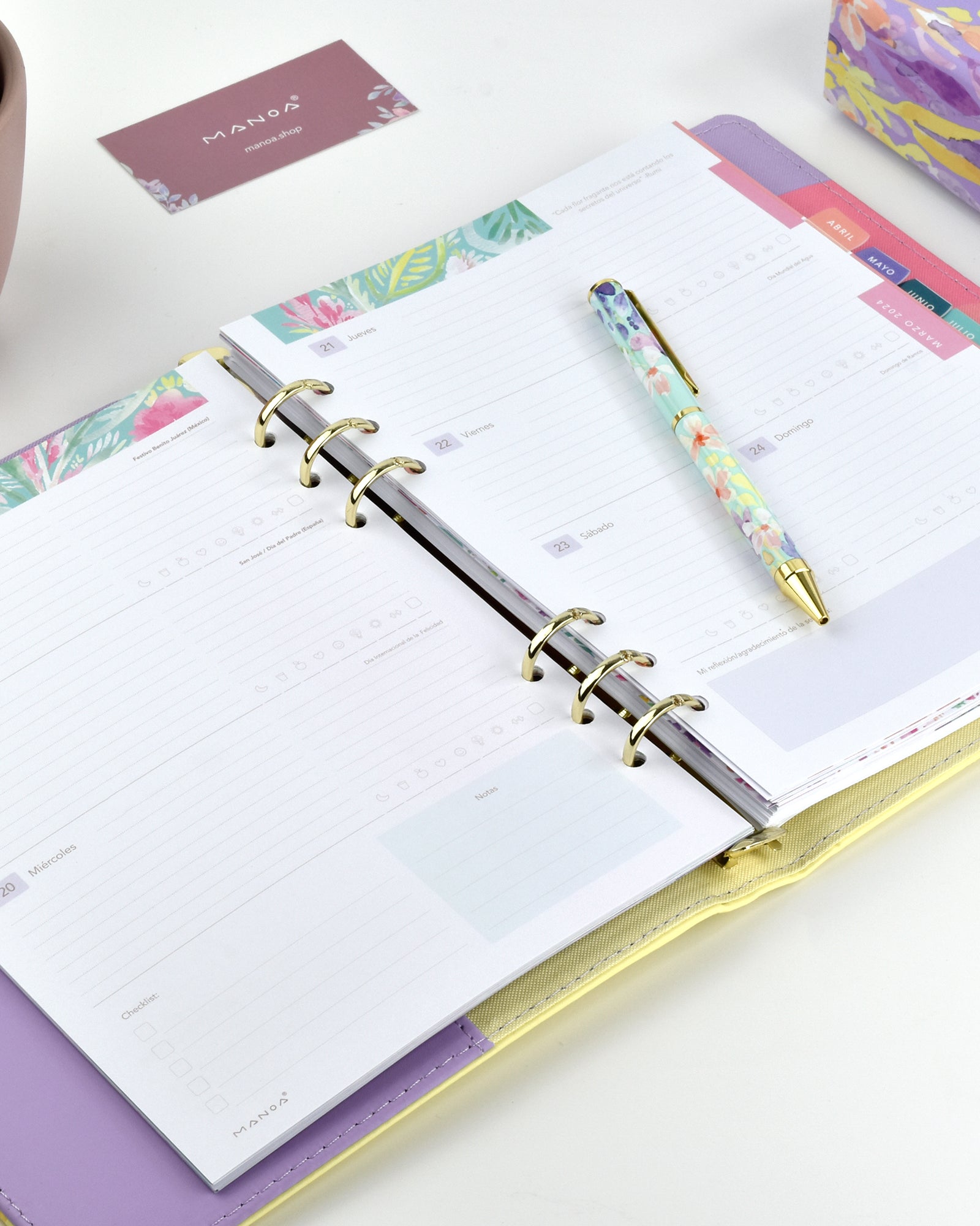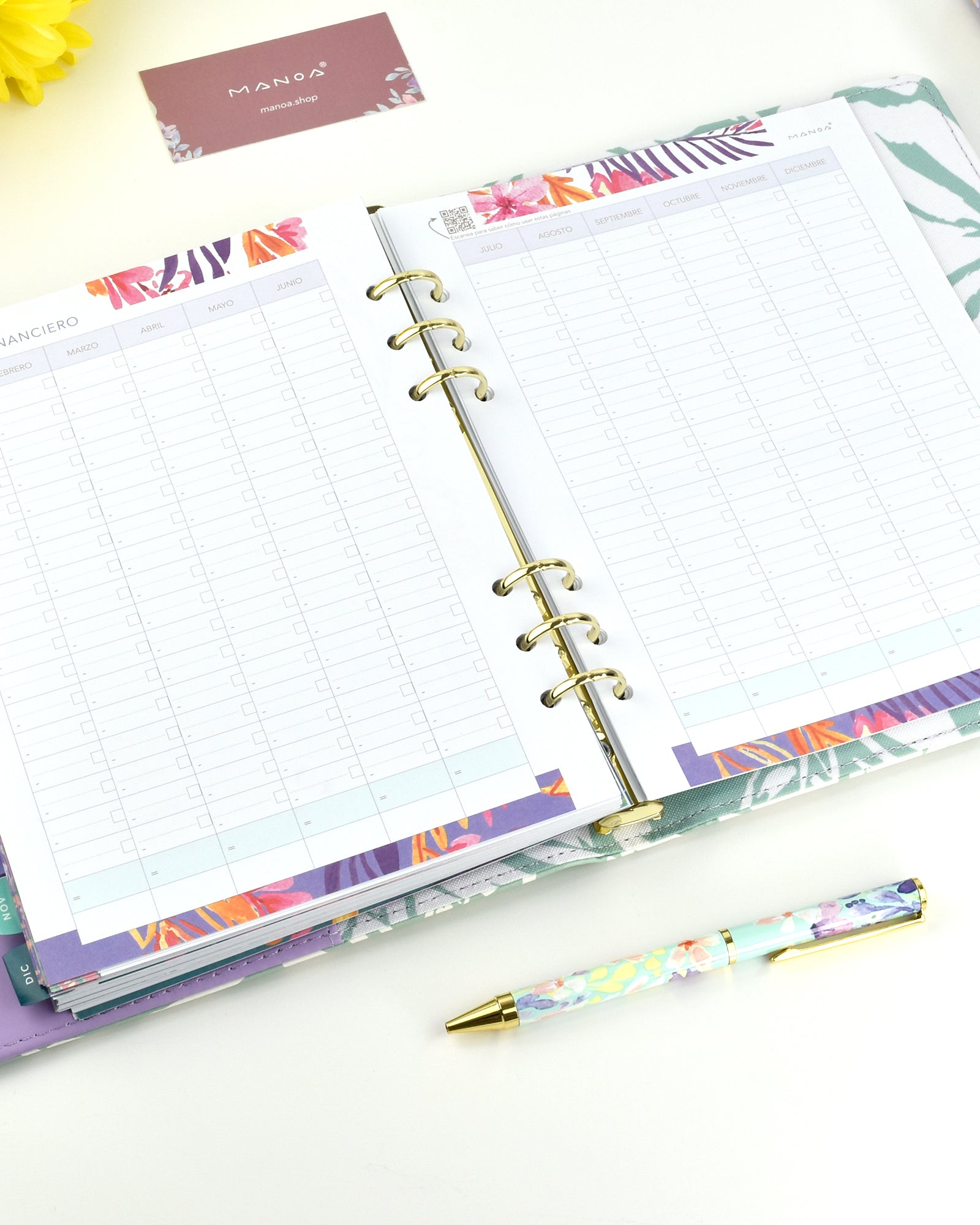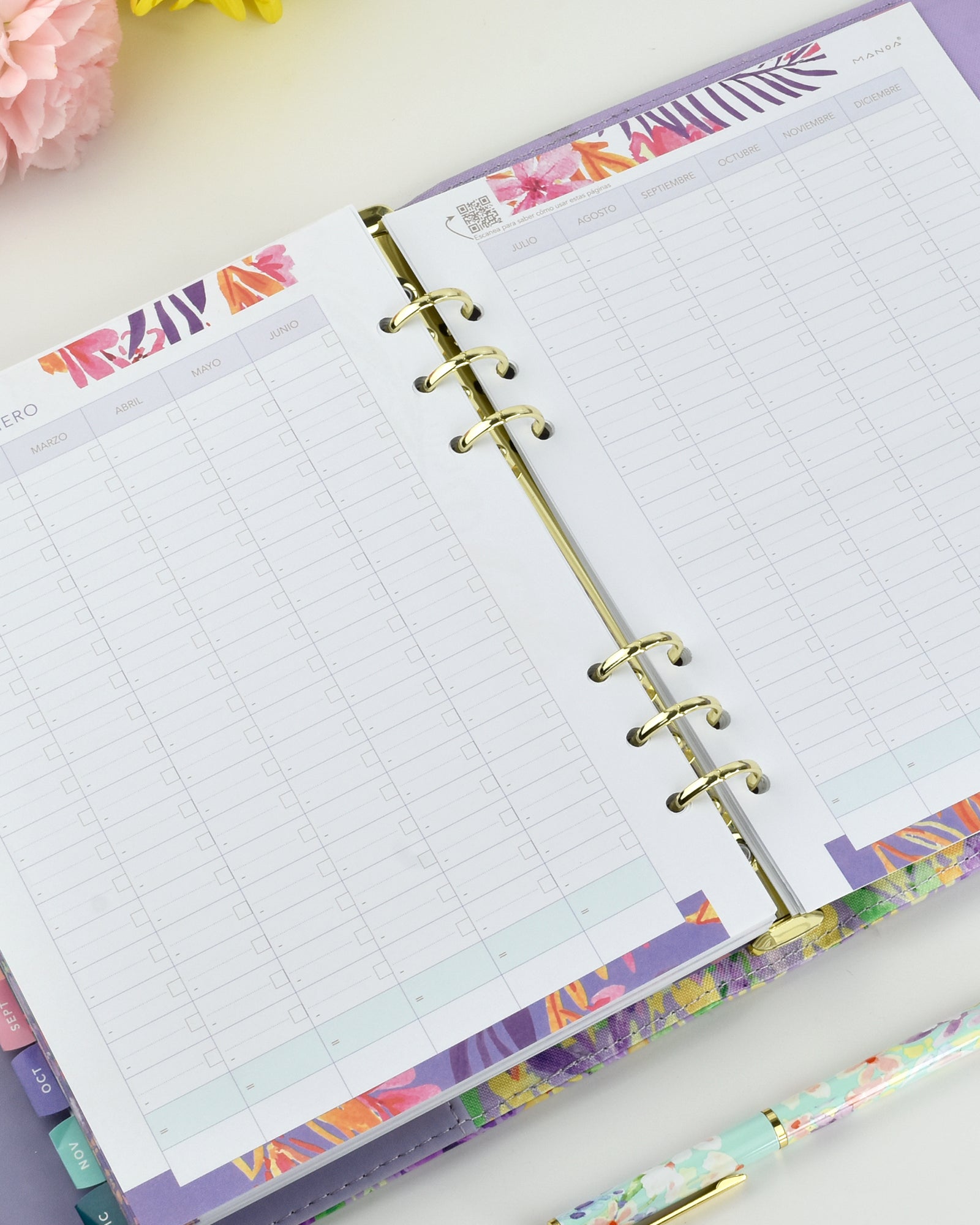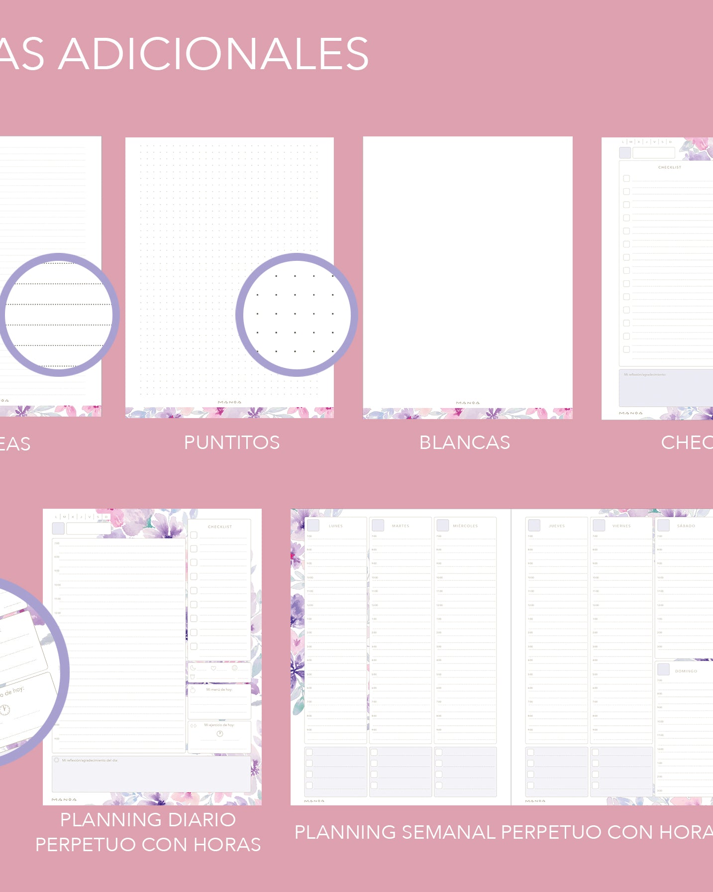 - Incluye hojas para Notas de líneas y puntitos (40 páginas), hojas de planificación mensual, control financiero, control de gastos e ingresos para cada mes, planning anual en columnas, página de horario, control menstrual, contraseñas y mapa de objetivos.