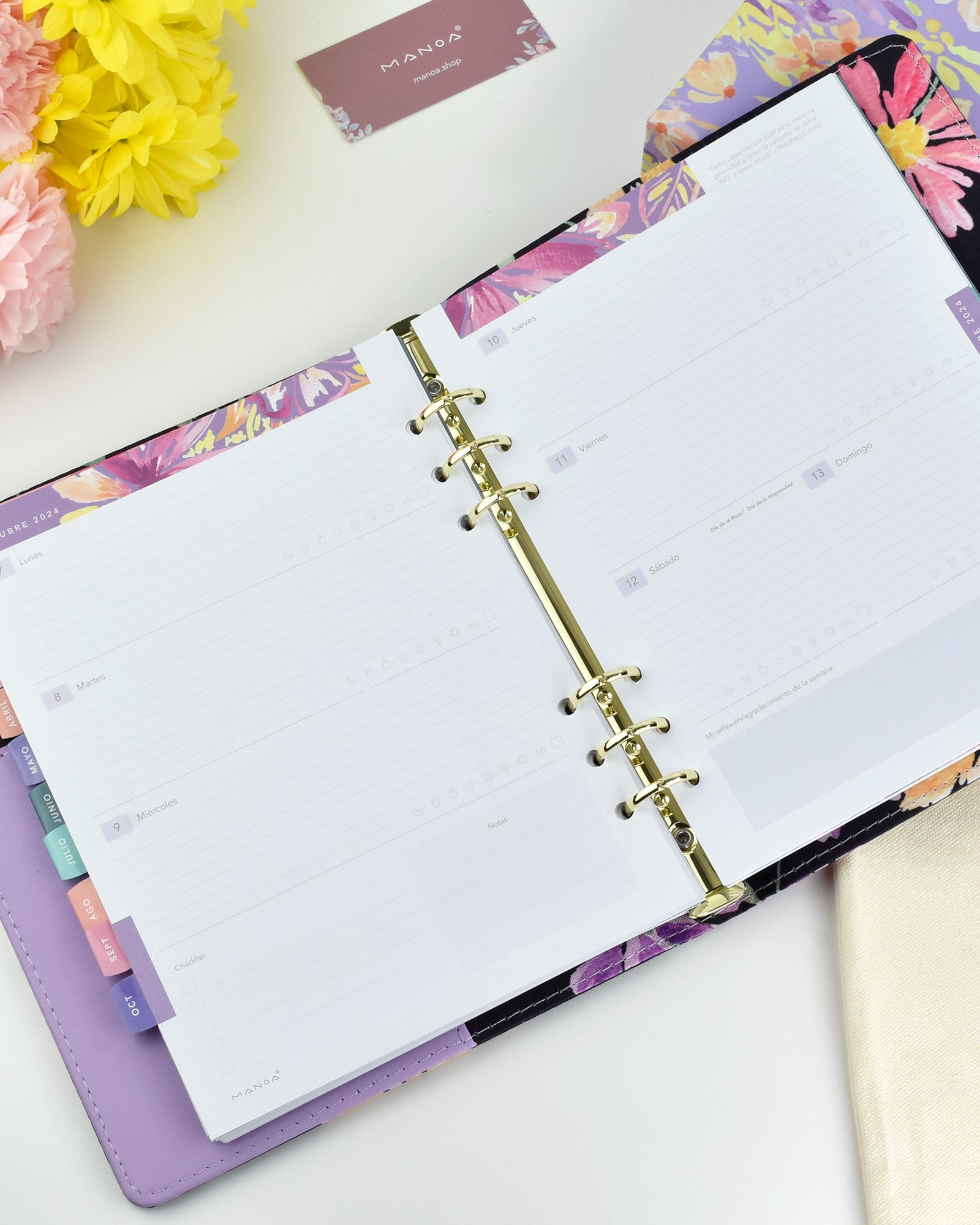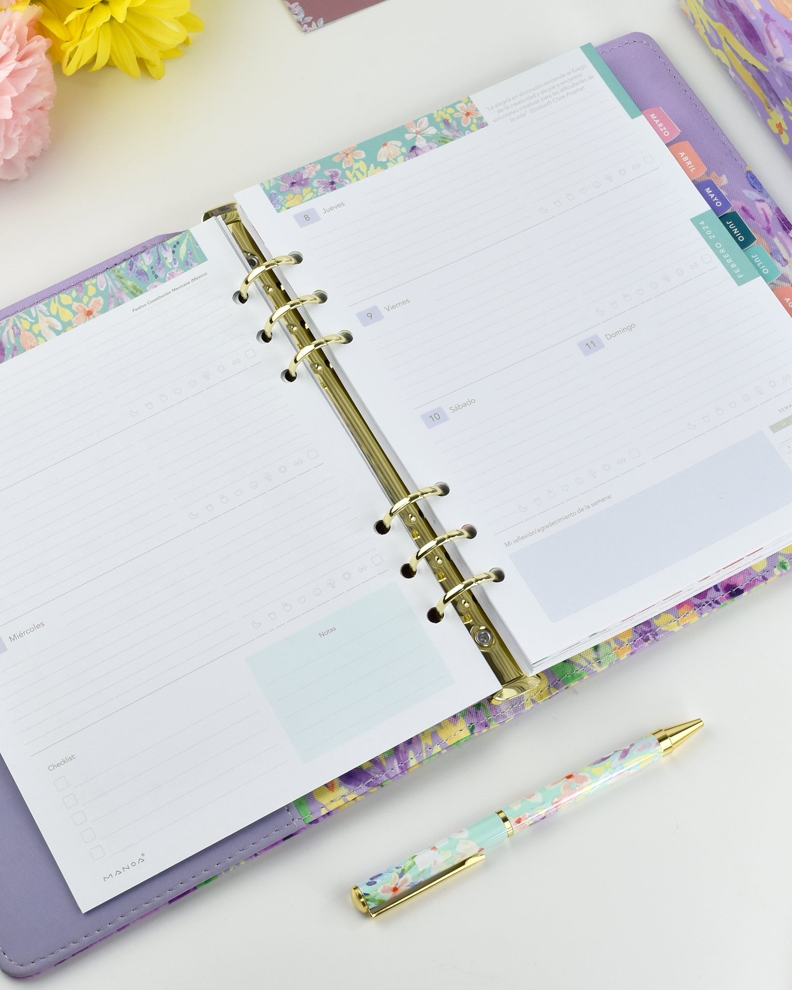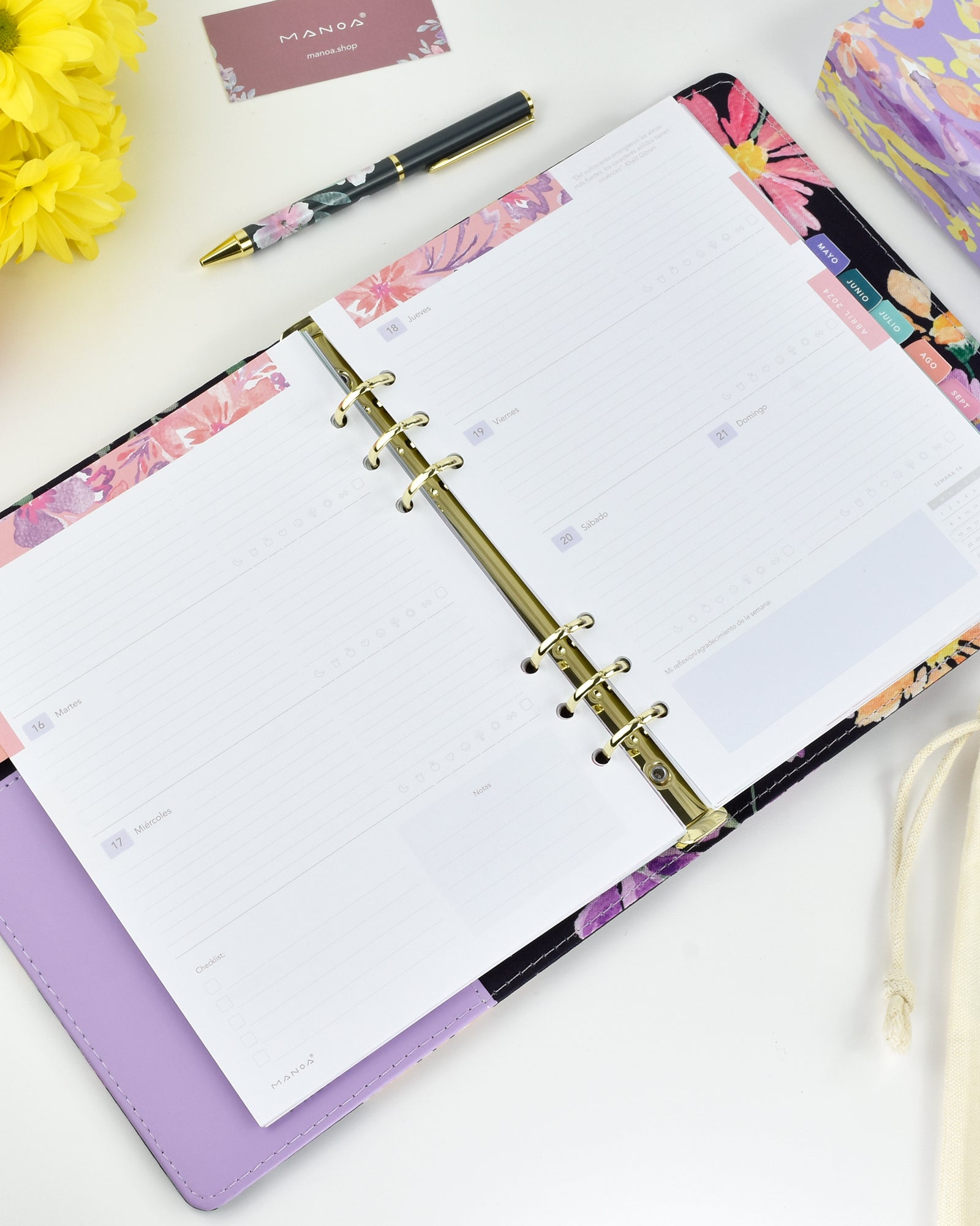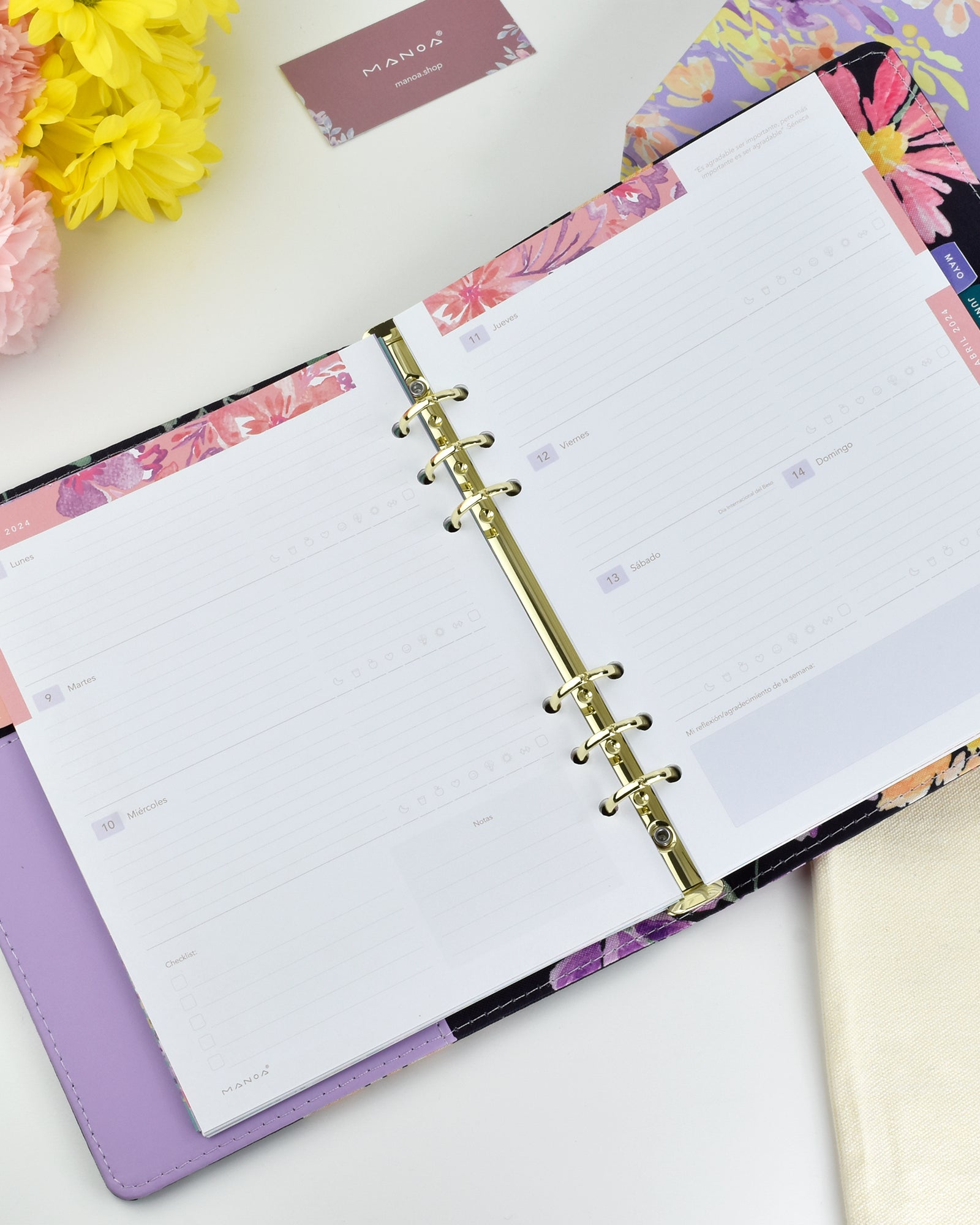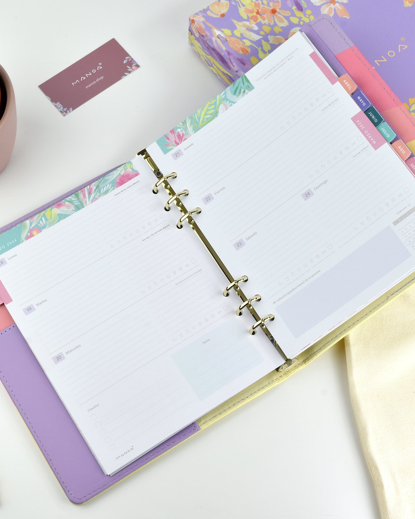 - Incluye hojas para Notas de líneas y puntitos (40 páginas), hojas de planificación mensual, control financiero, control de gastos e ingresos para cada mes, planning anual en columnas, página de horario, control menstrual, contraseñas y mapa de objetivos.