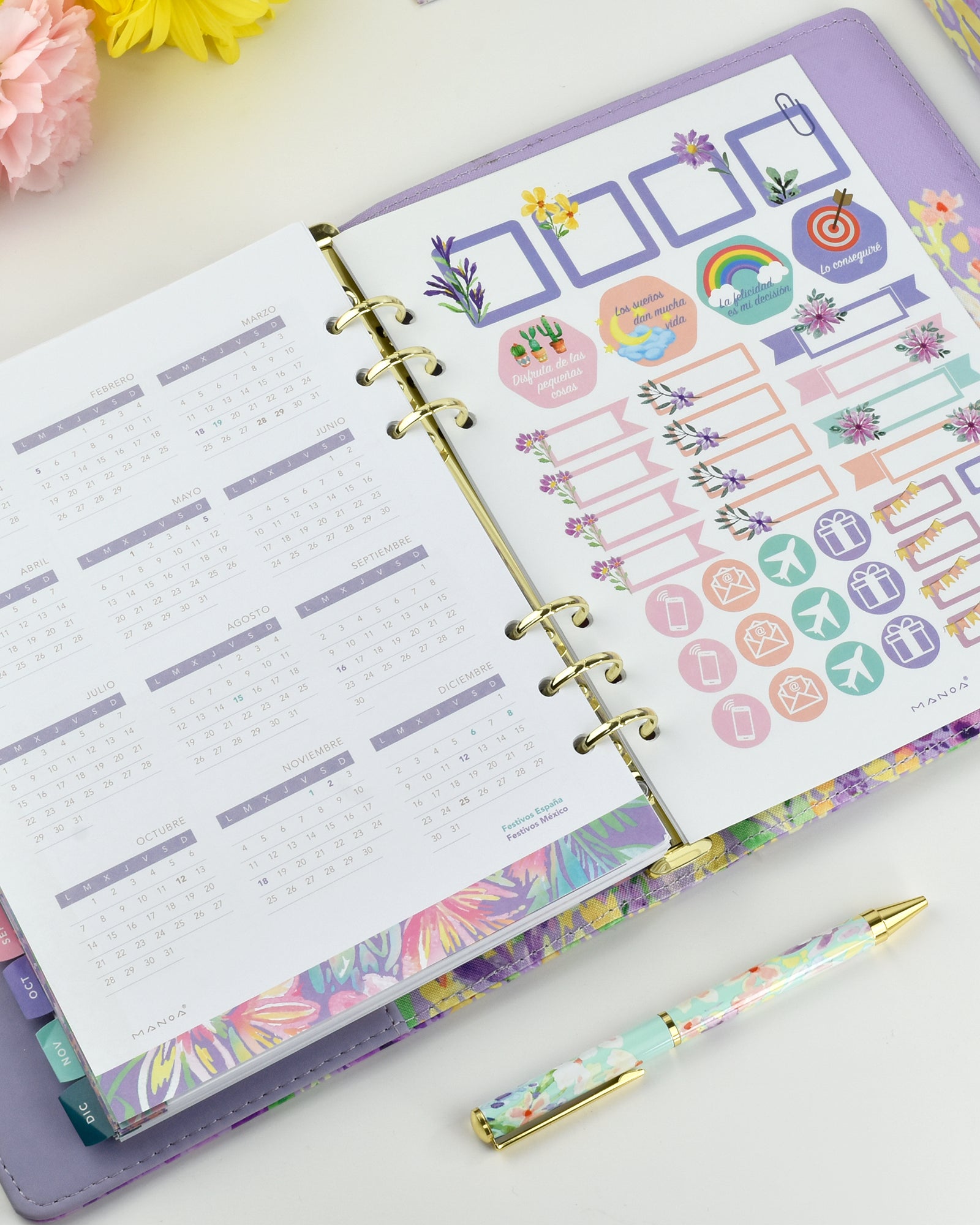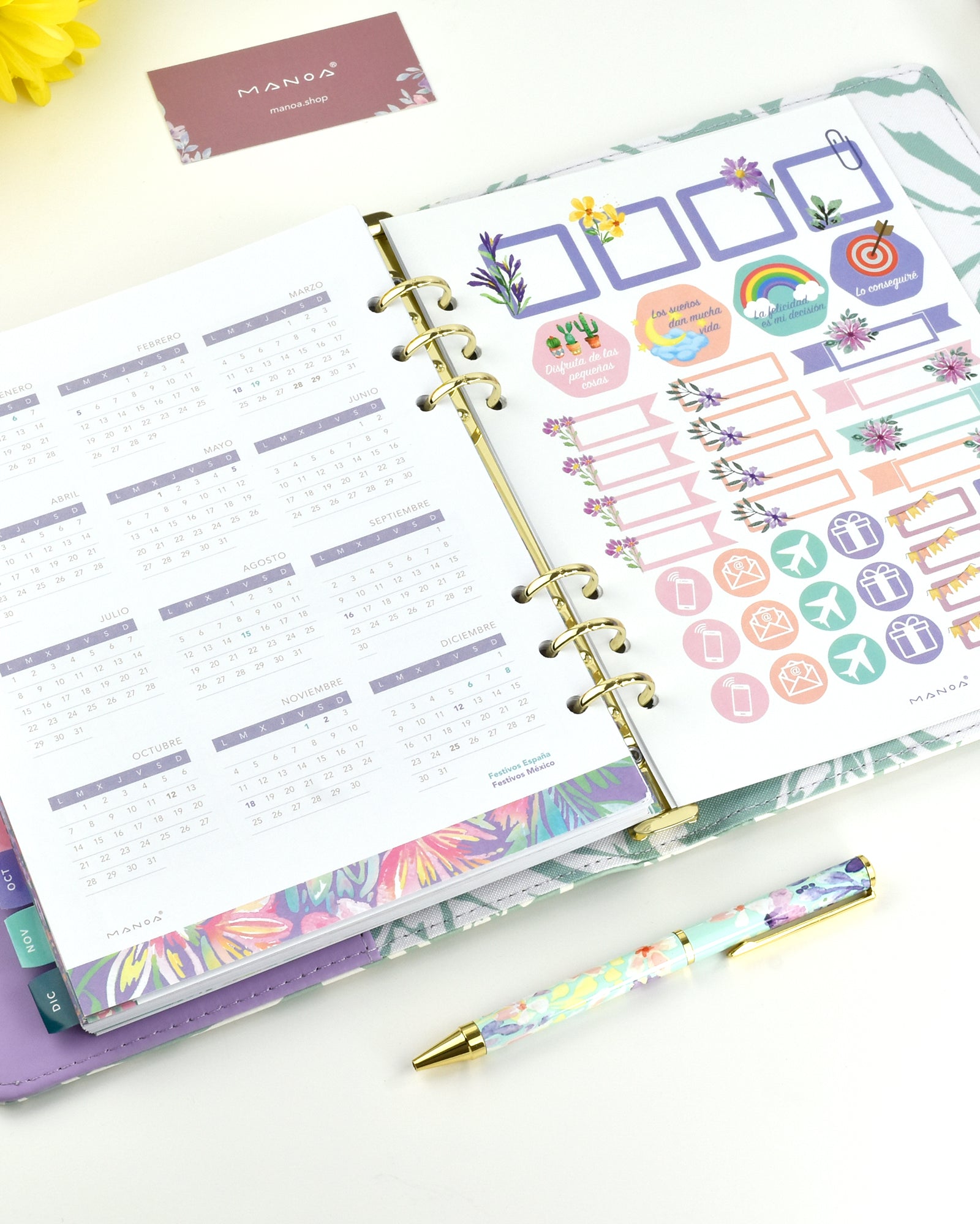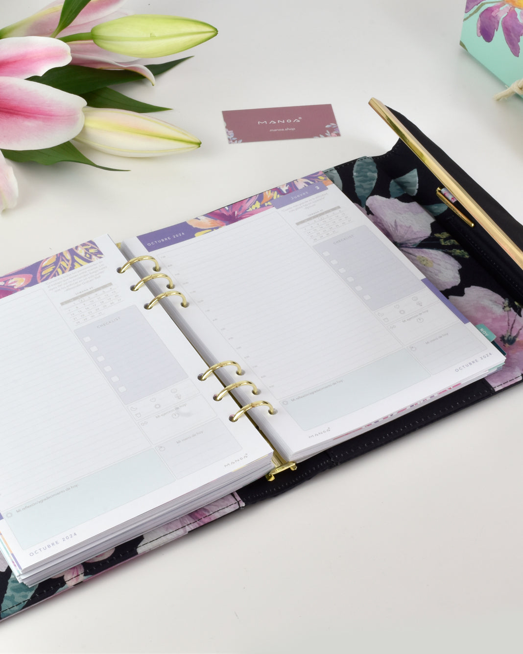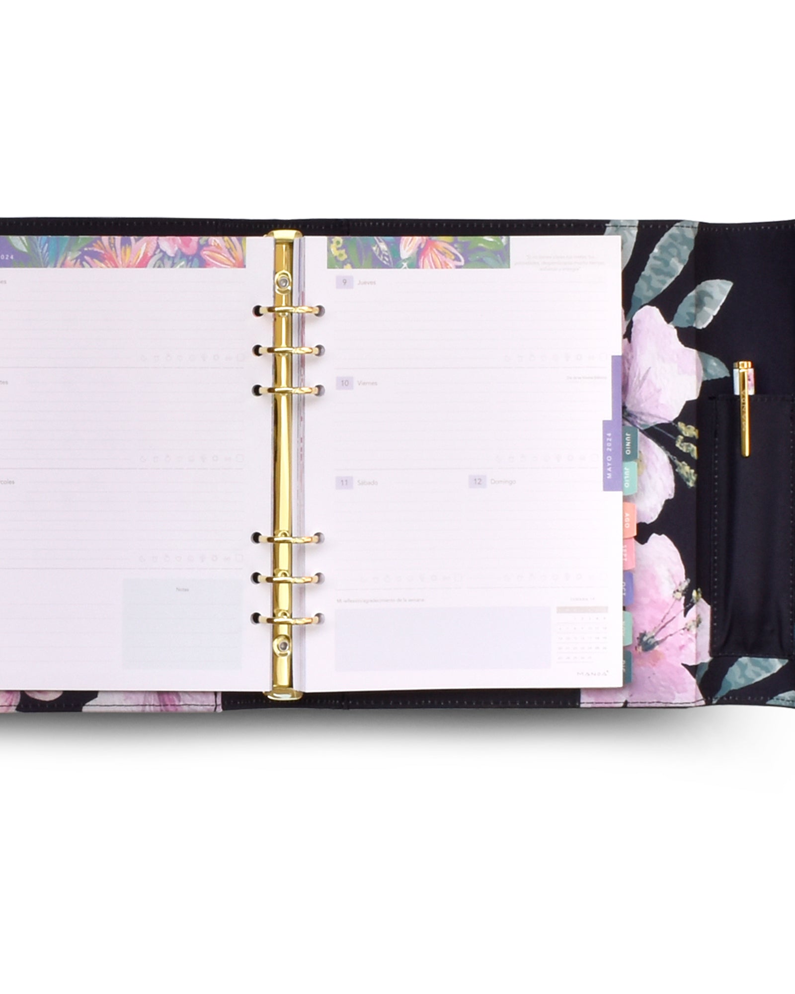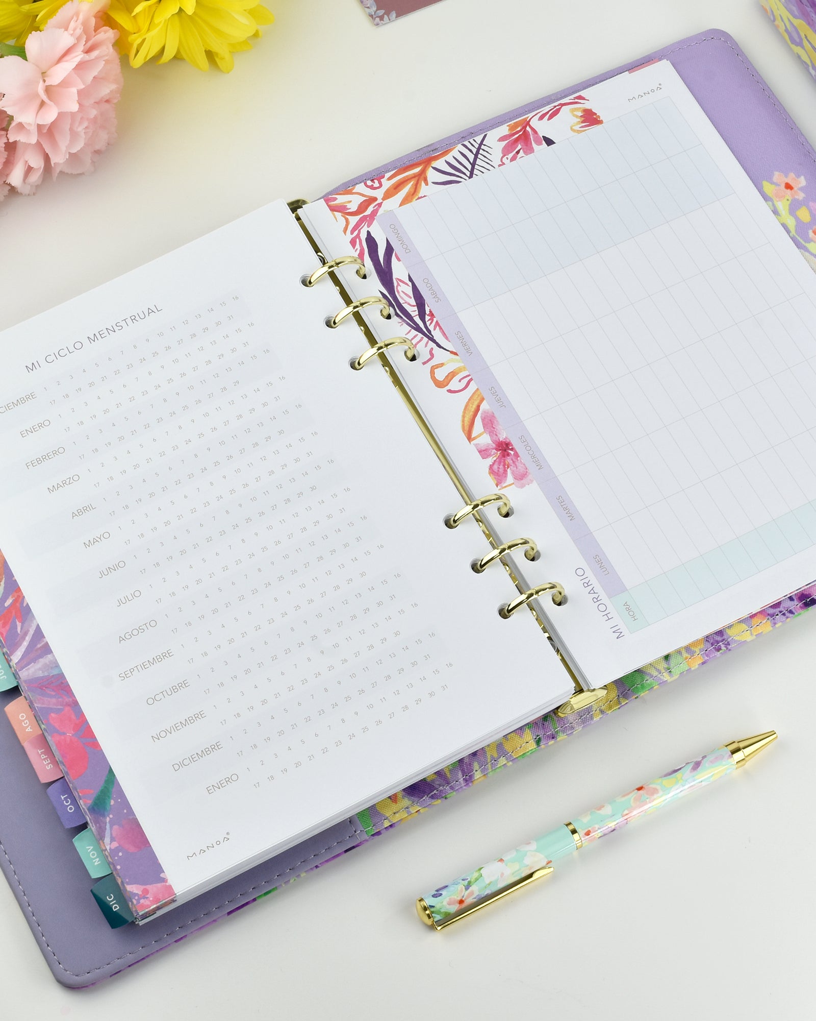 - Incluye hojas para Notas de líneas y puntitos (40 páginas), hojas de planificación mensual, control financiero, control de gastos e ingresos para cada mes, planning anual en columnas, página de horario, control menstrual, contraseñas y mapa de objetivos.