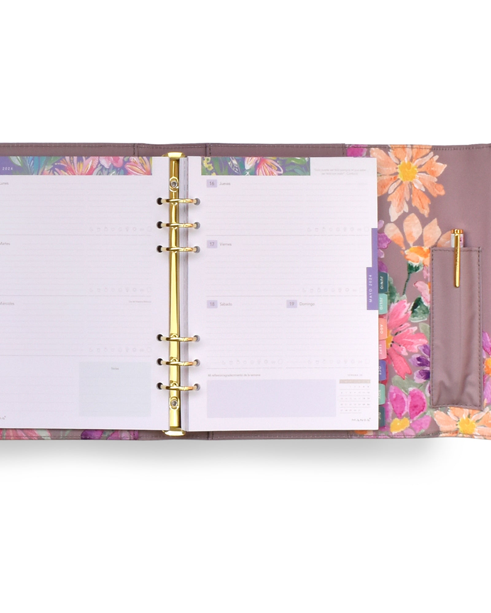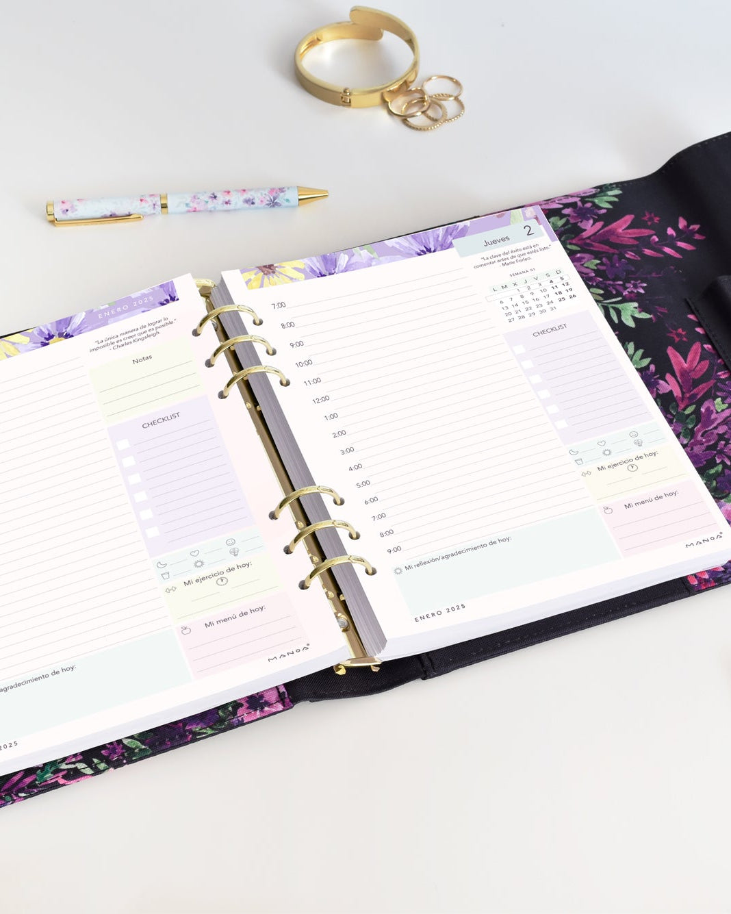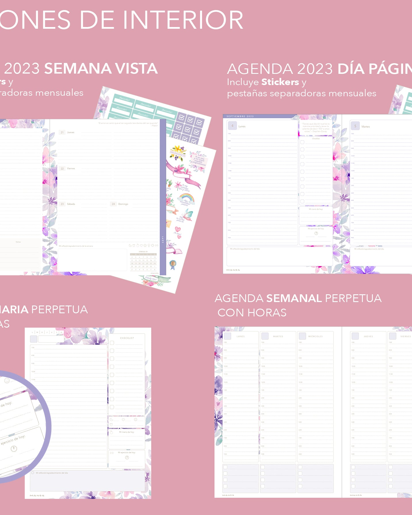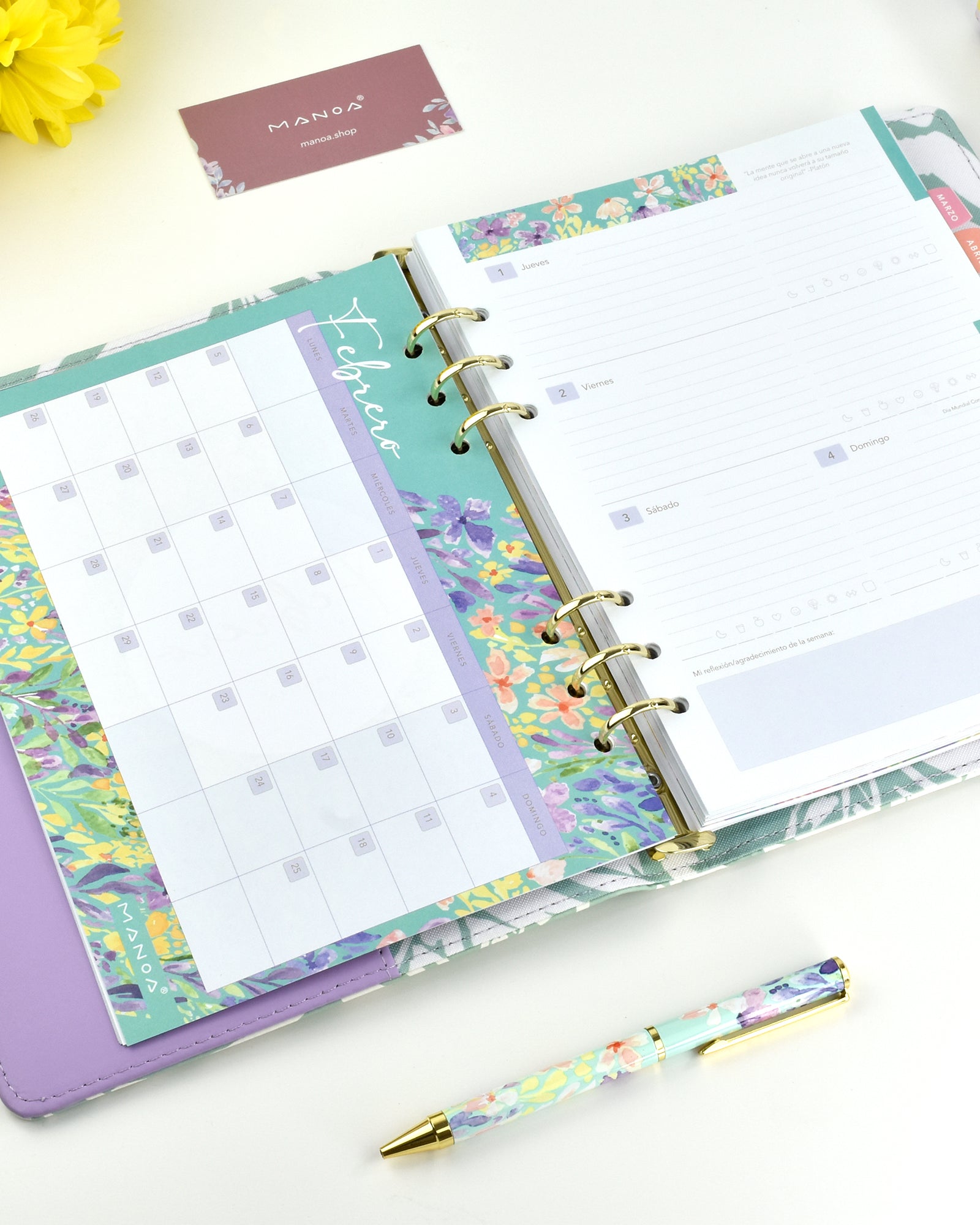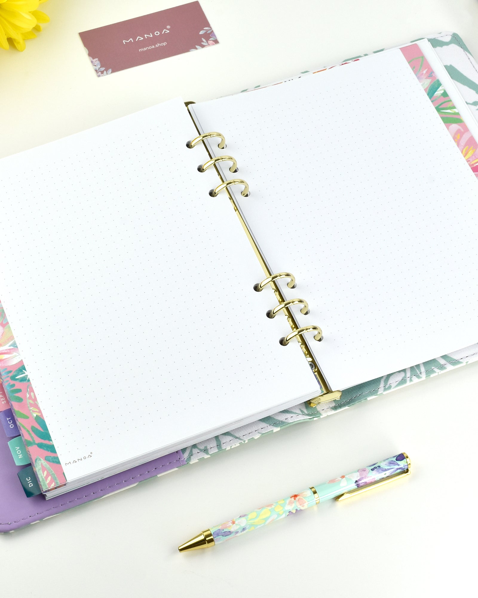- Incluye hojas para Notas de líneas y puntitos (40 páginas), hojas de planificación mensual, control financiero, control de gastos e ingresos para cada mes, planning anual en columnas, página de horario, control menstrual, contraseñas y mapa de objetivos.